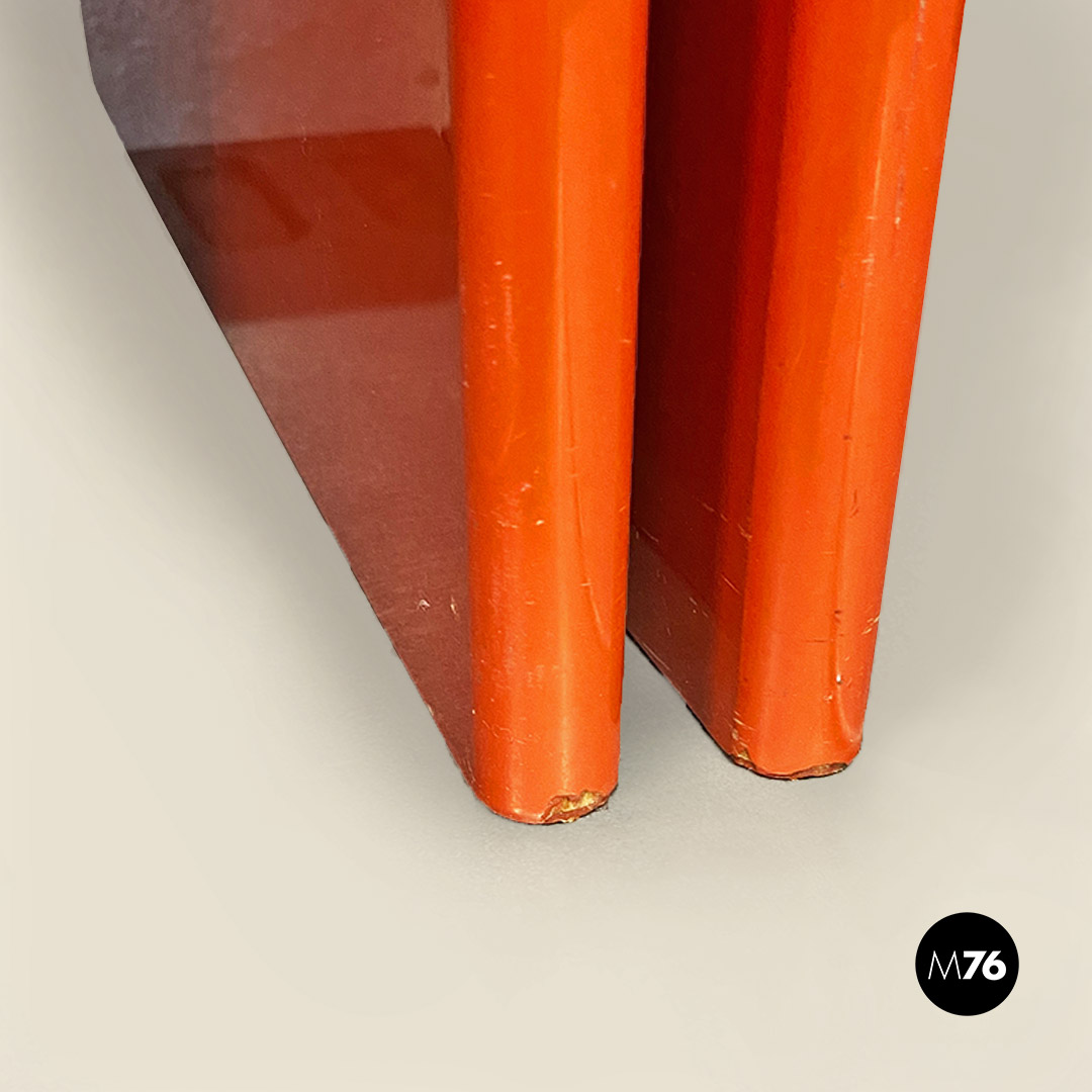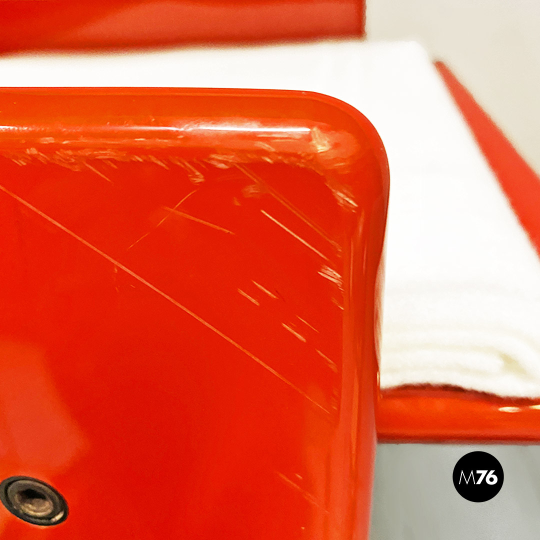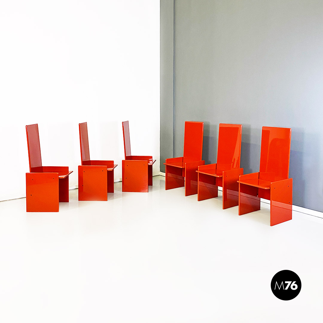 Set di sei sedie modello Kazuki con struttura interamente in legno laccato color rosso arancione, dalle linee geometriche, con finitura lucida ed angoli stondati. Provviste dei loro cuscini morbidi in feltro bianco.
