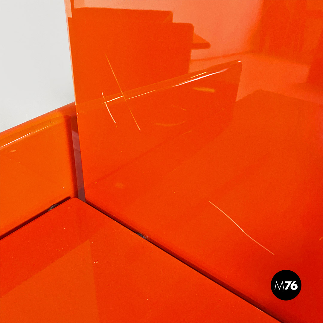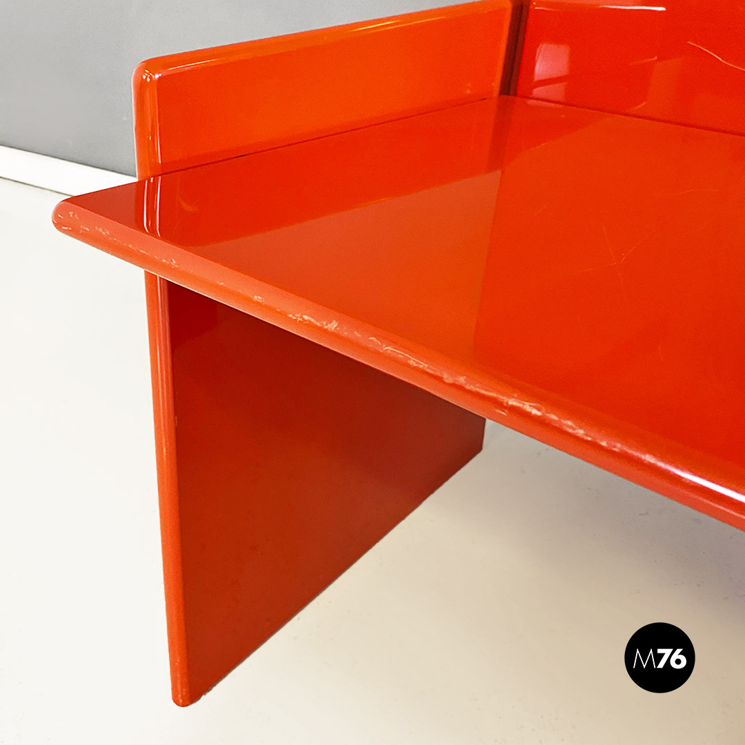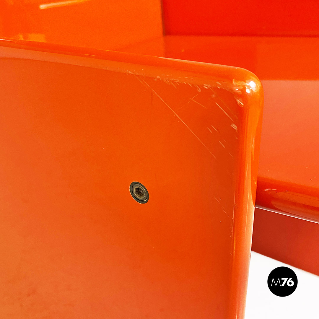 Set di sei sedie modello Kazuki con struttura interamente in legno laccato color rosso arancione, dalle linee geometriche, con finitura lucida ed angoli stondati. Provviste dei loro cuscini morbidi in feltro bianco.