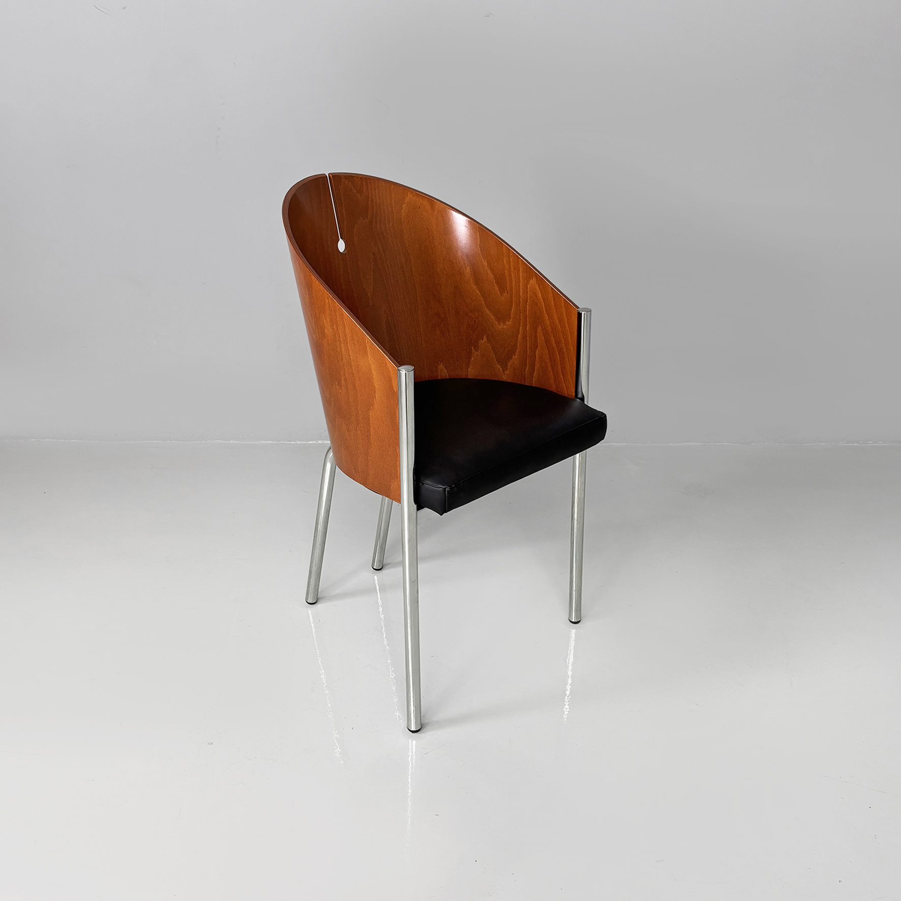 Coppia di sedie a pozzetto modello King Costes con struttura composta da zampe in tubolare di acciaio cromato, con scocca in legno multi strato curvato e seduta in similpelle nera.