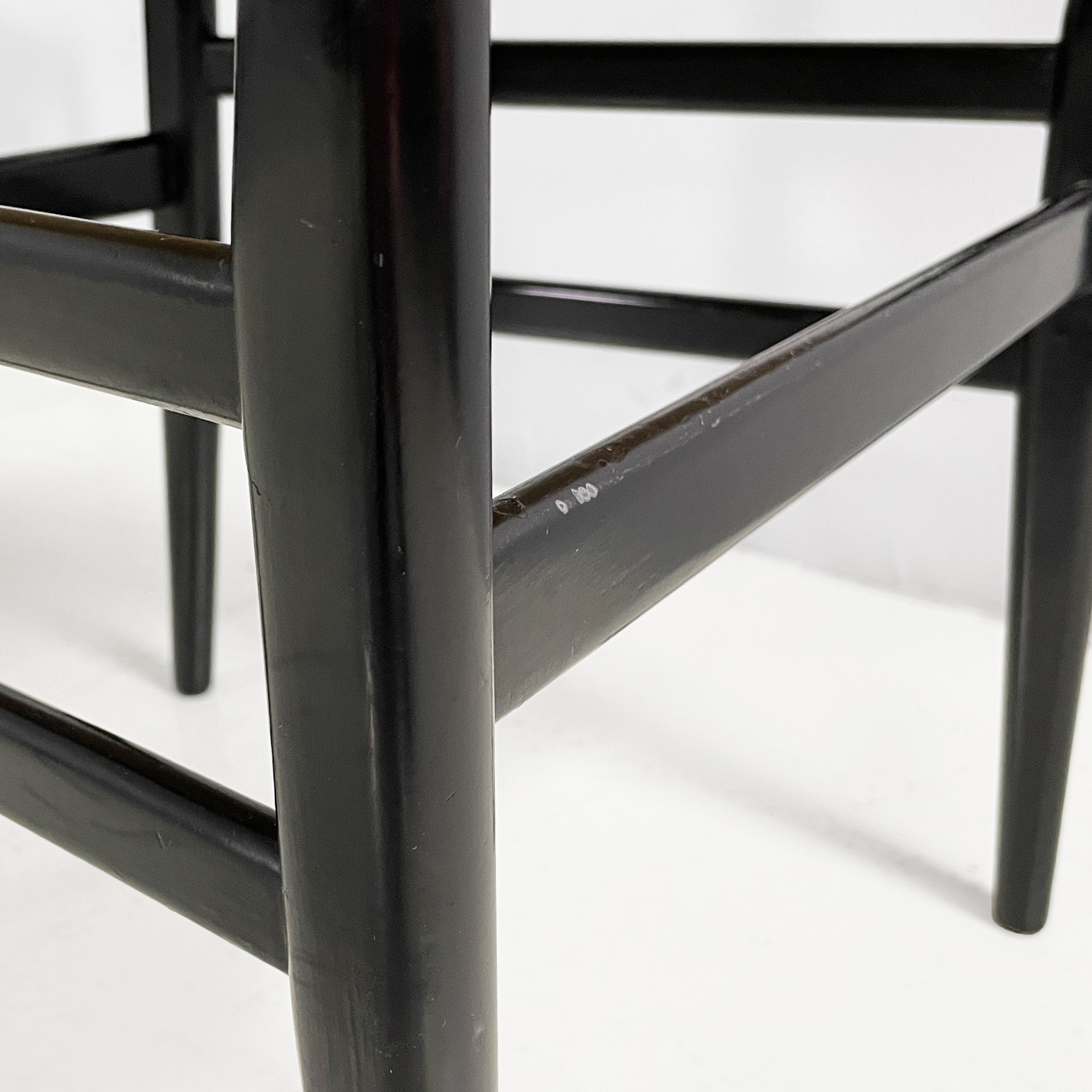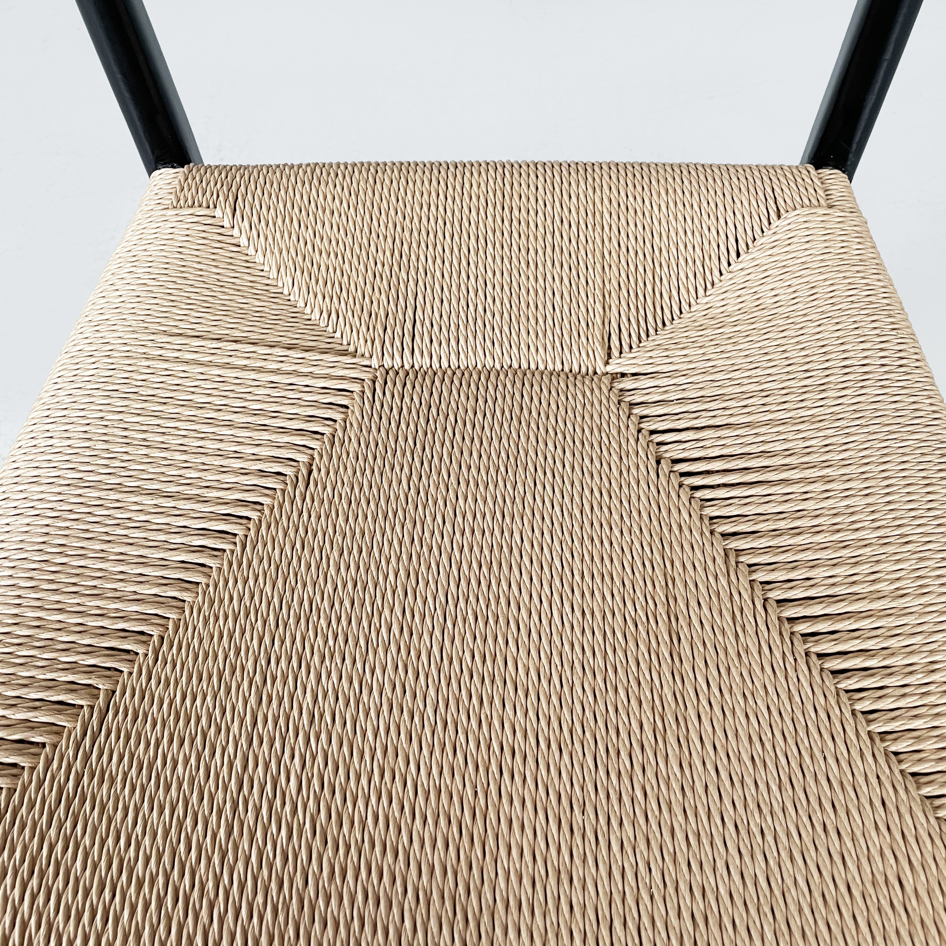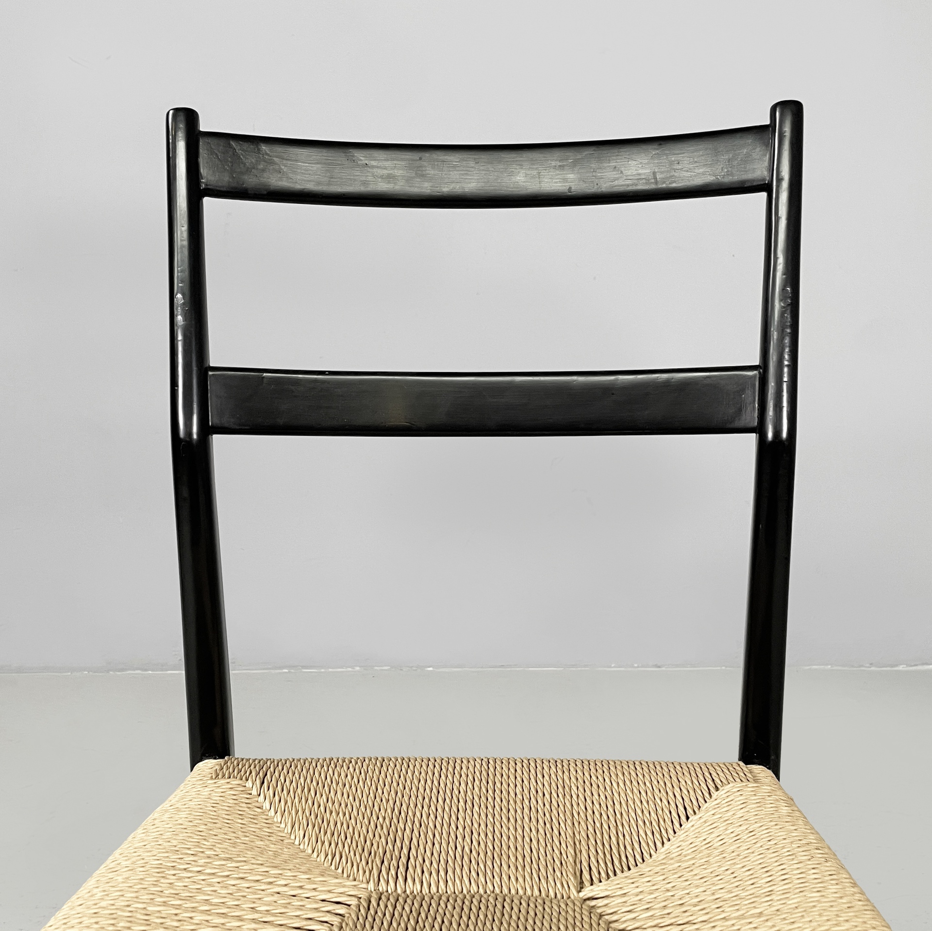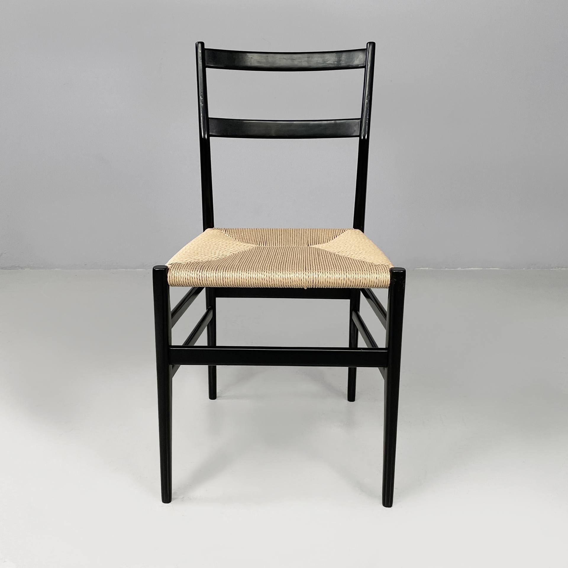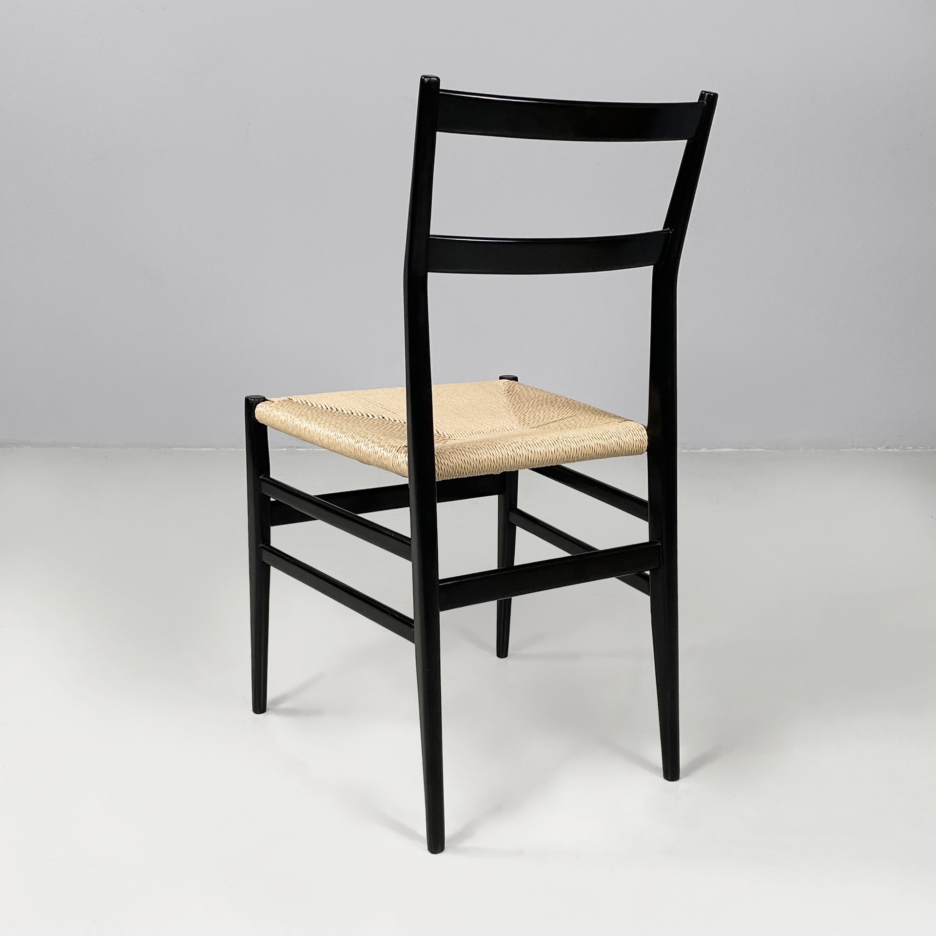Set di dieci sedie modello Leggera con seduta squadrata in paglia. La struttura a sezione tonda e lo schienale a listelli curvati sono in legno verniciato nero. Le zampe a sezione tonda in legno nero sono unite da listelli, anche essi in legno verniciato nero.