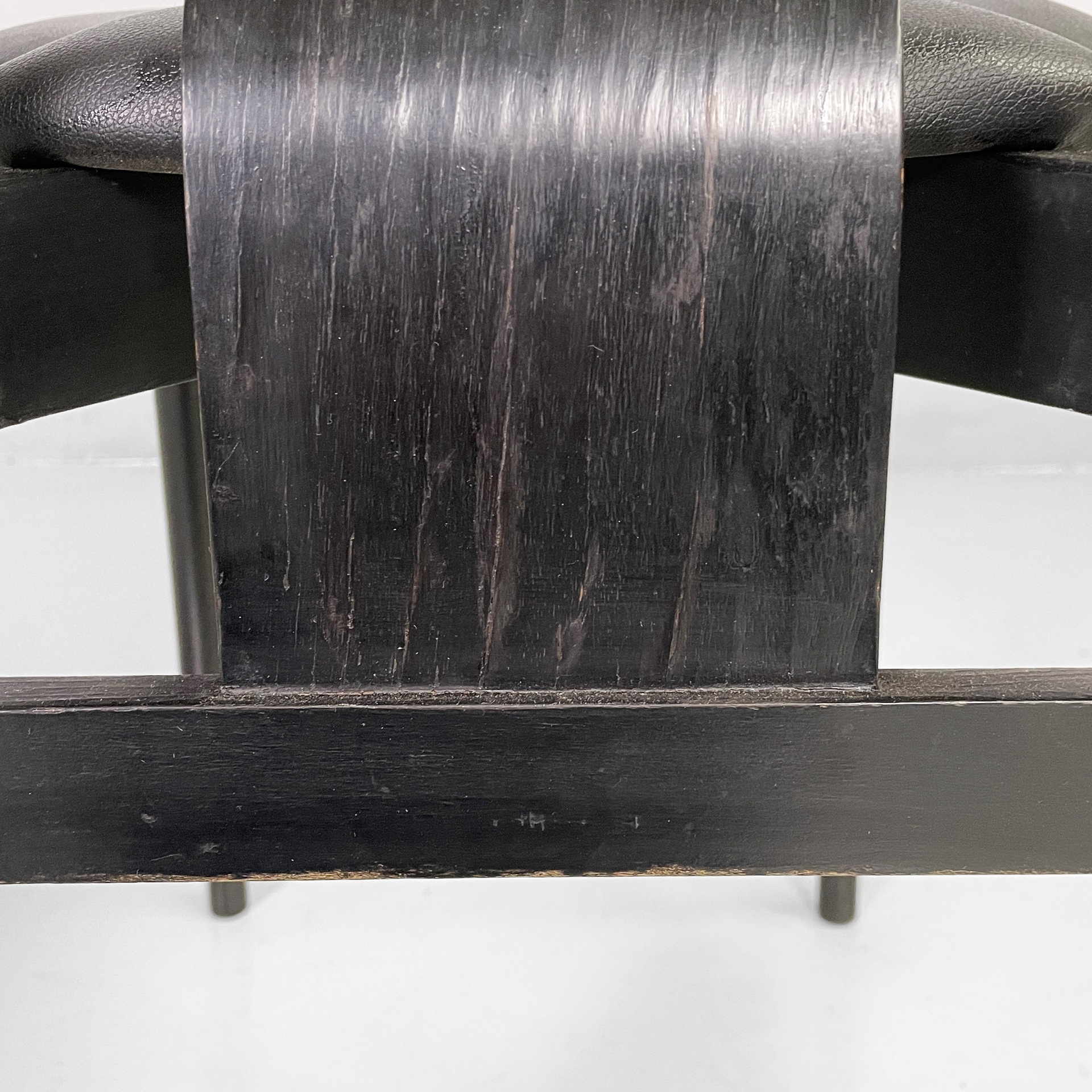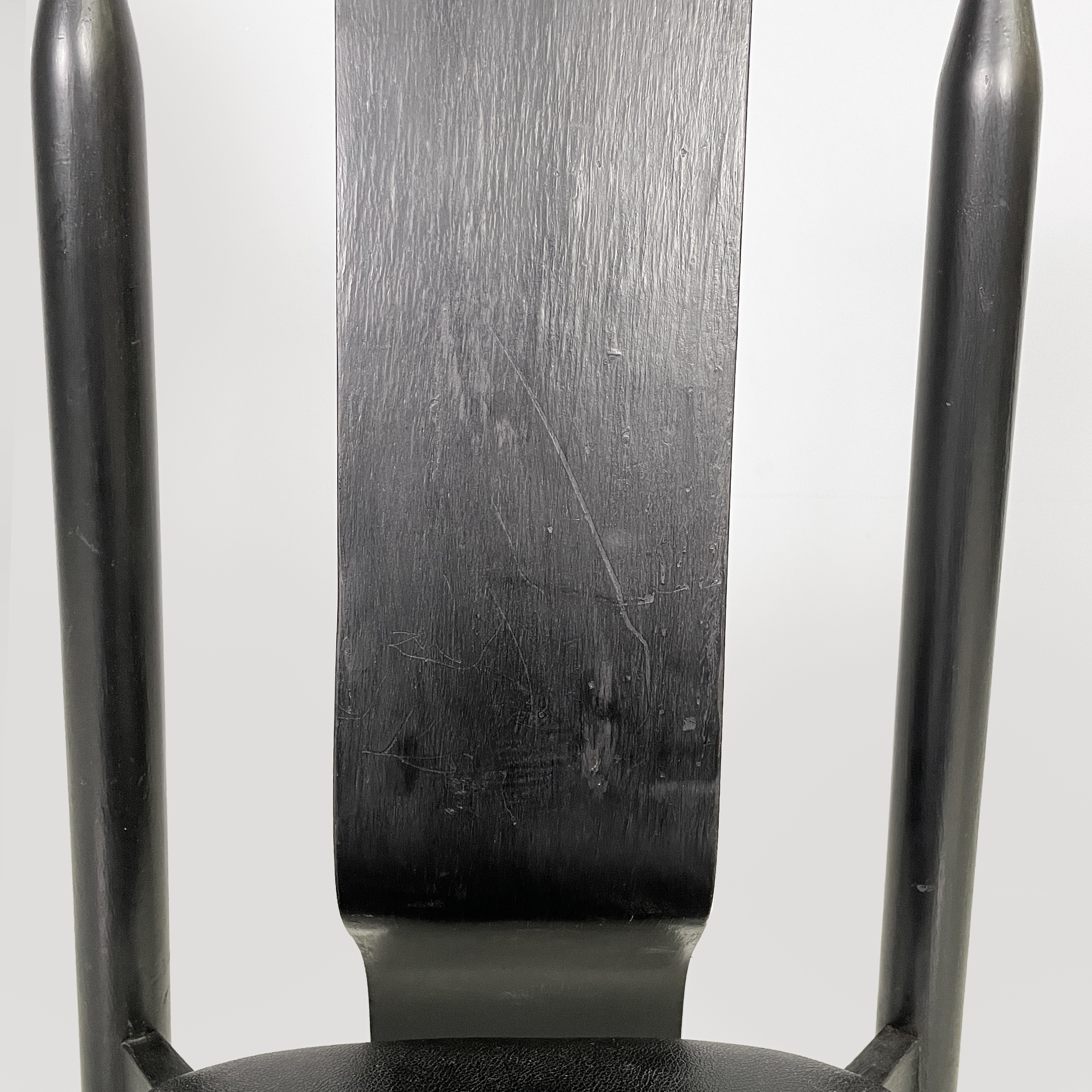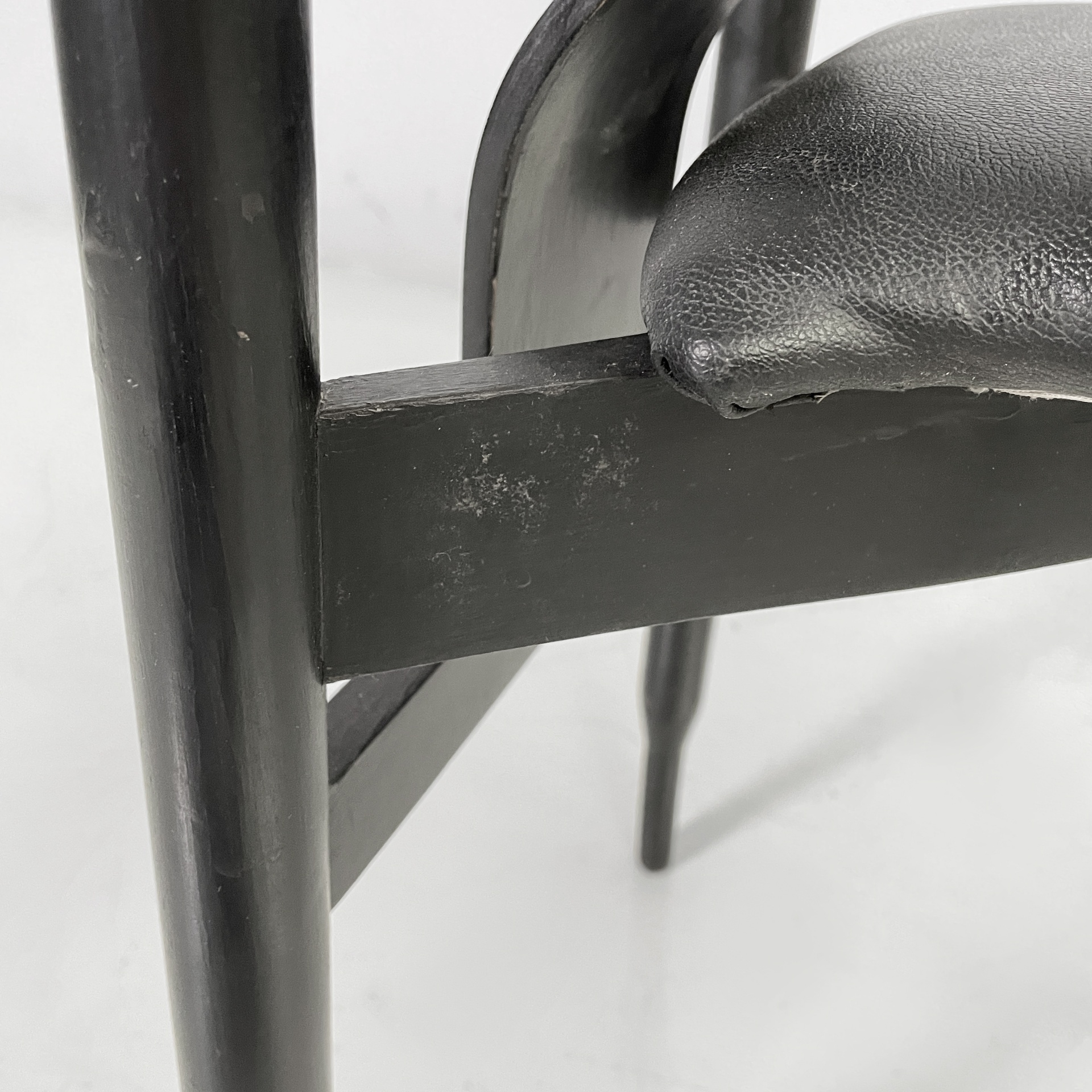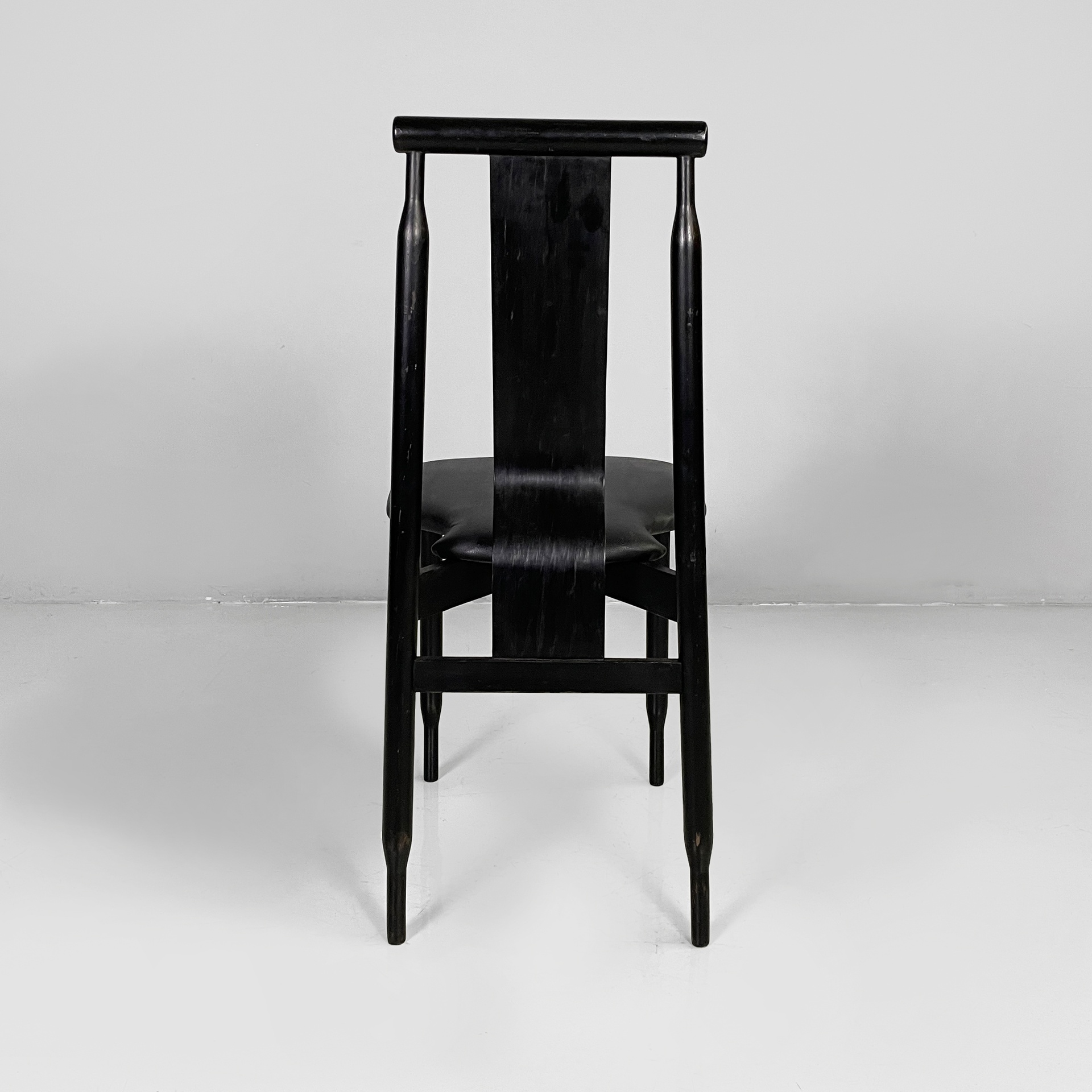 Coppia di sedie modello Lierna con seduta sagomata in pelle nera. Lo schienale in legno verniciato nero è composto da una parte curvata e tre listelli a sezione tonda. Le zampe in legno verniciato nero sono a sezione tonda.