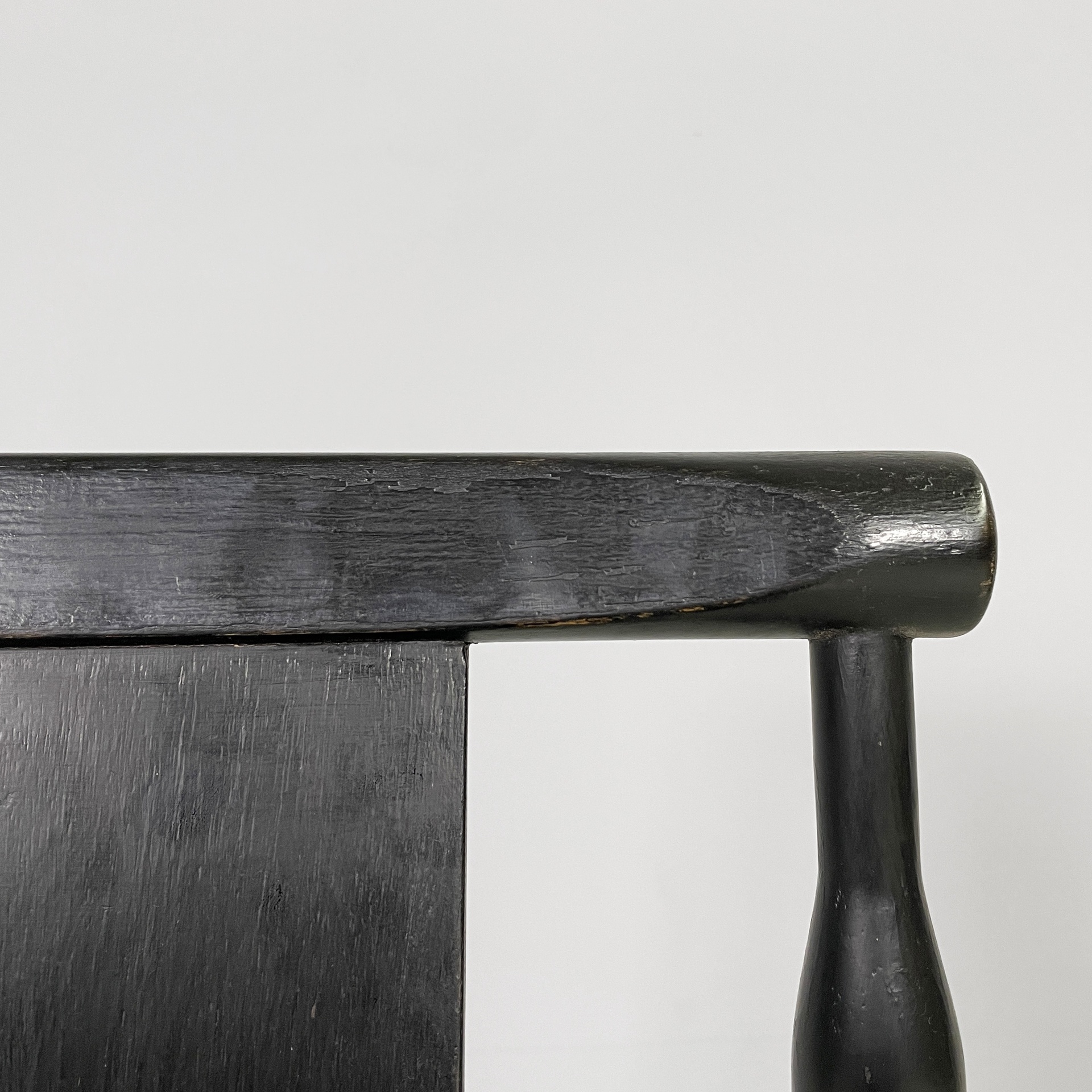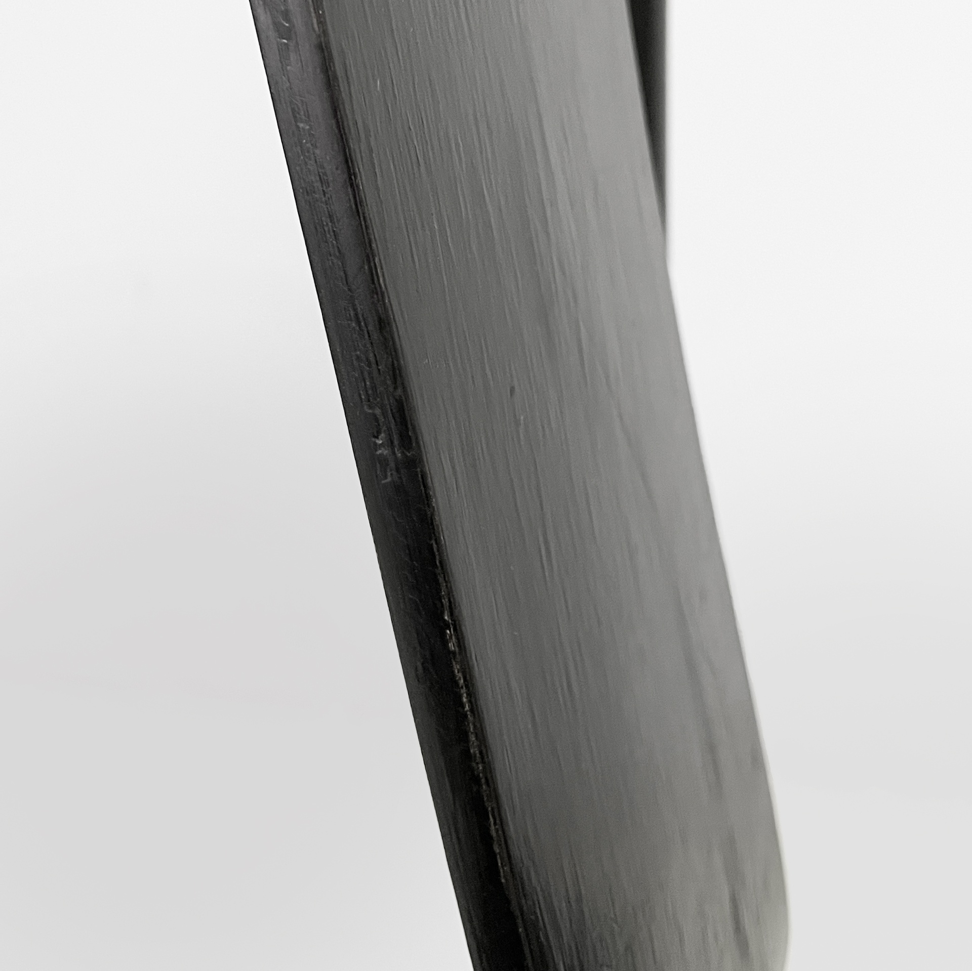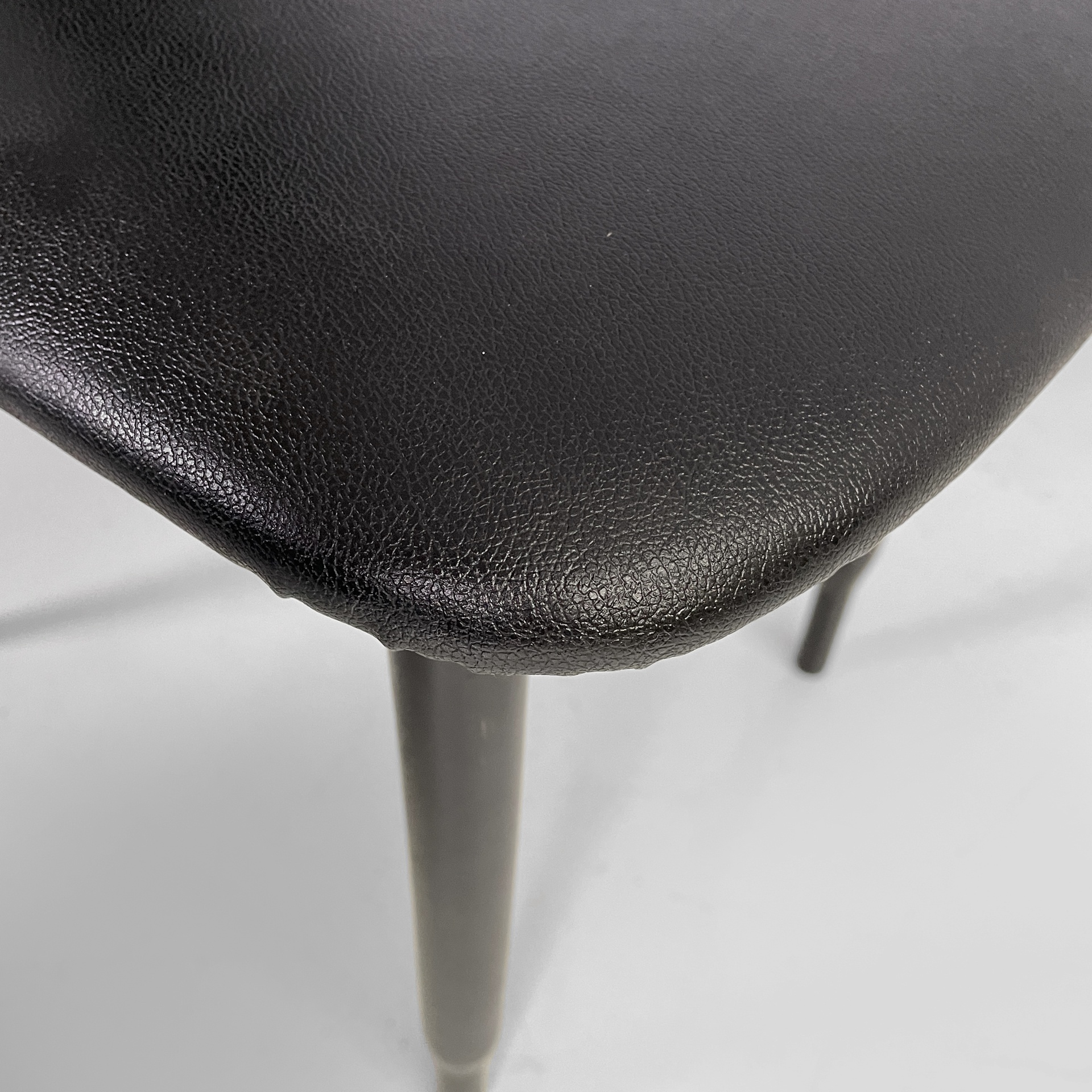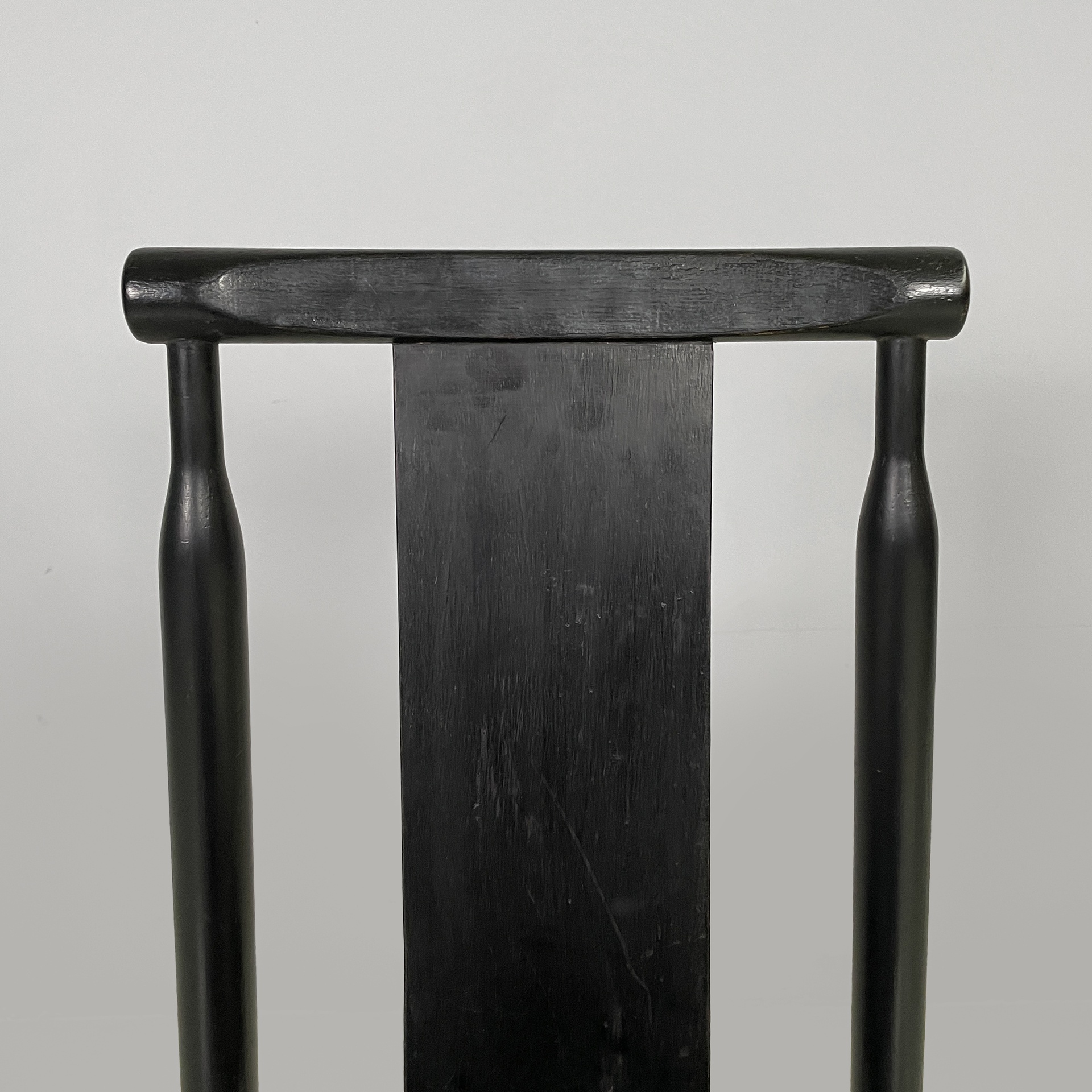 Coppia di sedie modello Lierna con seduta sagomata in pelle nera. Lo schienale in legno verniciato nero è composto da una parte curvata e tre listelli a sezione tonda. Le zampe in legno verniciato nero sono a sezione tonda.