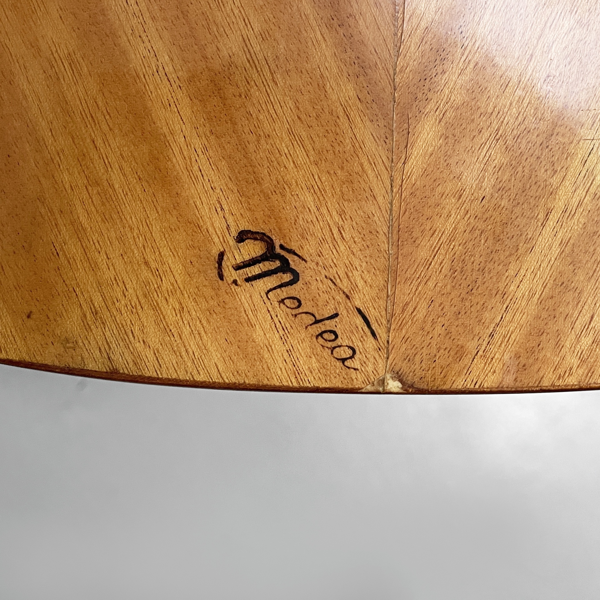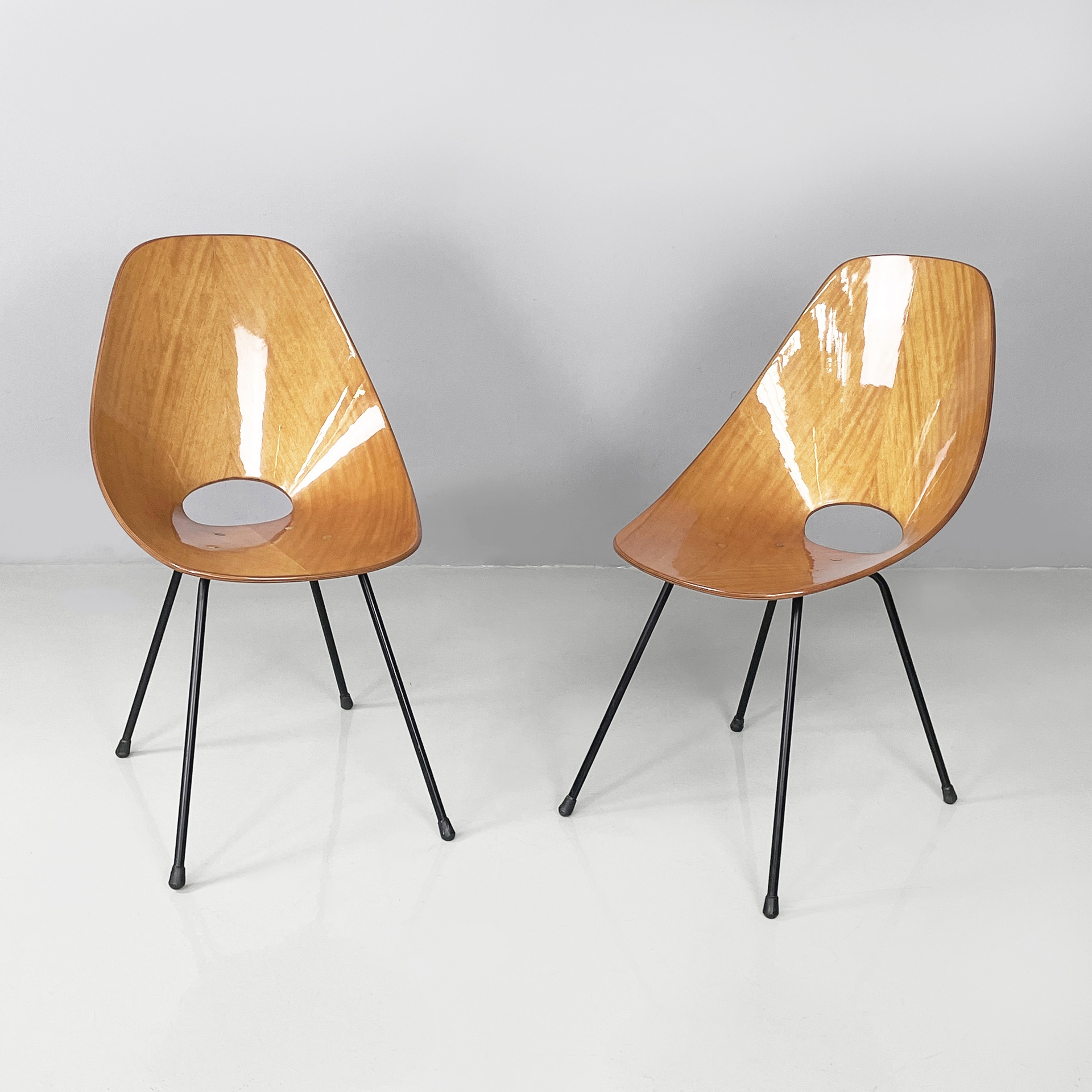 Coppia di sedie modello Medea con seduta e schienale in legno chiaro curvato con finitura lucida. Tra la seduta e lo schienale è presente un foro decorativo. Le zampe sono in tondino di metallo verniciato nero con piedini neri.