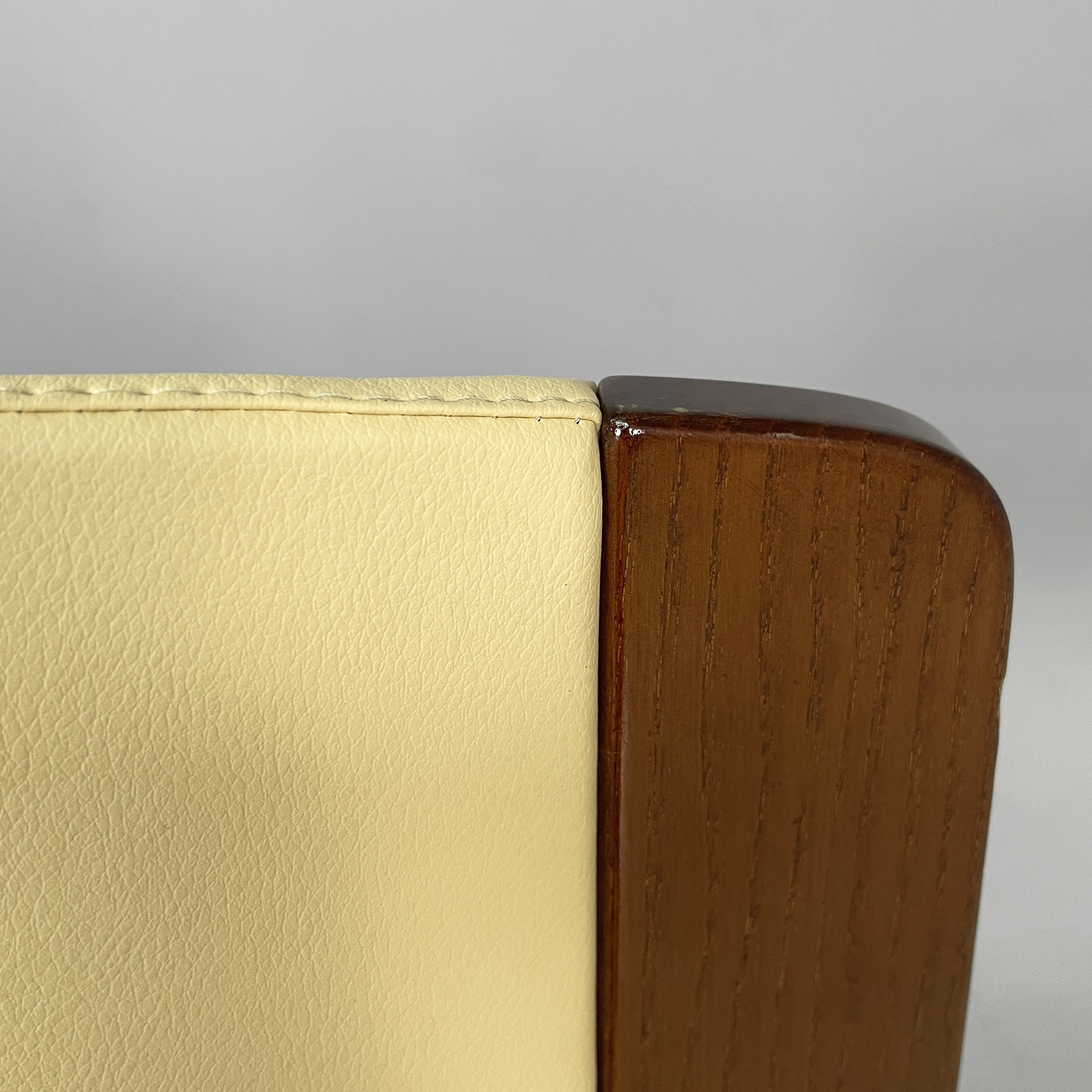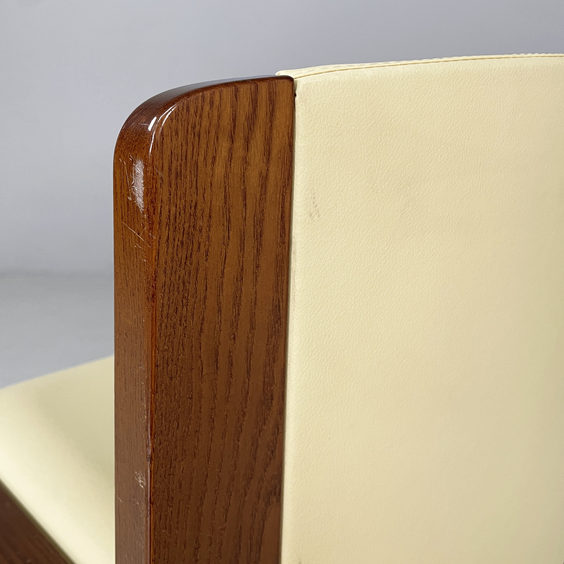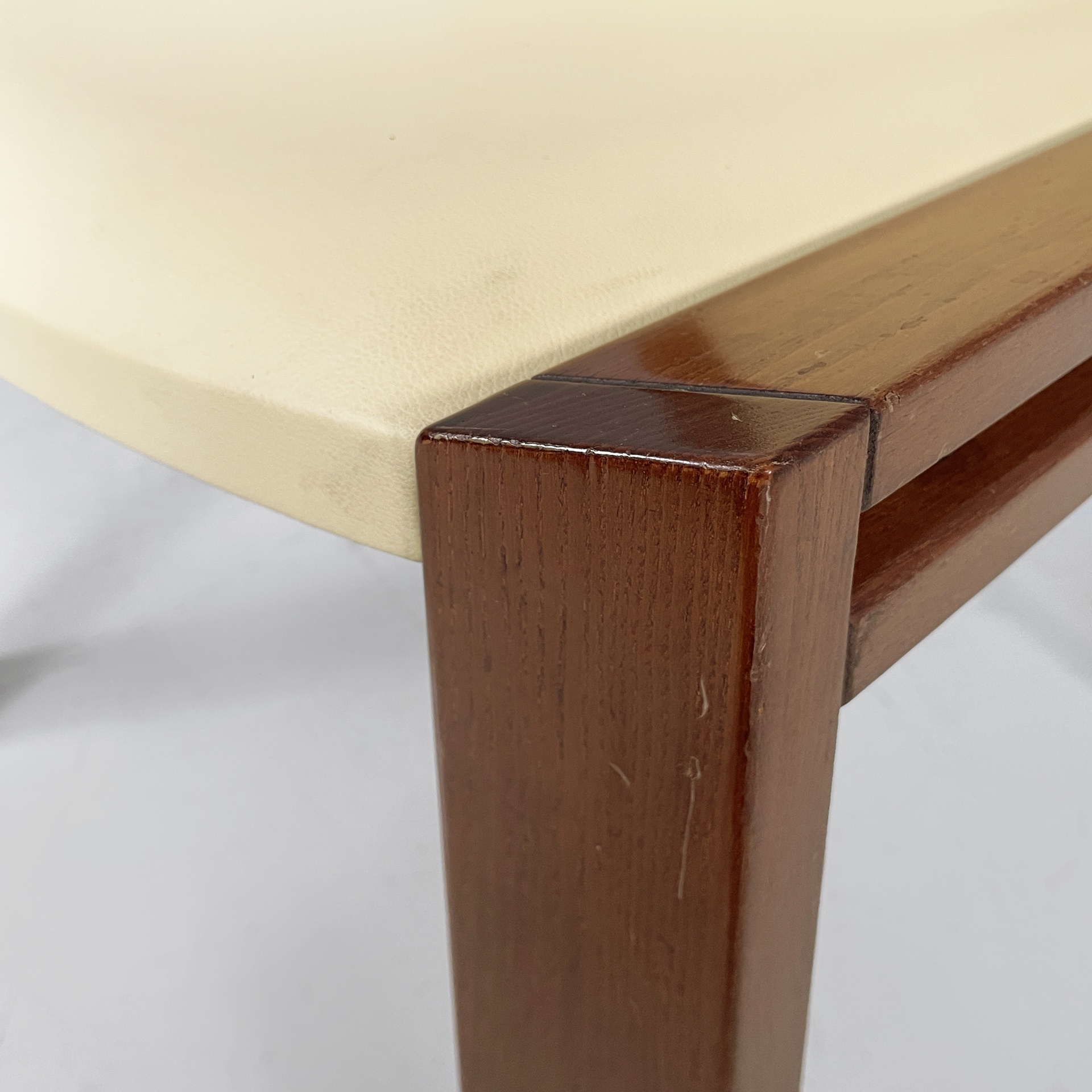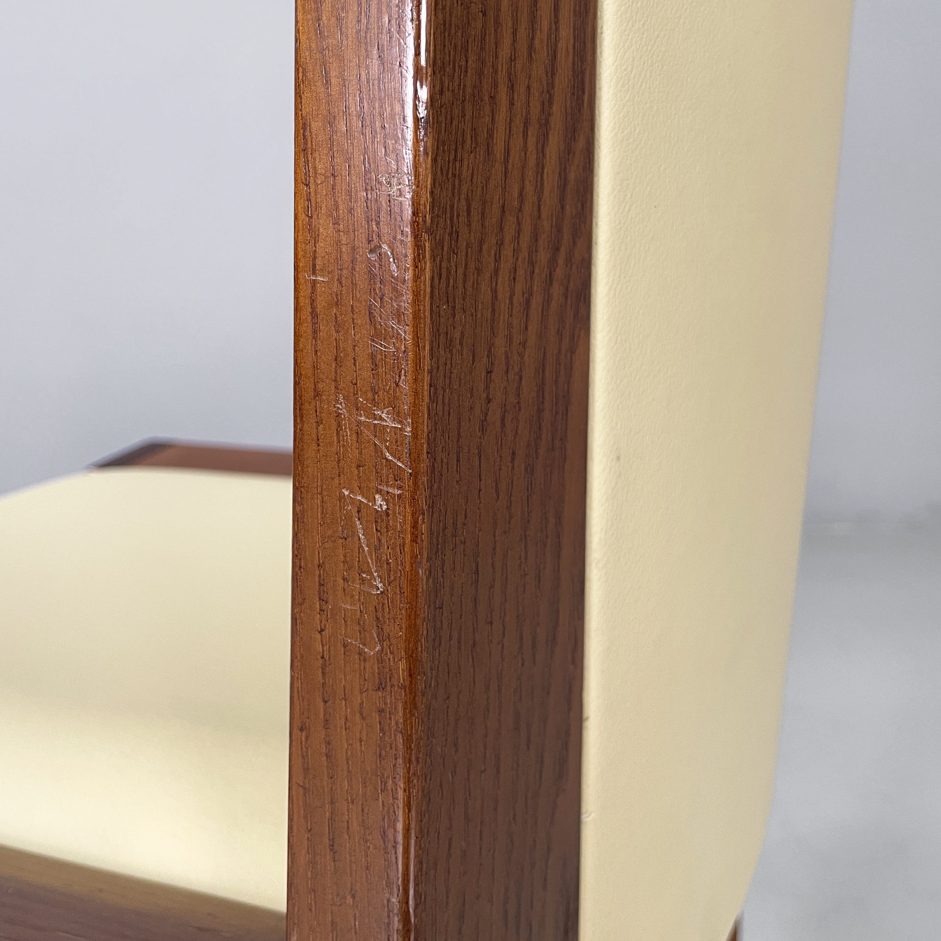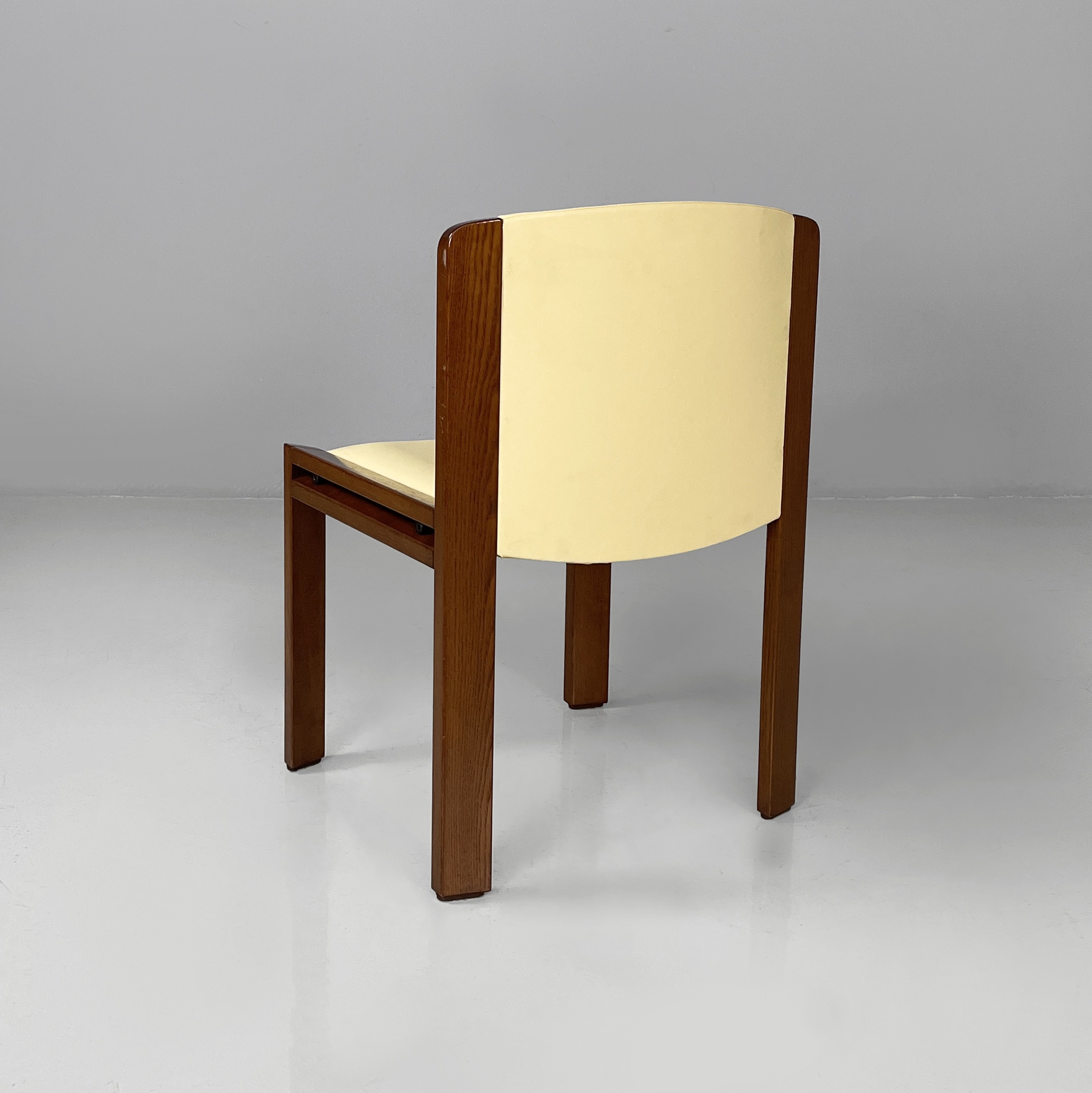 Set di sei sedie modello 300 con seduta e schienale squadrati, imbottiti e rivestiti in sky giallo-beige e profili in legno. Le zampe a listello sono in legno.