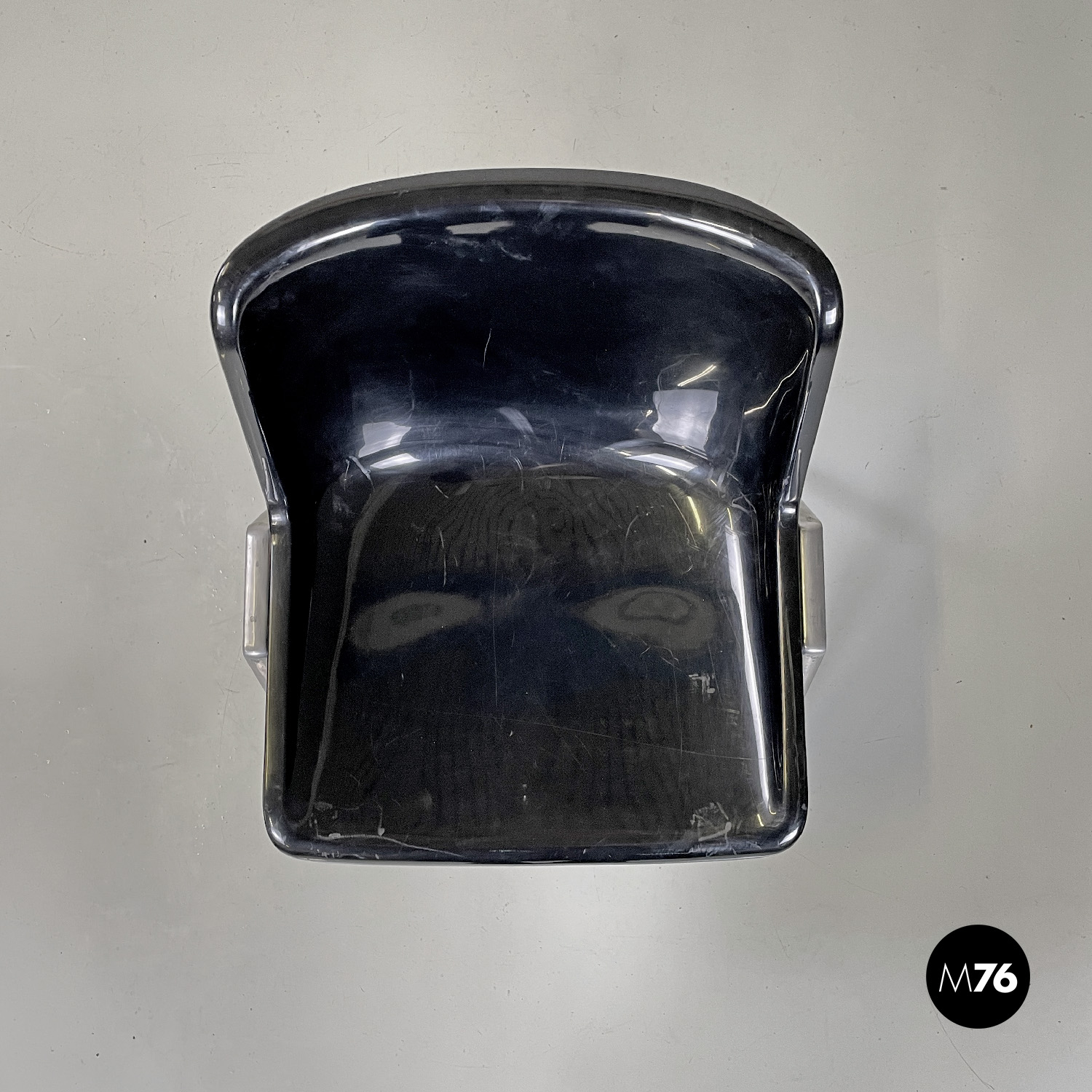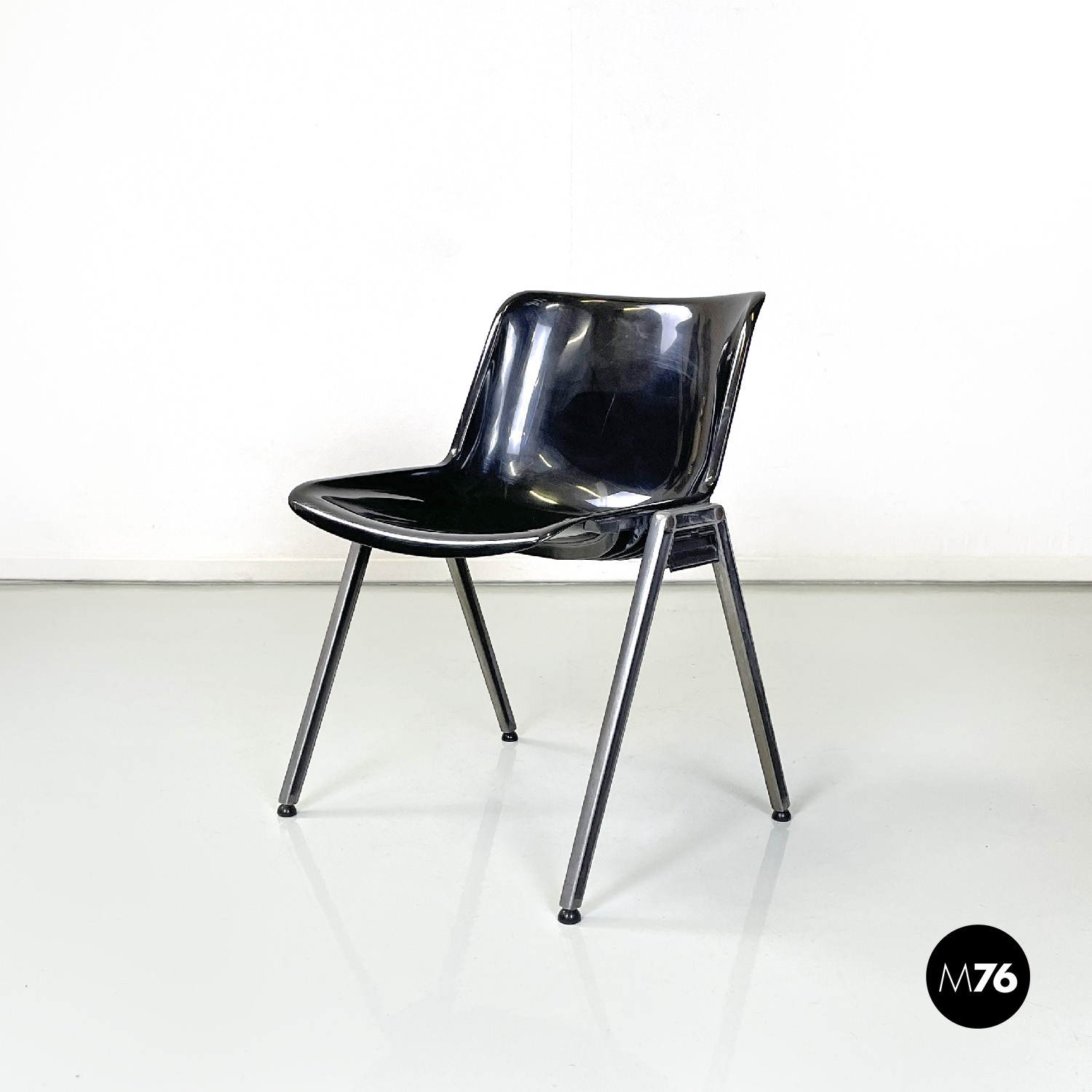 Set di otto sedie modello Modus SM 203 con seduta e schienale composti da una monoscocca curvata in plastica nera. Le zampe in alluminio sono squadrate. Piedini tondi in gomma nera. Impilabili.