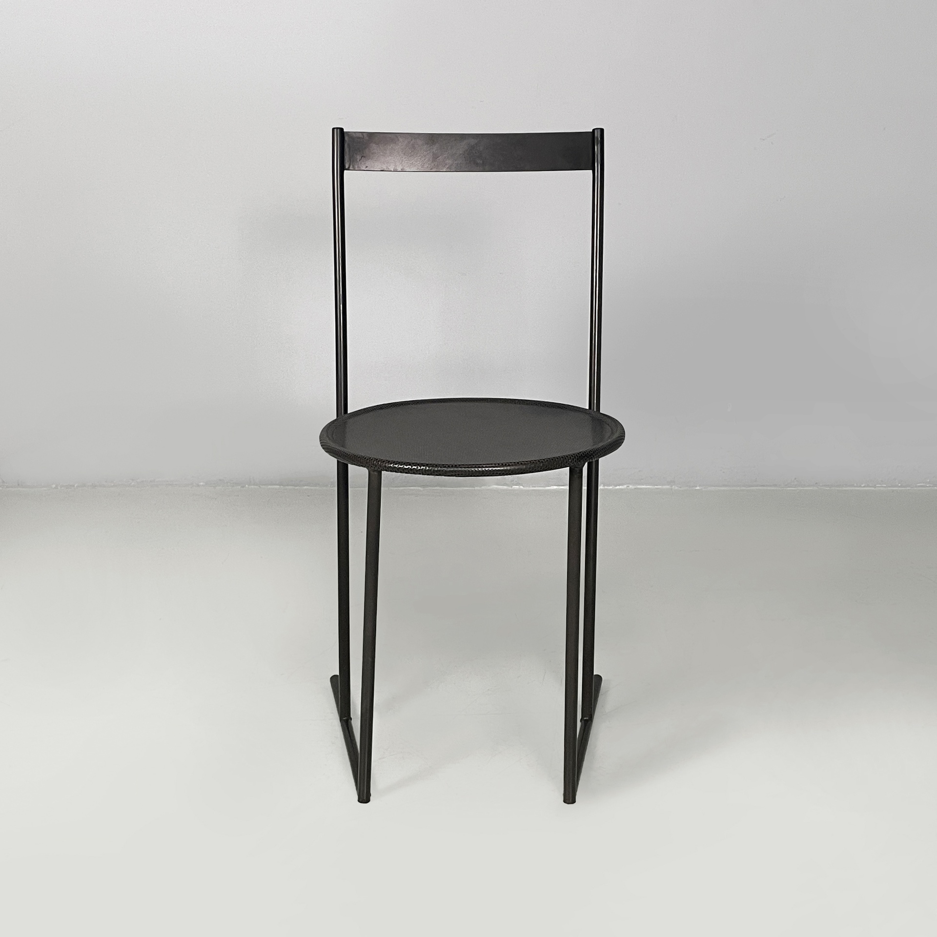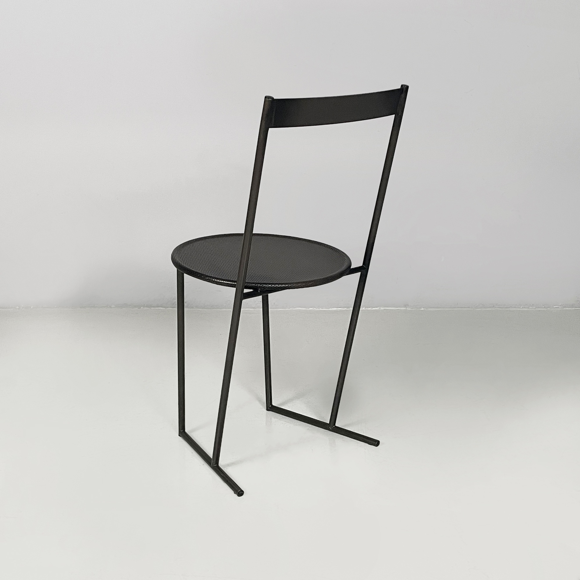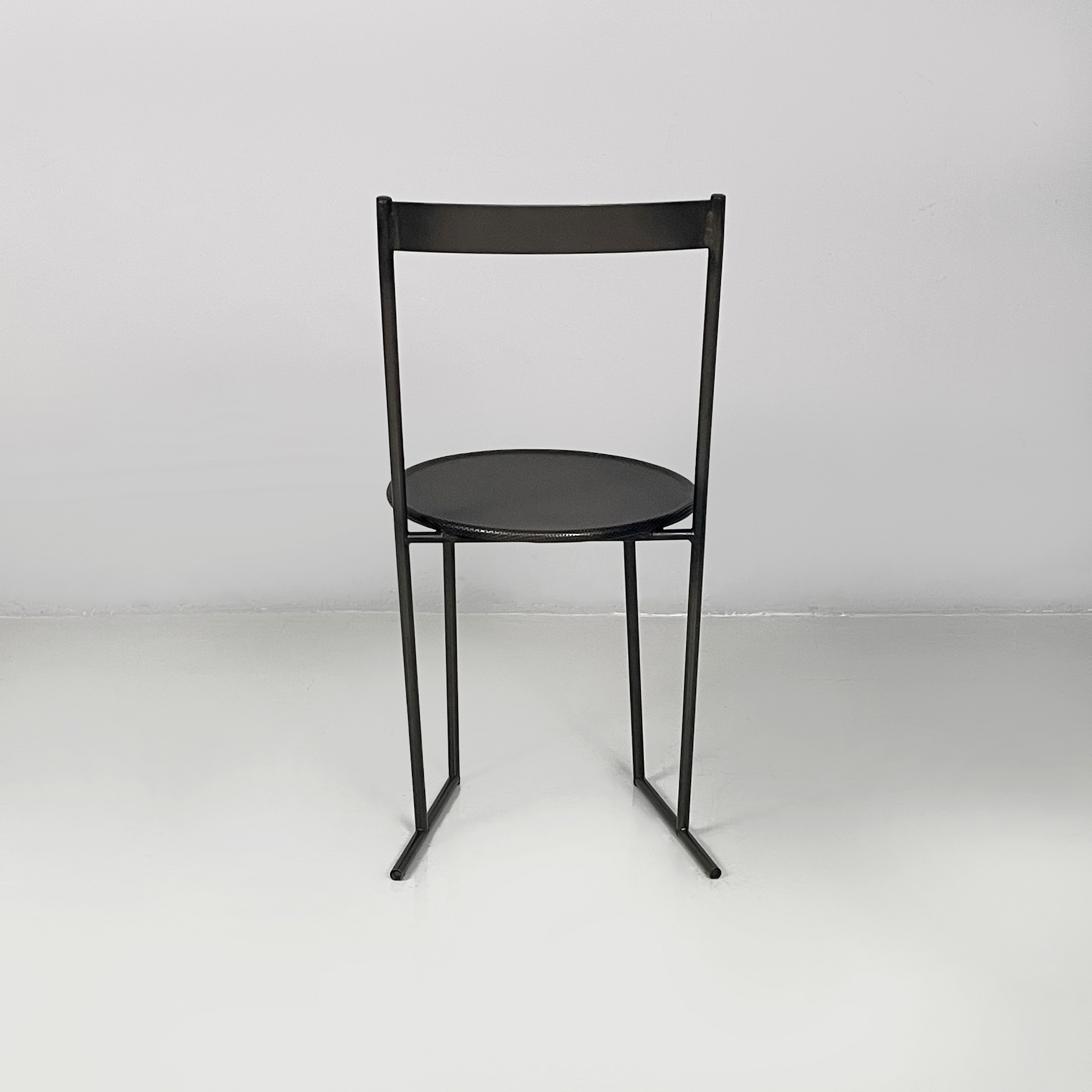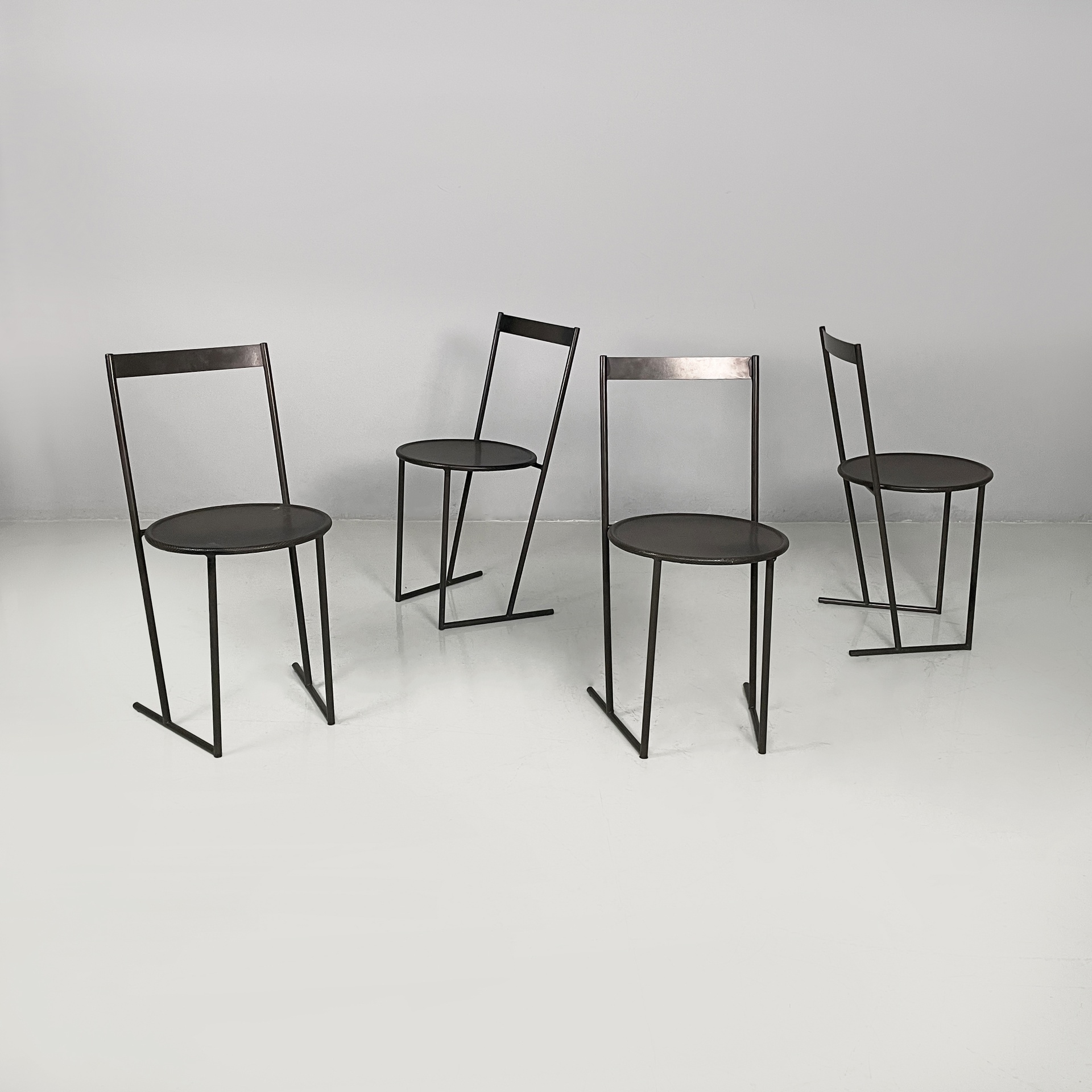 Set di quattro sedie modello Musme interamente in metallo nero. La seduta tonda è in metallo traforato mentre lo schienale è composto da un listello curvato. Struttura e zampe in tondino di metallo.
