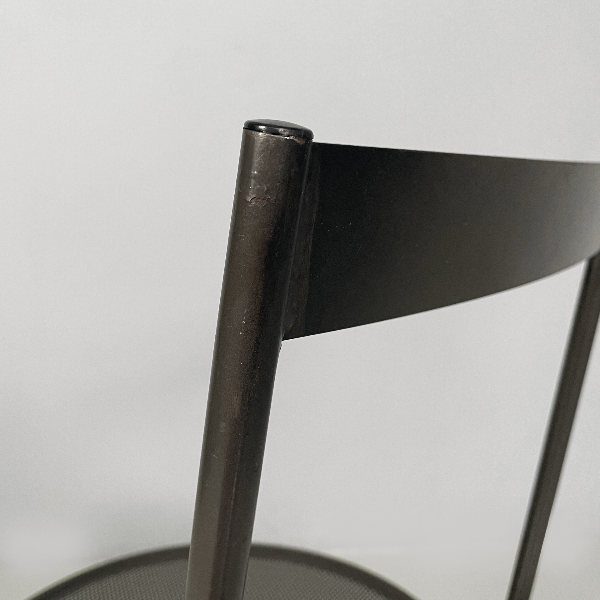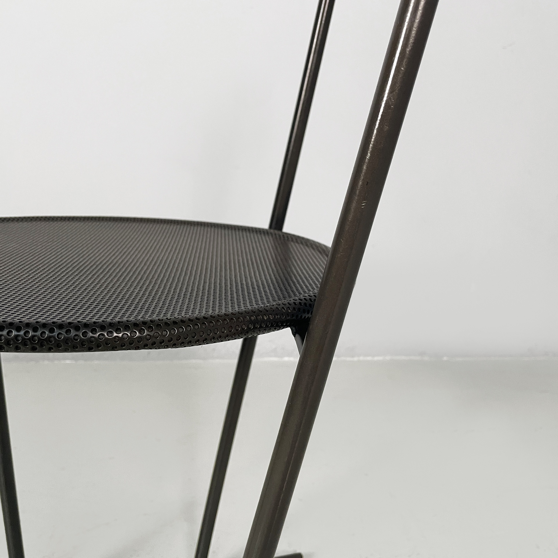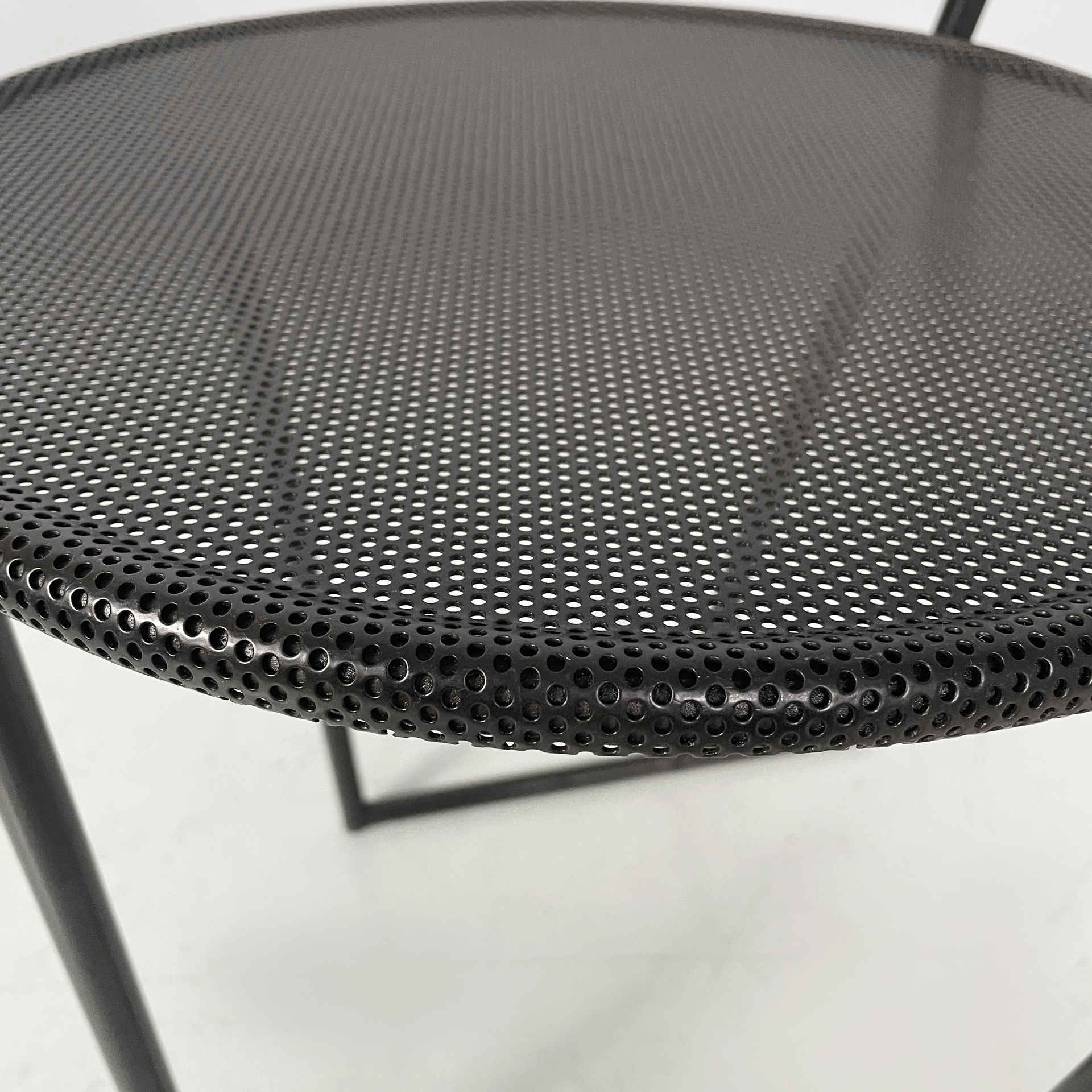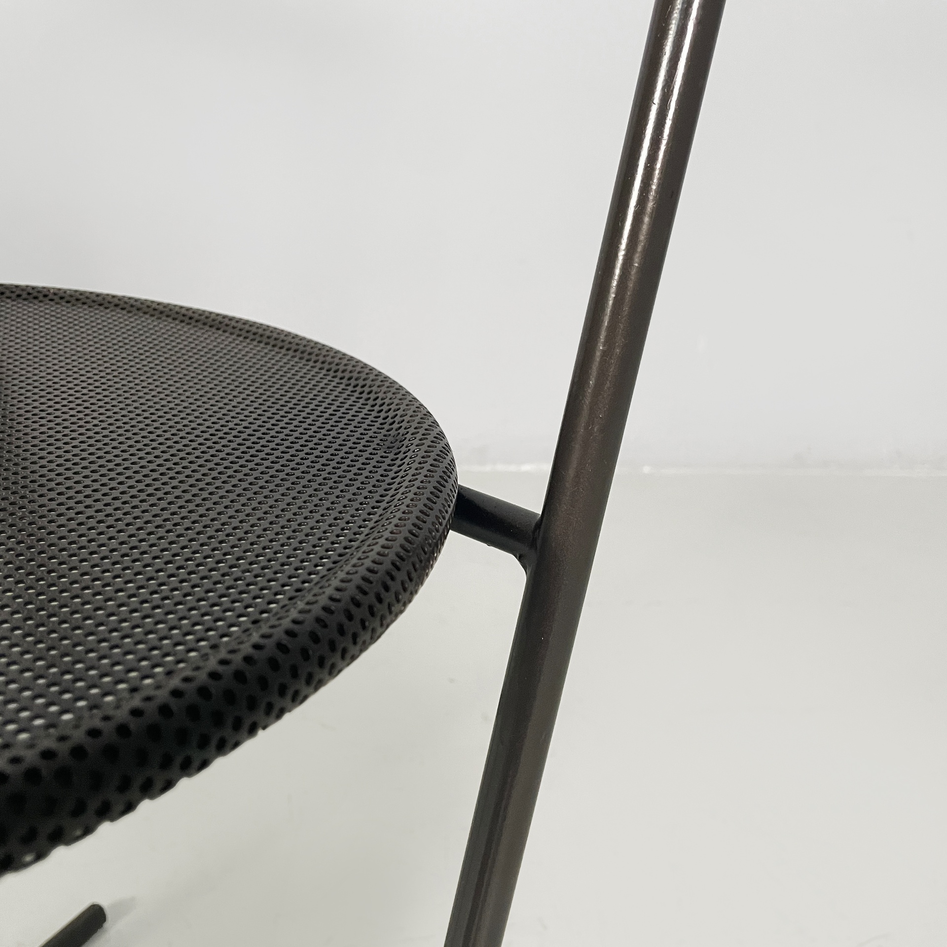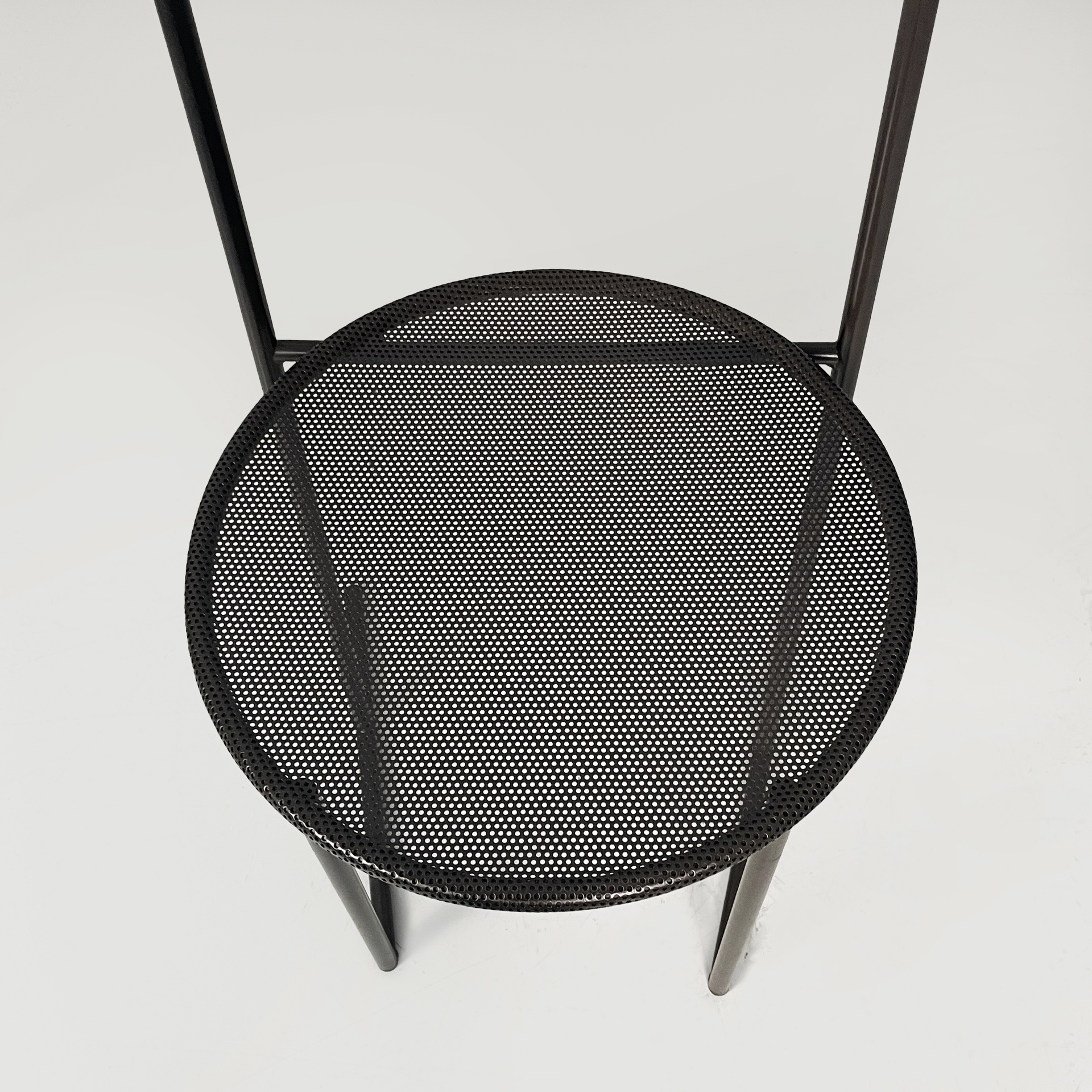 Set di quattro sedie modello Musme interamente in metallo nero. La seduta tonda è in metallo traforato mentre lo schienale è composto da un listello curvato. Struttura e zampe in tondino di metallo.