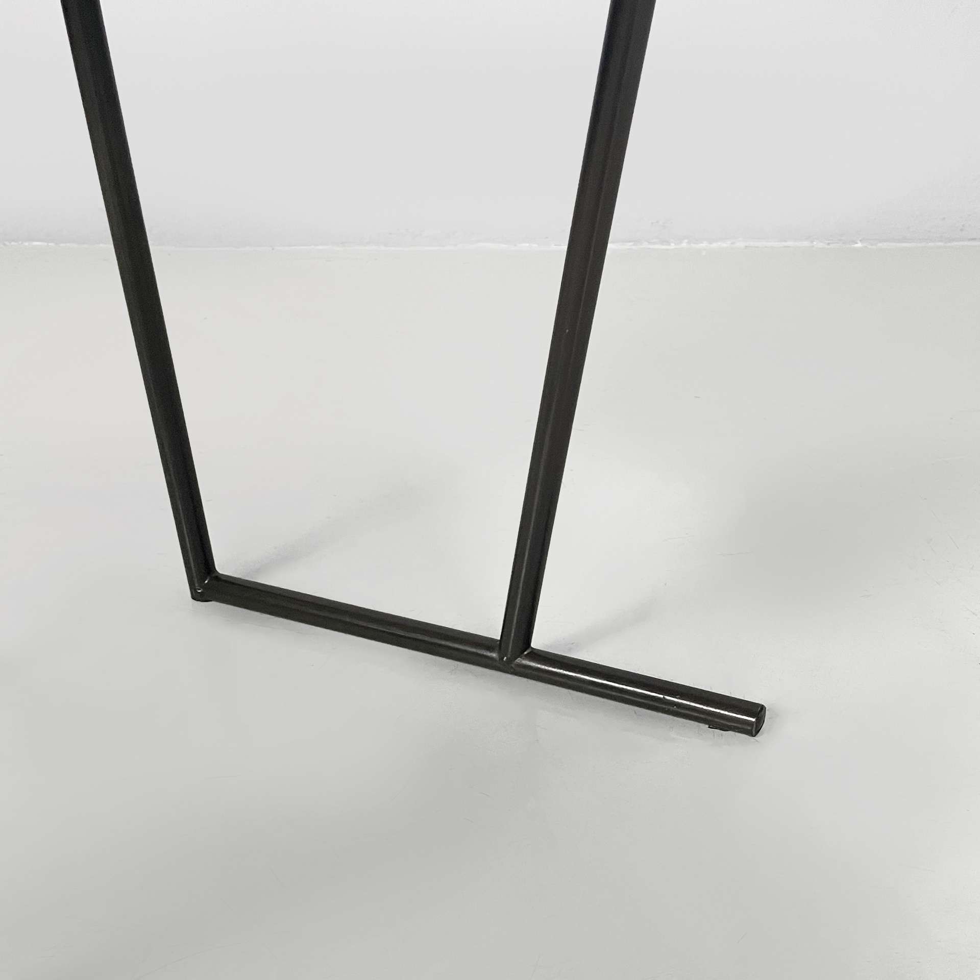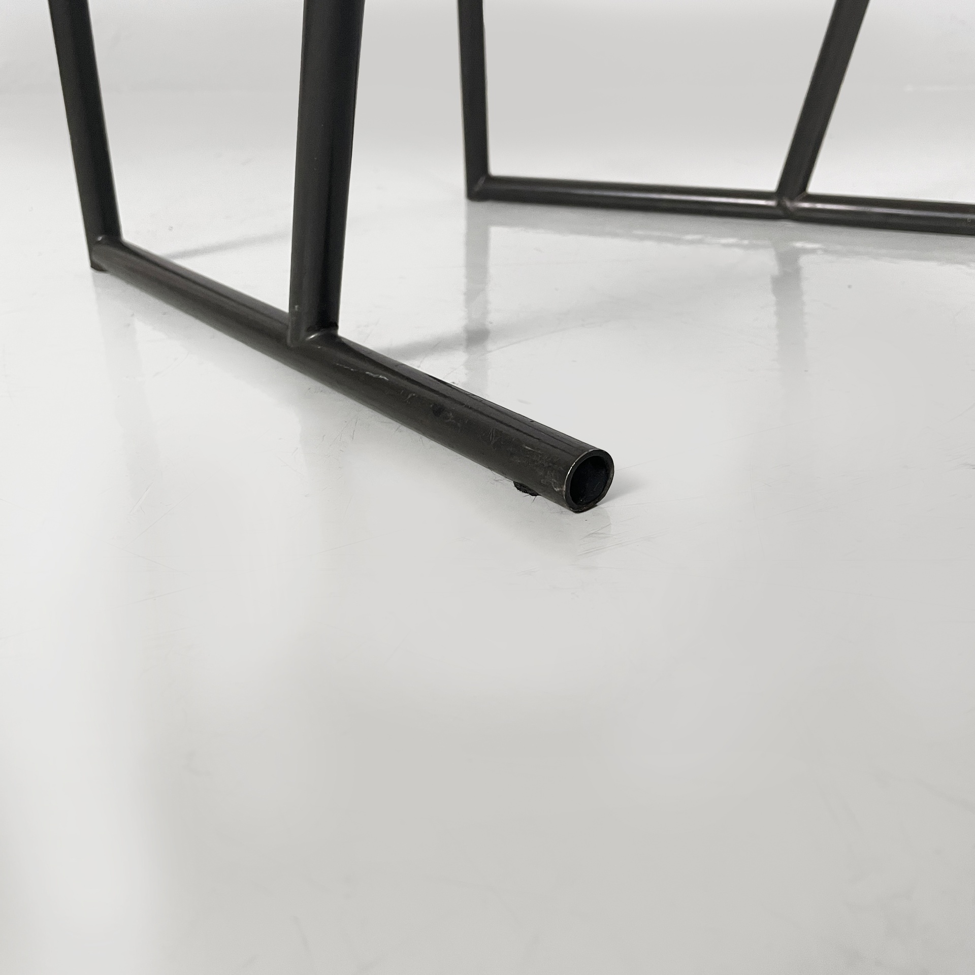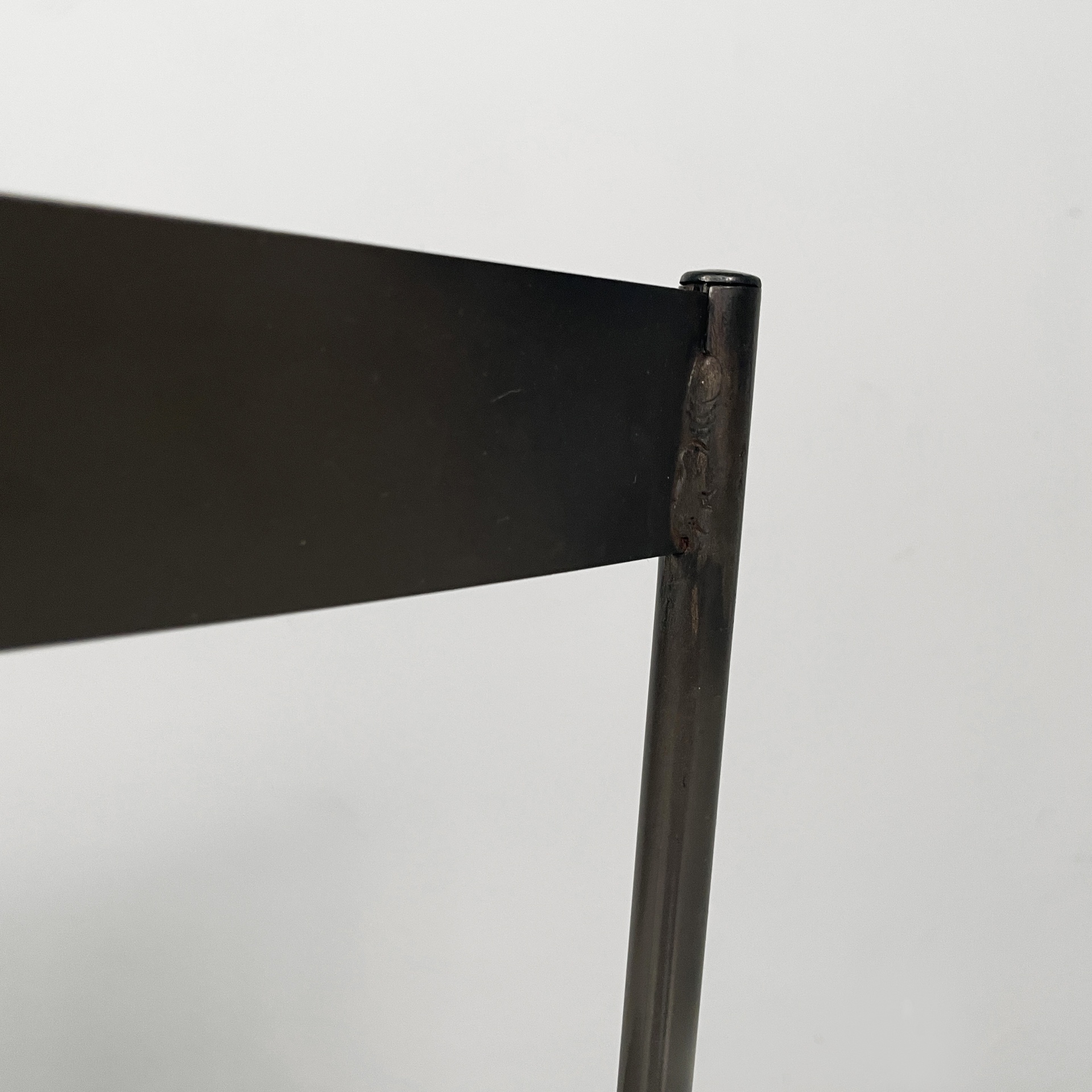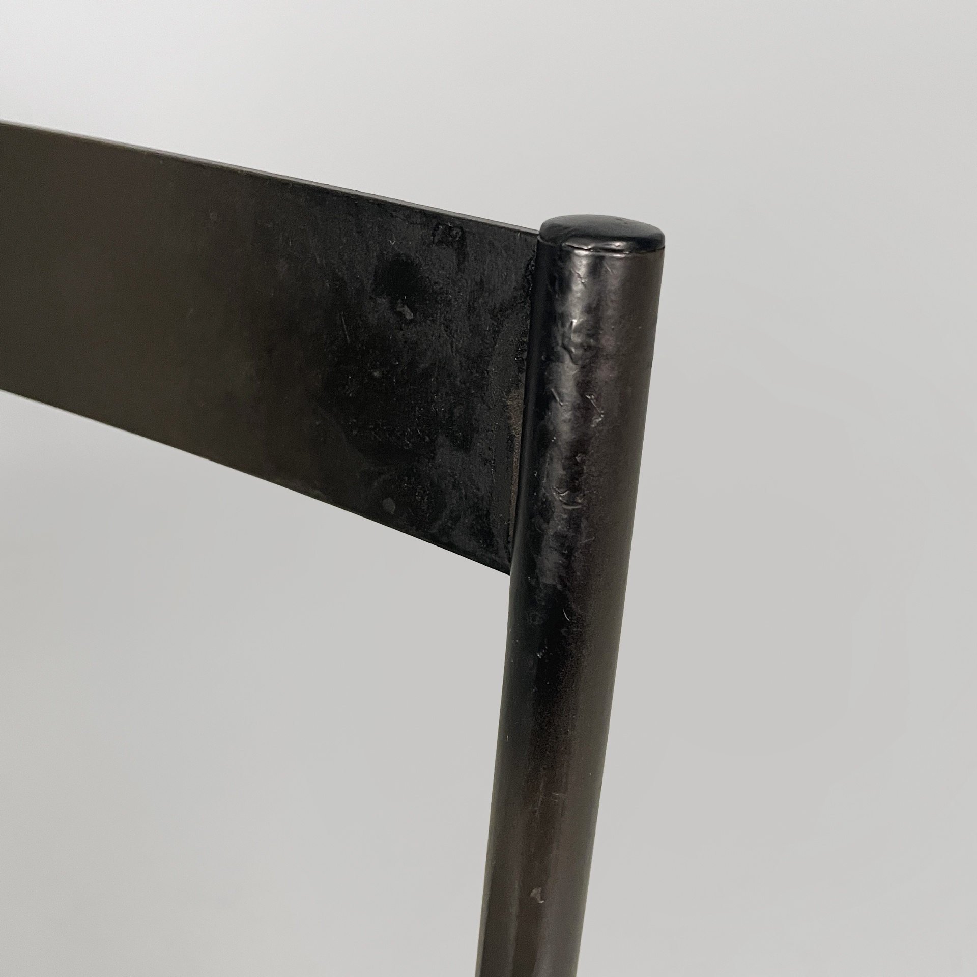 Set di quattro sedie modello Musme interamente in metallo nero. La seduta tonda è in metallo traforato mentre lo schienale è composto da un listello curvato. Struttura e zampe in tondino di metallo.