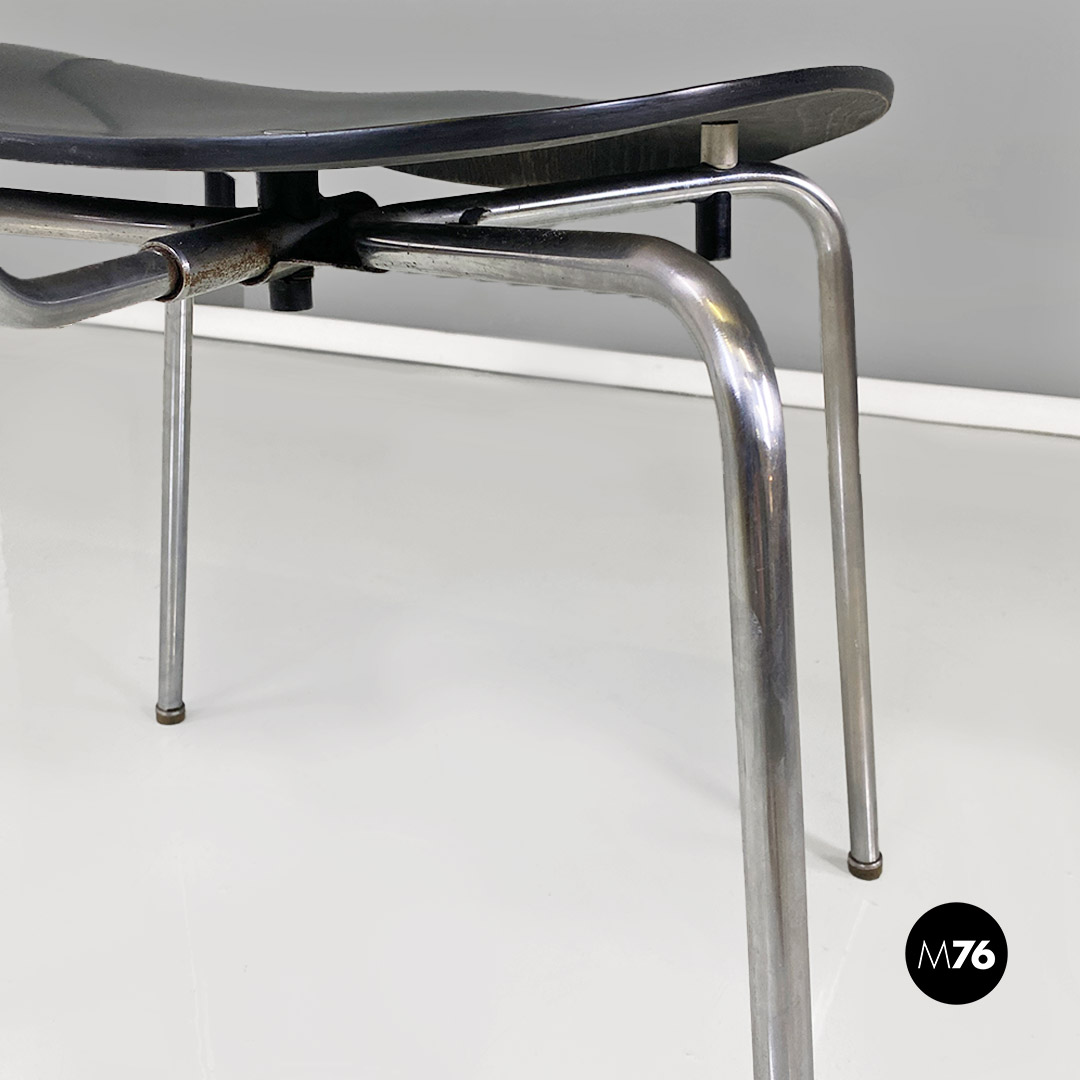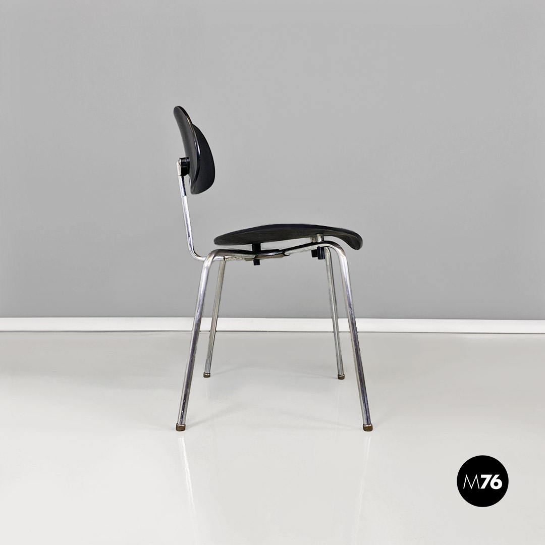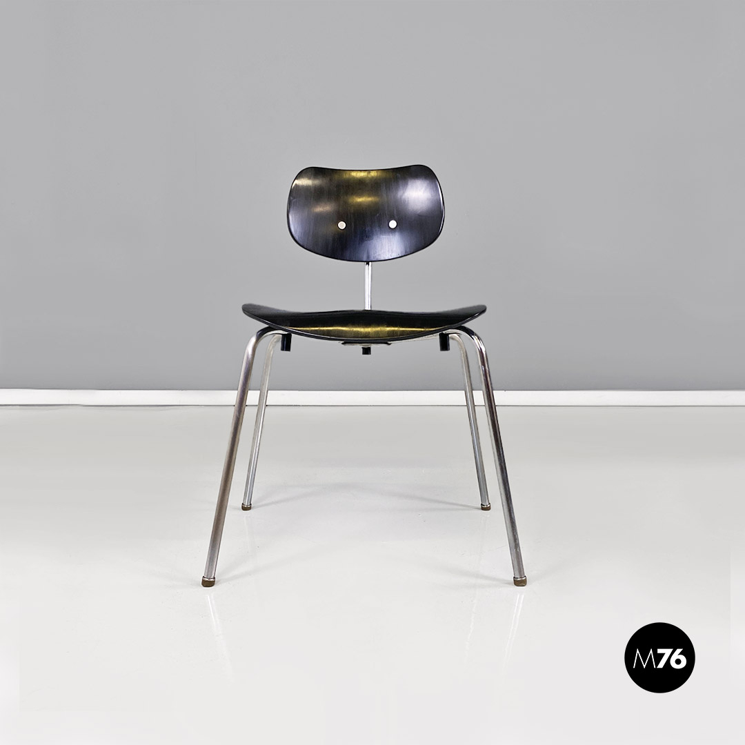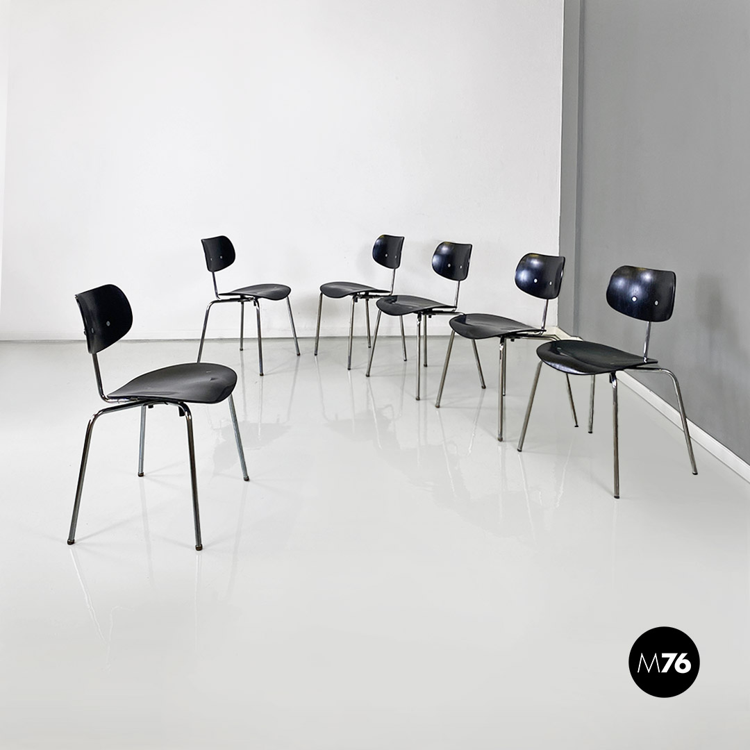 Set di sei sedie modello SE68, con strutture provviste di quattro zampe in tubolare d’acciaio a sezione sottile, con supporto centrale sul retro, sempre in metallo, a cui è fissato lo schienale di forma ovale. Seduta e schienale sono in legno verniciato nero e curvato, sui quali sono visibili dei bulloni piatti che fanno da elegante finitura ai fori di fissaggio della sedia.