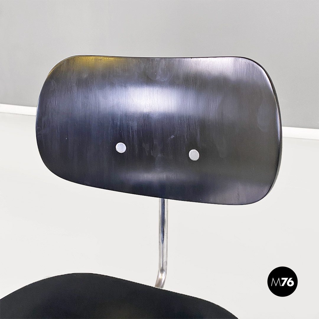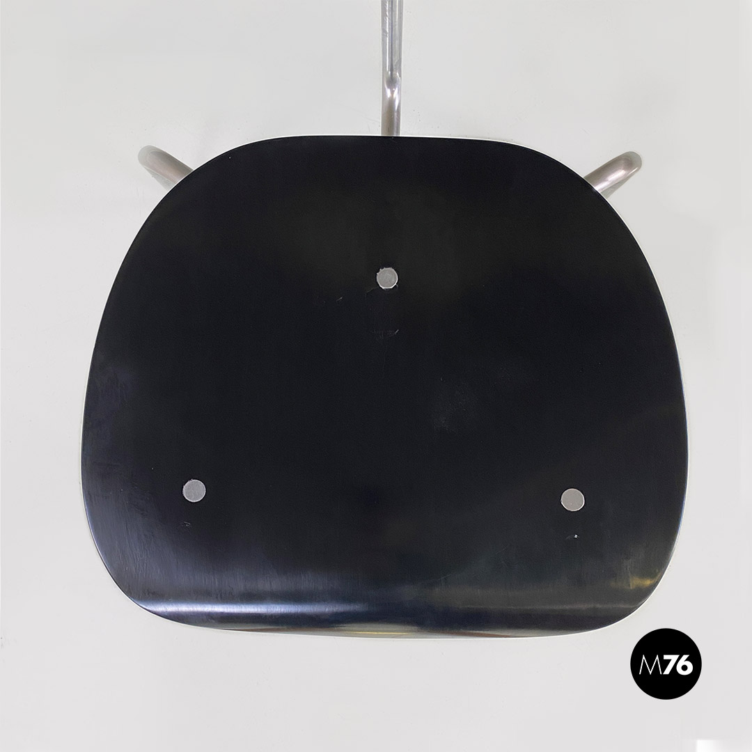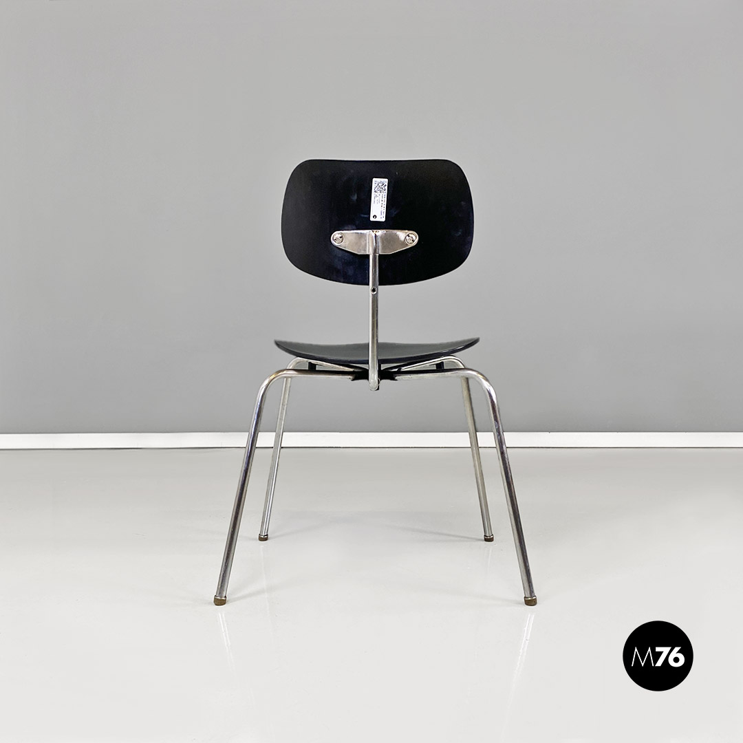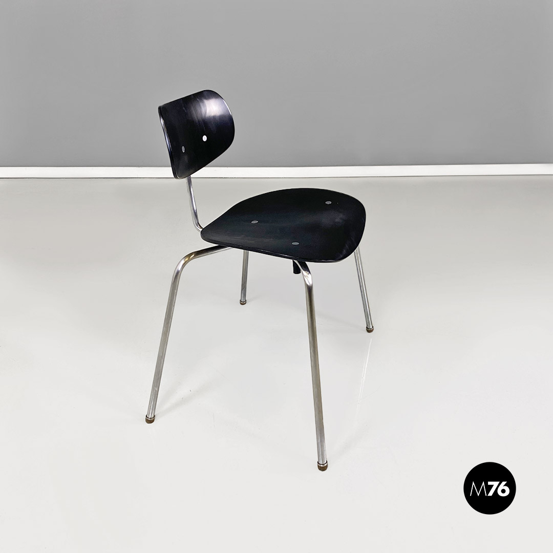Set di sei sedie modello SE68, con strutture provviste di quattro zampe in tubolare d’acciaio a sezione sottile, con supporto centrale sul retro, sempre in metallo, a cui è fissato lo schienale di forma ovale. Seduta e schienale sono in legno verniciato nero e curvato, sui quali sono visibili dei bulloni piatti che fanno da elegante finitura ai fori di fissaggio della sedia.