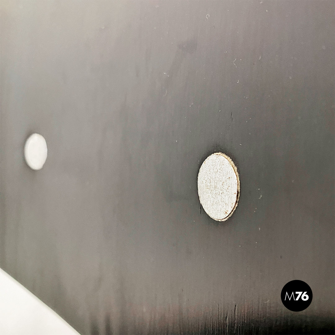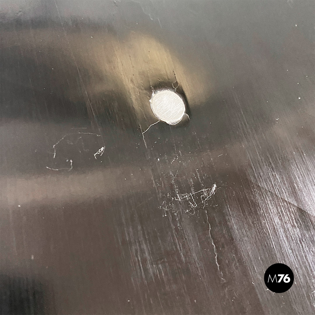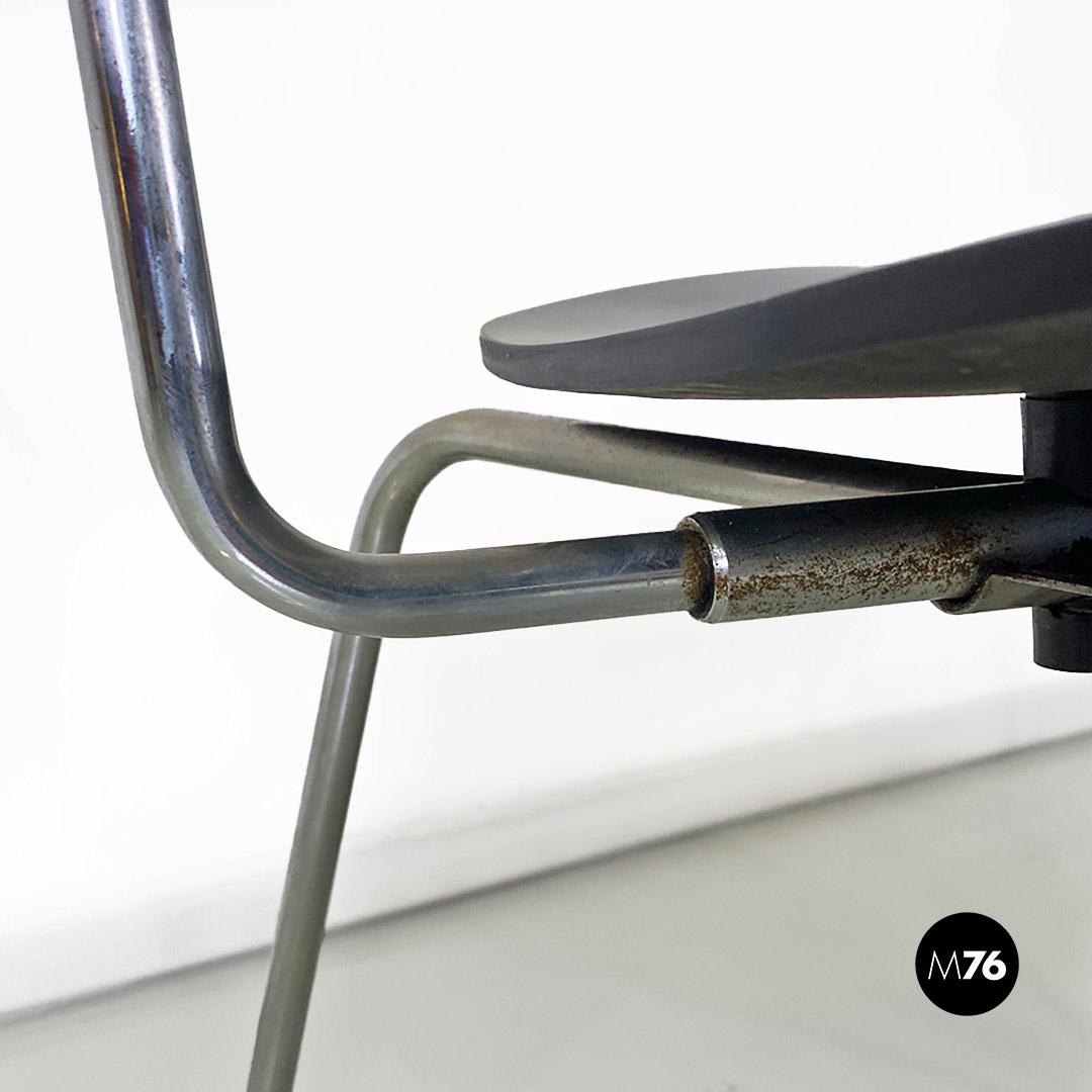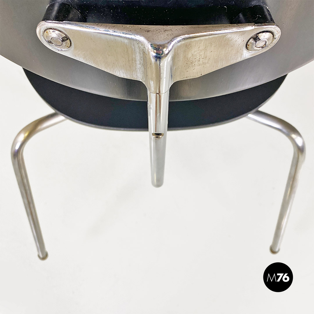 Set di sei sedie modello SE68, con strutture provviste di quattro zampe in tubolare d’acciaio a sezione sottile, con supporto centrale sul retro, sempre in metallo, a cui è fissato lo schienale di forma ovale. Seduta e schienale sono in legno verniciato nero e curvato, sui quali sono visibili dei bulloni piatti che fanno da elegante finitura ai fori di fissaggio della sedia.