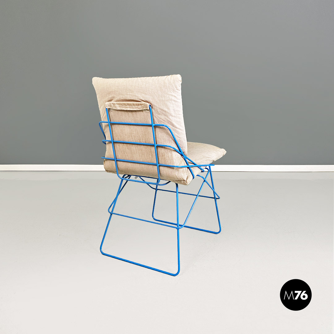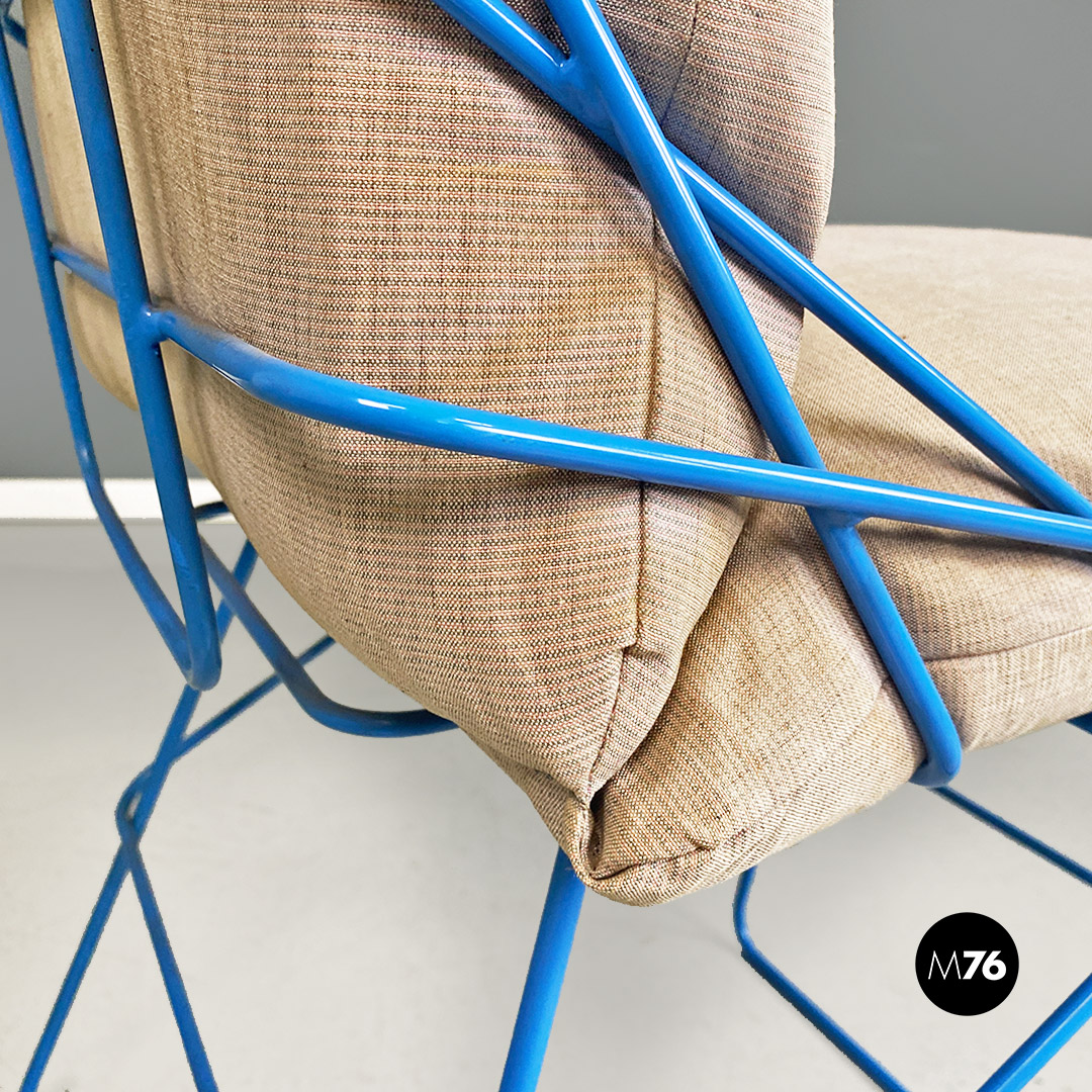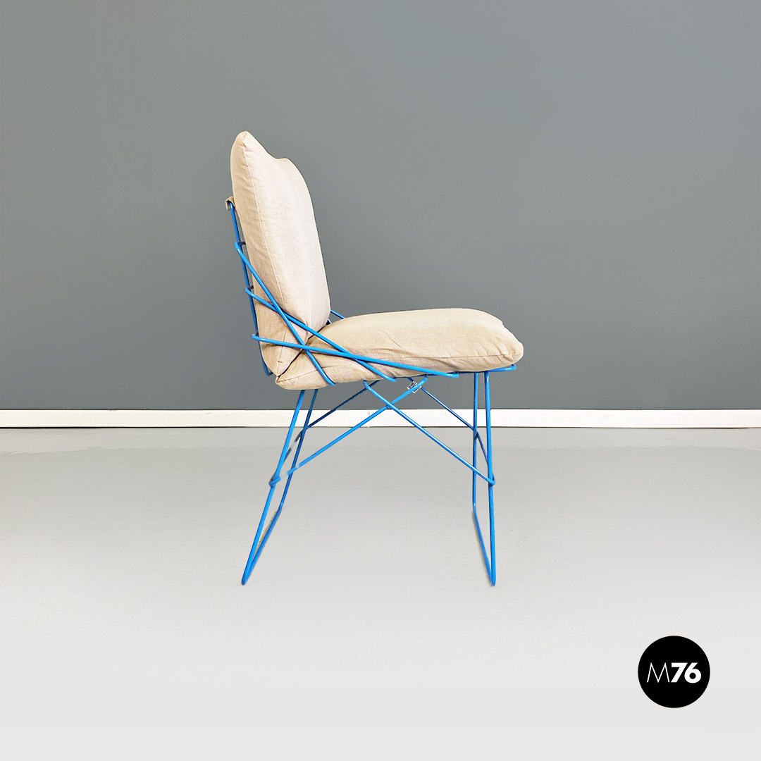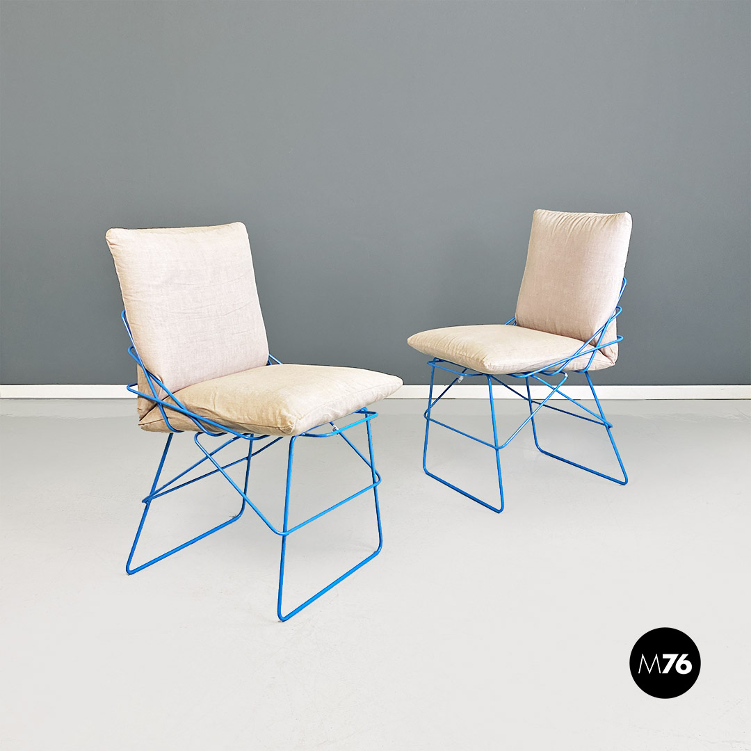 Coppia di sedie modello Sof Sof in tondino di metallo azzurro, con seduta e schienale della sedia imbottiti e rivestiti con tessuto originale beige.