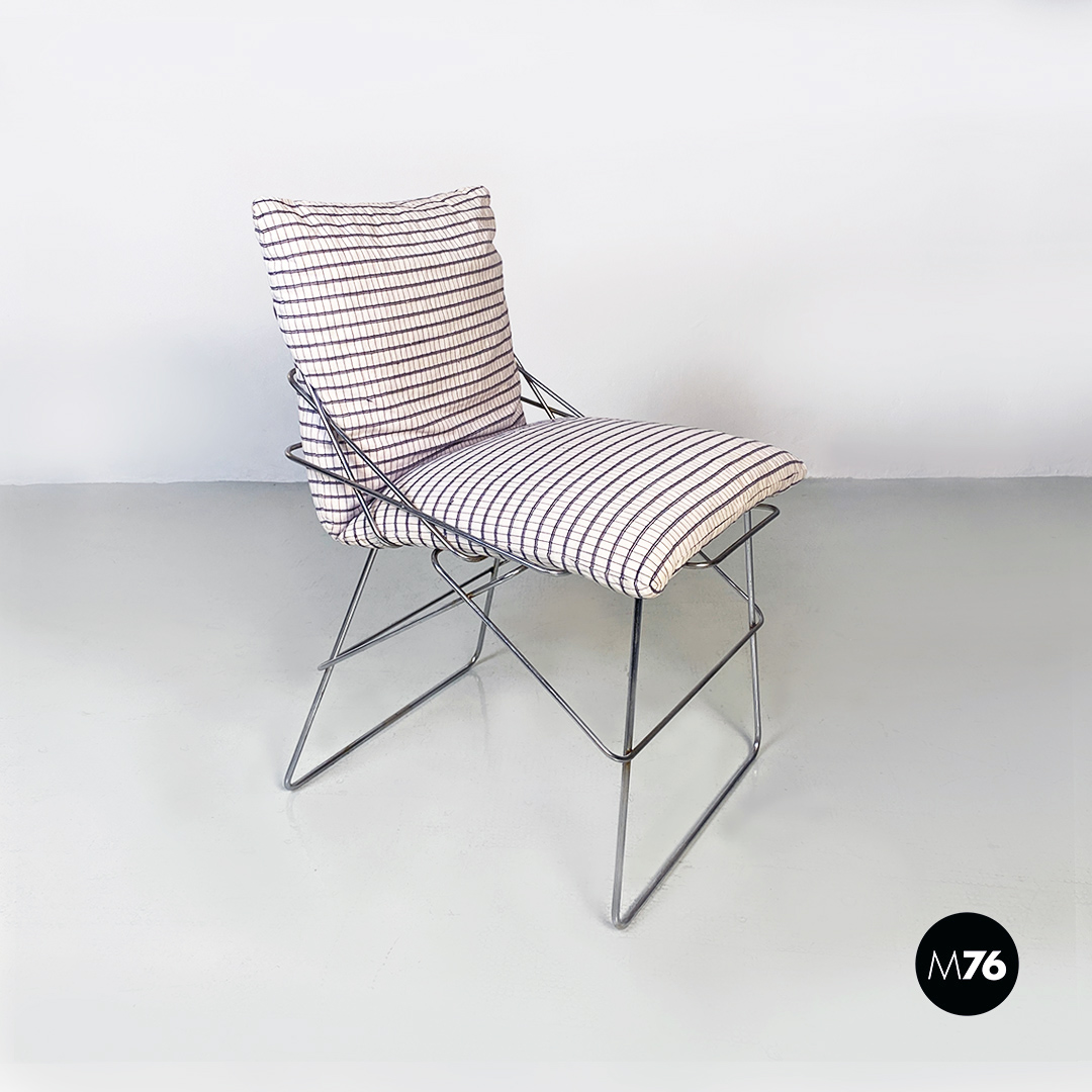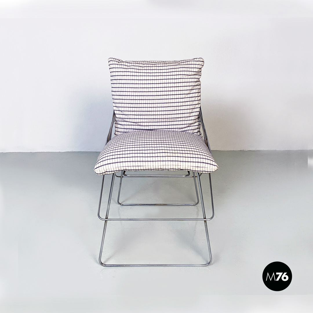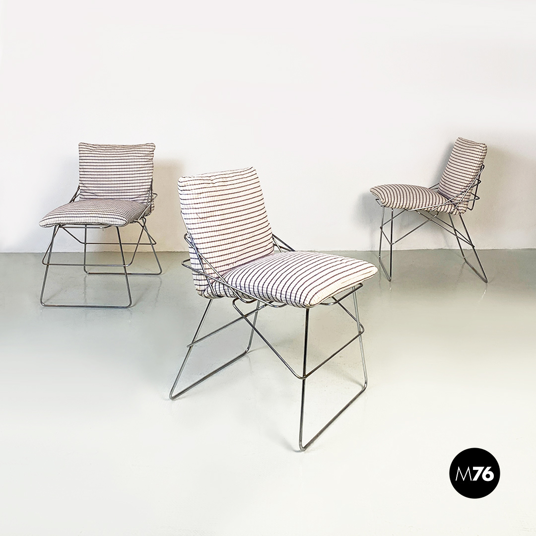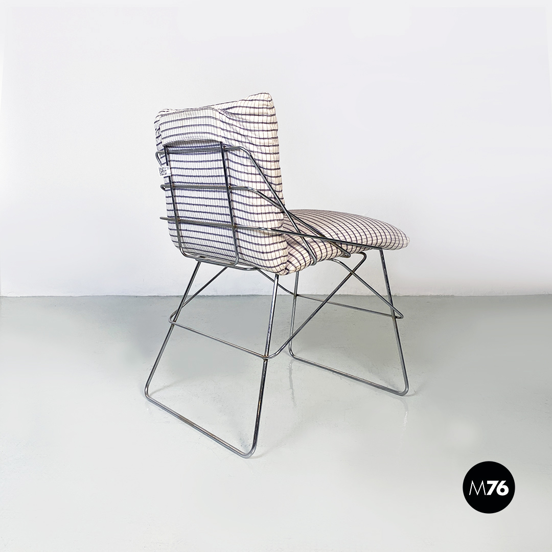 Tre sedie modello Sof Sof in tondino di metallo cromato con seduta e schienale imbottit e rivestiti con tessuto originale a quadretti.