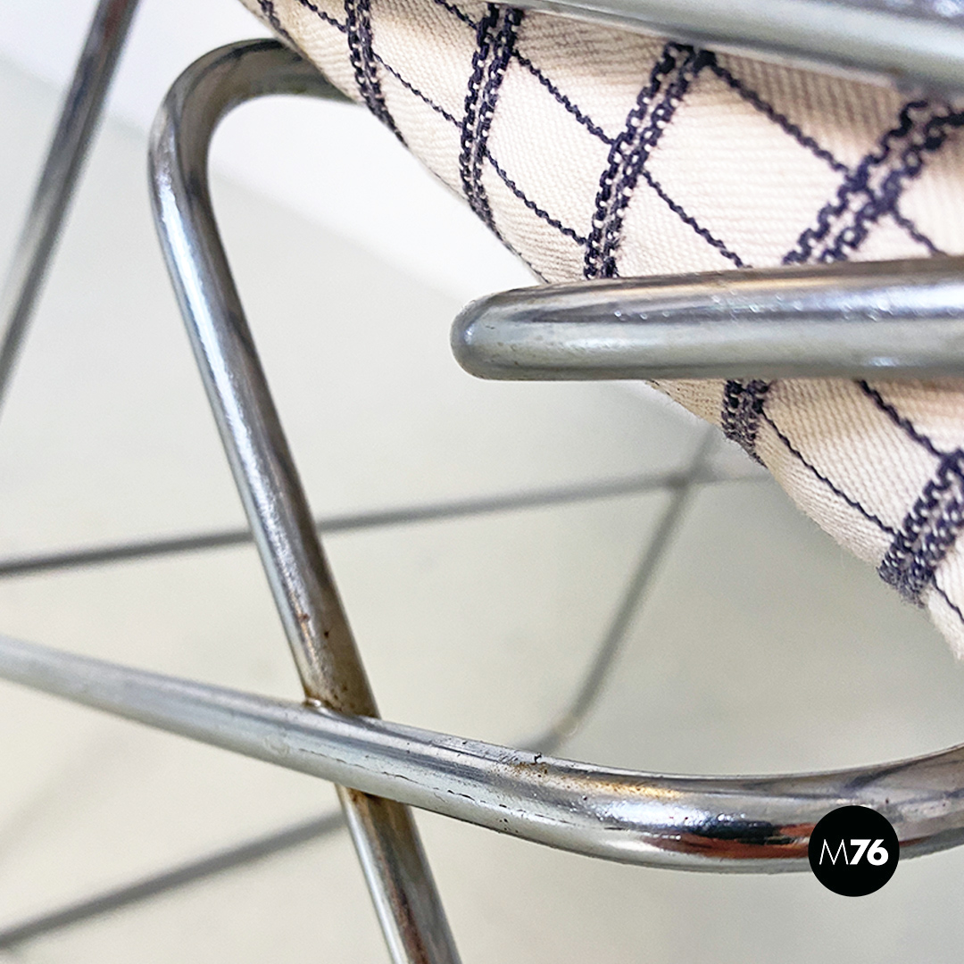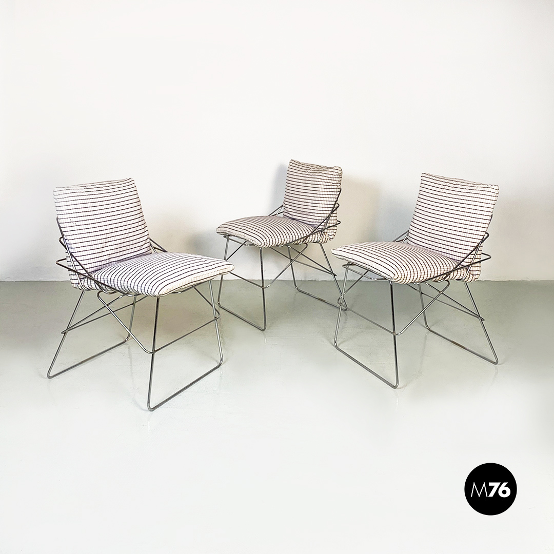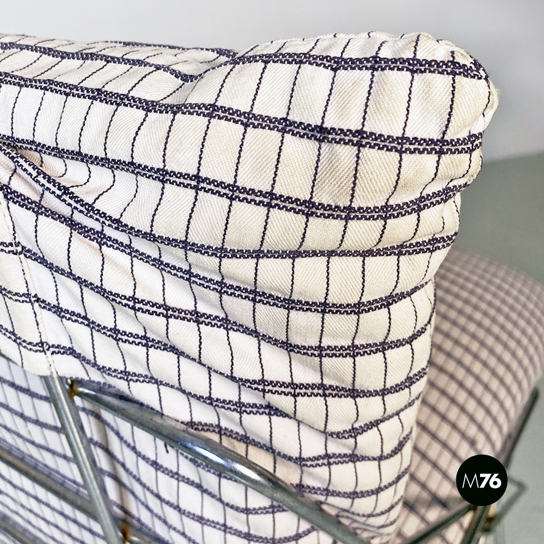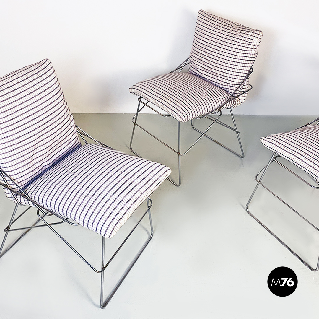 Tre sedie modello Sof Sof in tondino di metallo cromato con seduta e schienale imbottit e rivestiti con tessuto originale a quadretti.
