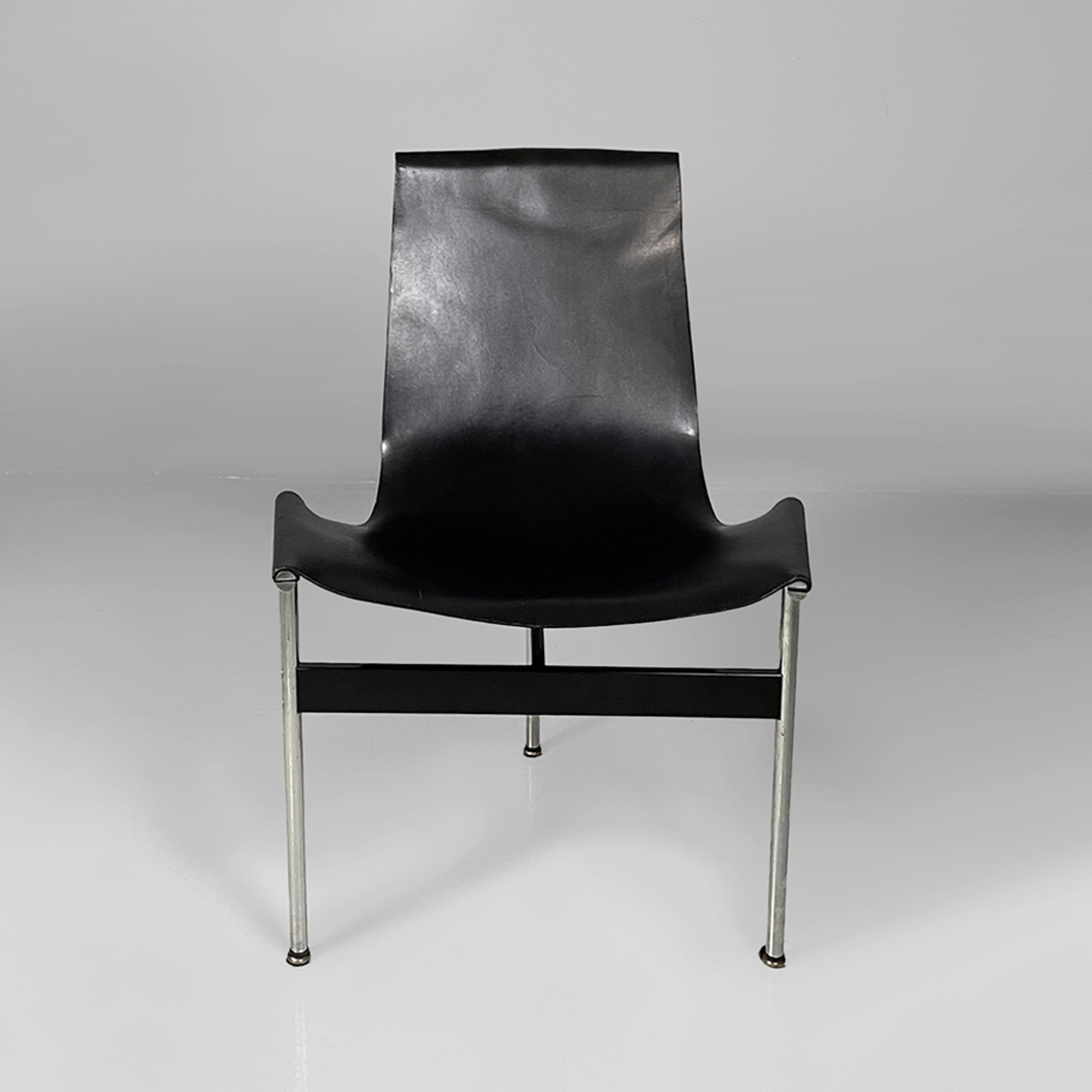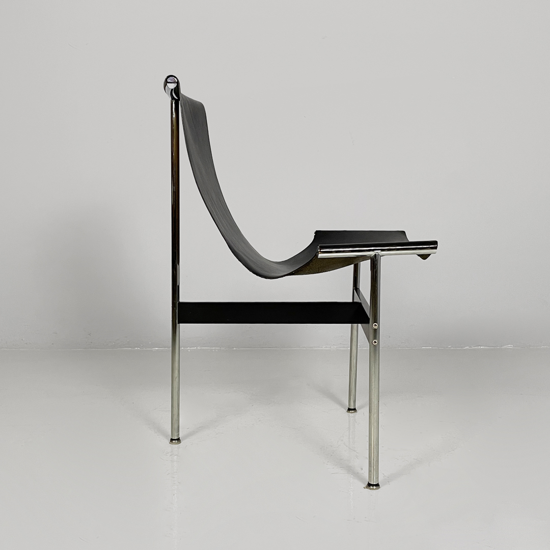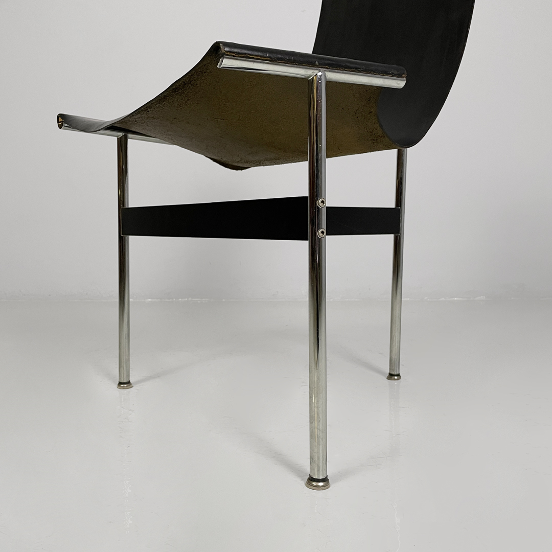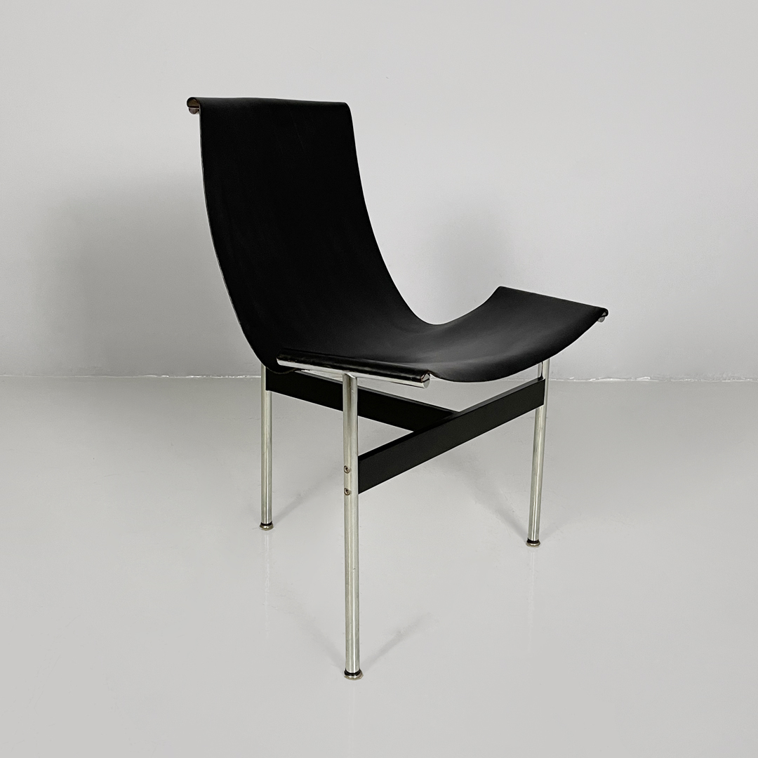 Set di quattro sedie modello T, anche note come modello 3LC per via delle tre zampe che compongono la loro struttura d’appoggio. La seduta e lo schienale sono composti da un unico pezzo in pelle nera. Zampe in acciaio cromato a sezione tonda, legate tra loro da una struttura metallica a forma di “t” in metallo nero opaco.