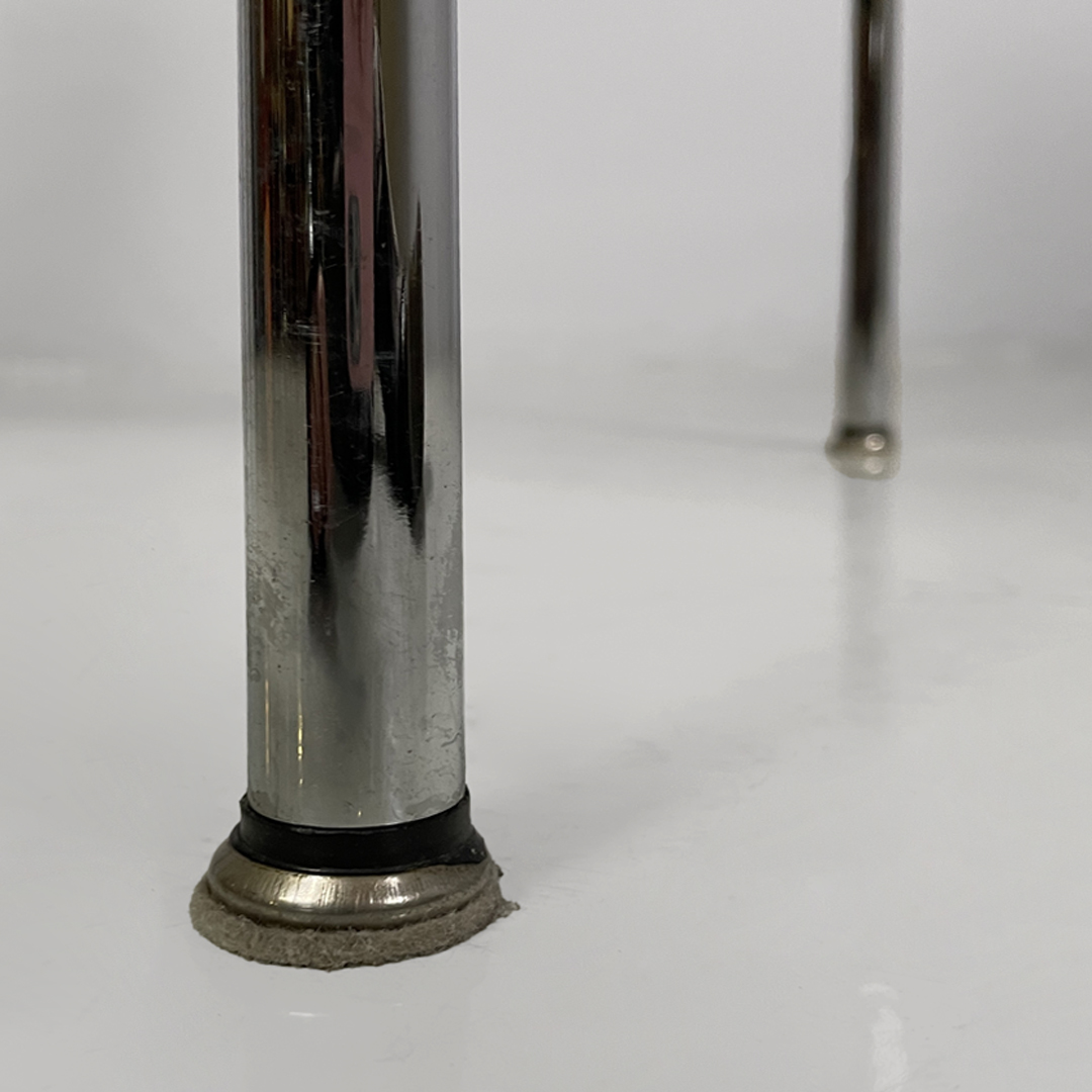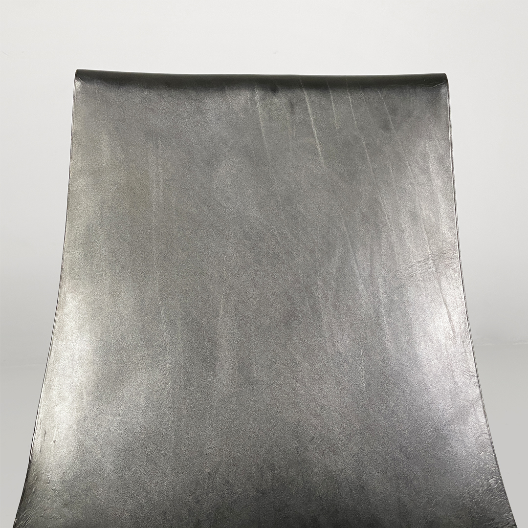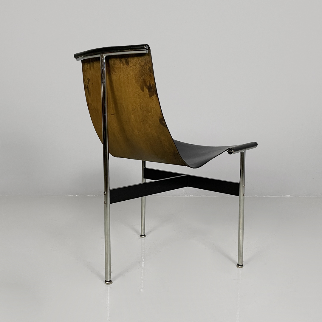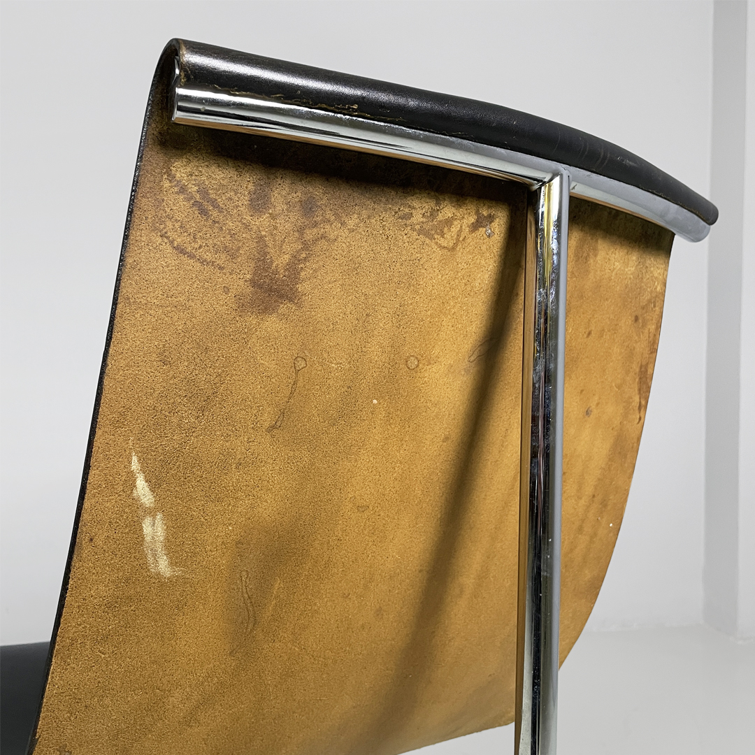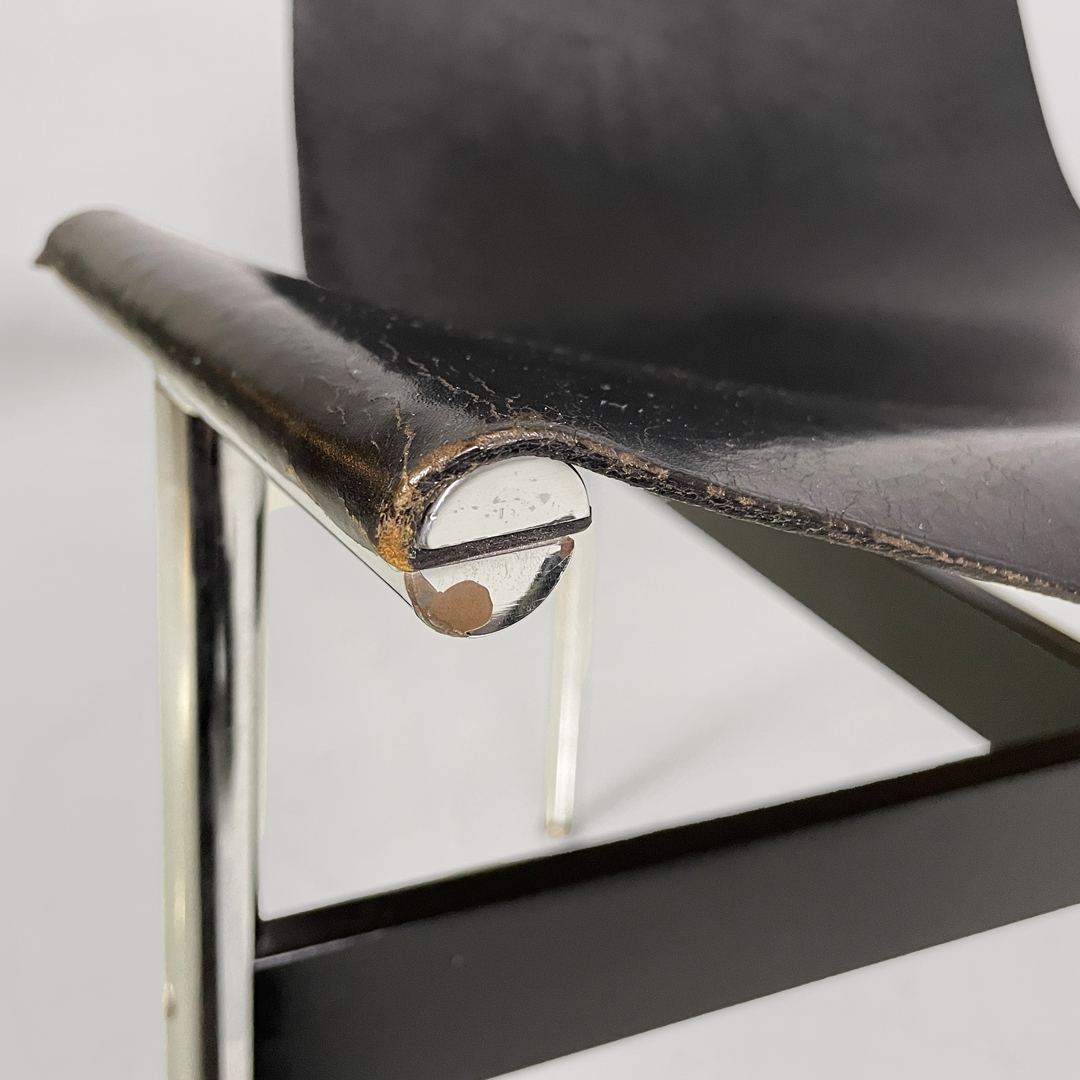 Set di quattro sedie modello T, anche note come modello 3LC per via delle tre zampe che compongono la loro struttura d’appoggio. La seduta e lo schienale sono composti da un unico pezzo in pelle nera. Zampe in acciaio cromato a sezione tonda, legate tra loro da una struttura metallica a forma di “t” in metallo nero opaco.