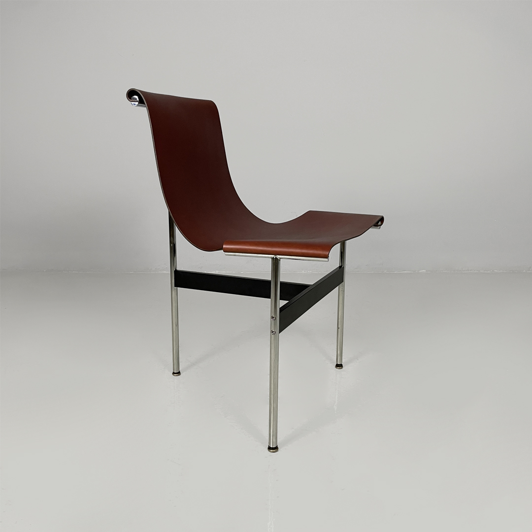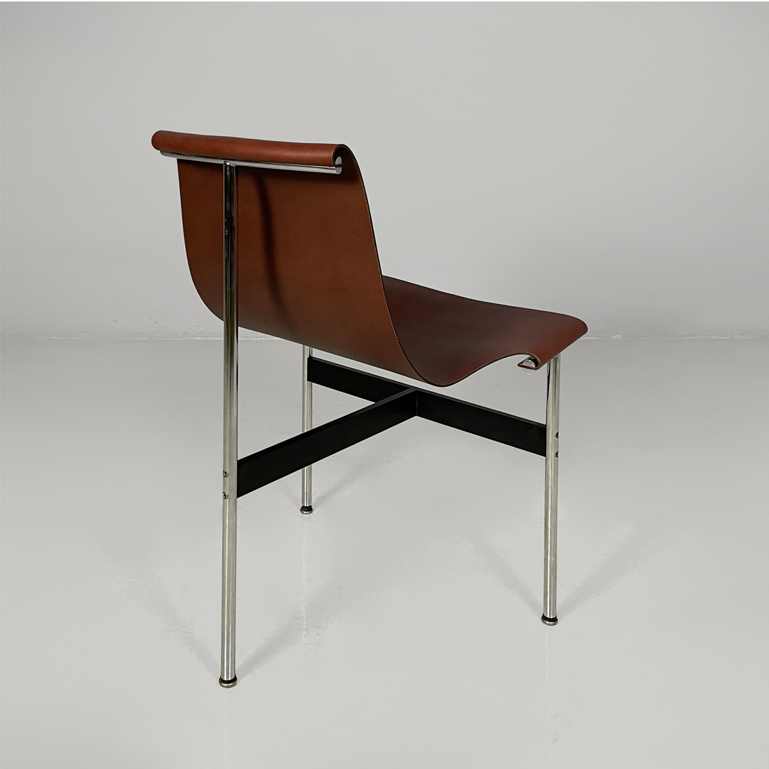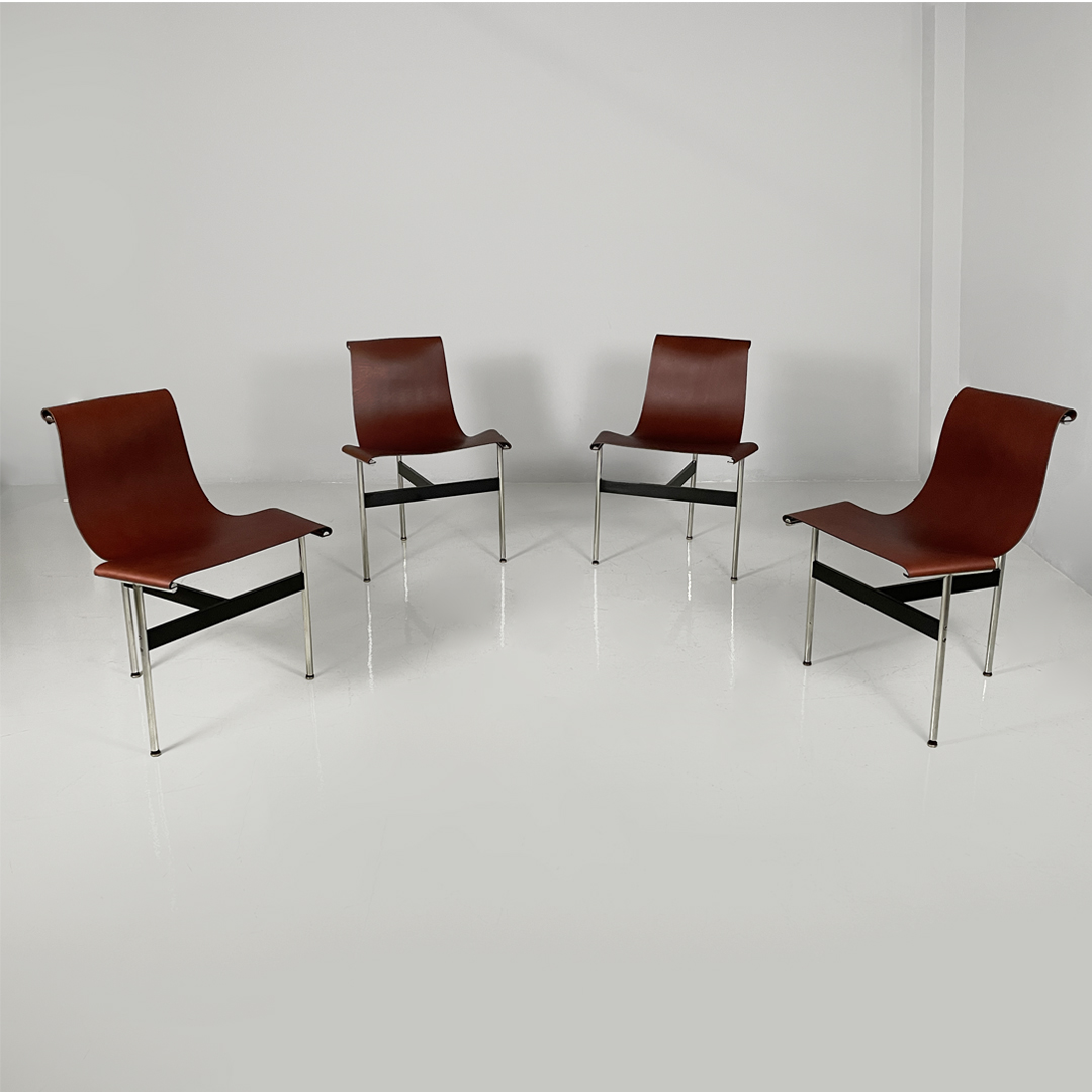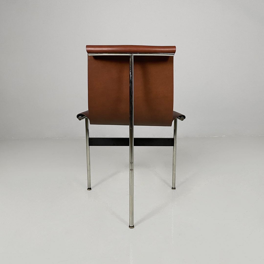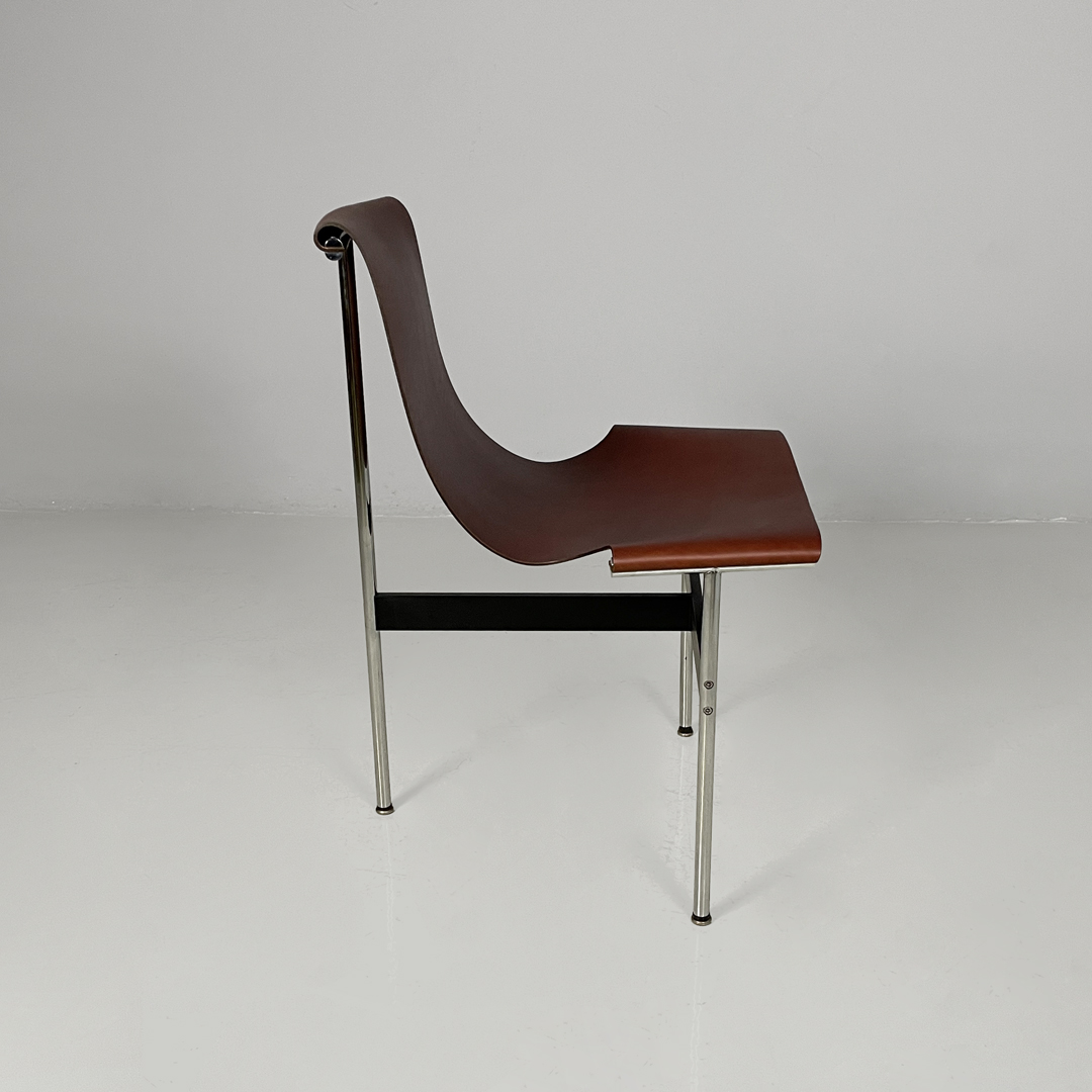 Set di quattro sedie modello T, anche note come modello 3LC per via delle tre zampe che compongono la loro struttura d’appoggio. La seduta e lo schienale sono composti da un unico pezzo in pelle marrone. Zampe in acciaio cromato a sezione tonda, legate tra loro da una struttura metallica a forma di “t” in metallo nero opaco.