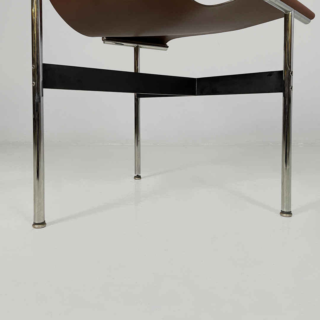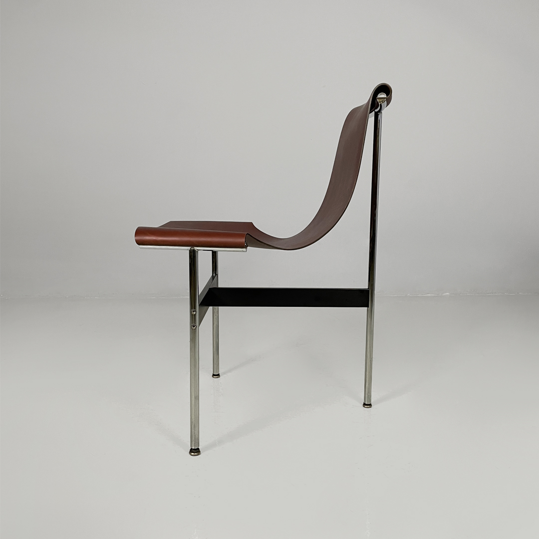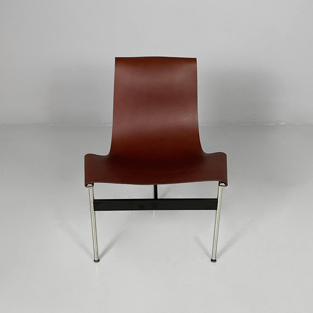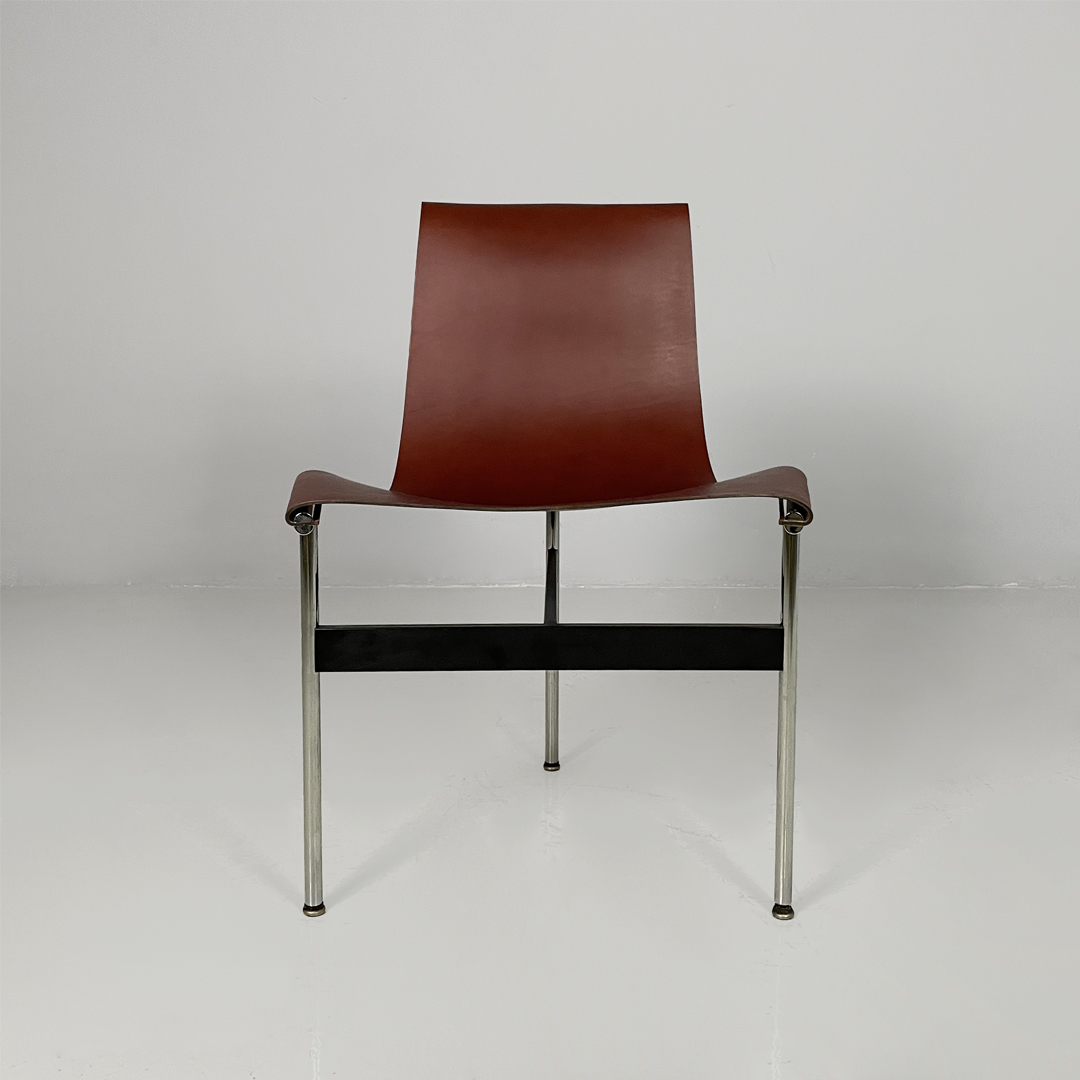 Set di quattro sedie modello T, anche note come modello 3LC per via delle tre zampe che compongono la loro struttura d’appoggio. La seduta e lo schienale sono composti da un unico pezzo in pelle marrone. Zampe in acciaio cromato a sezione tonda, legate tra loro da una struttura metallica a forma di “t” in metallo nero opaco.