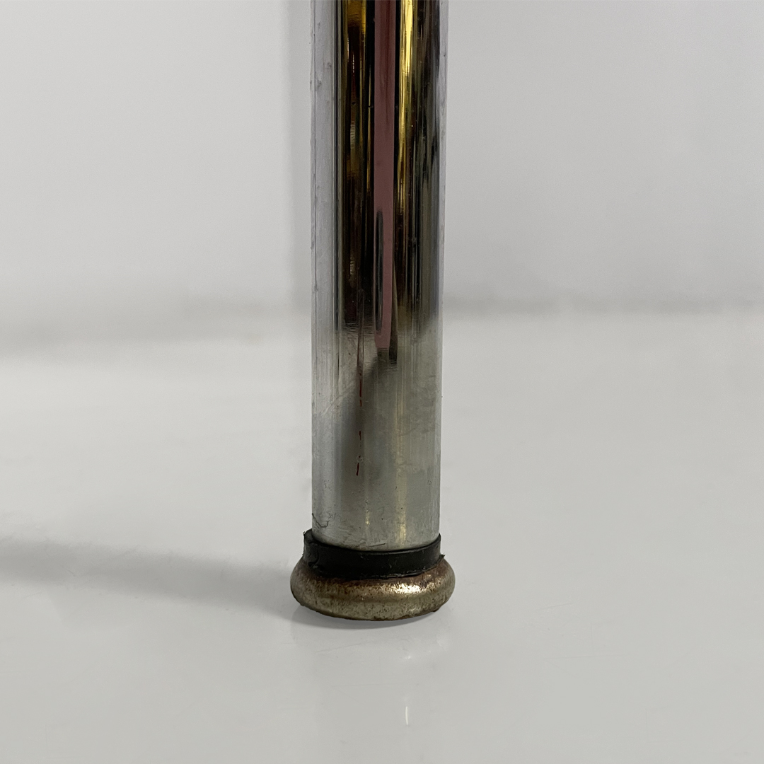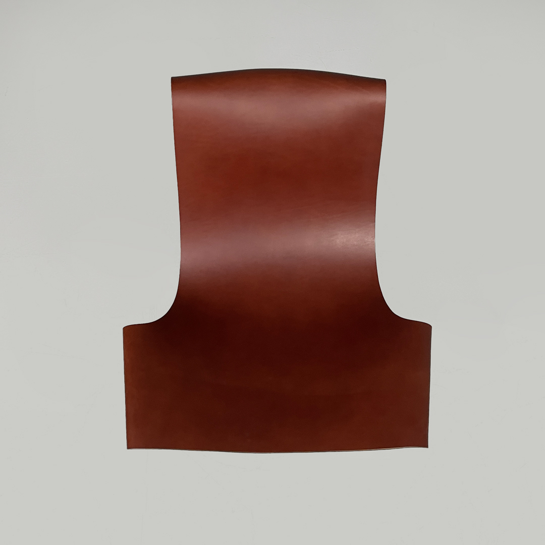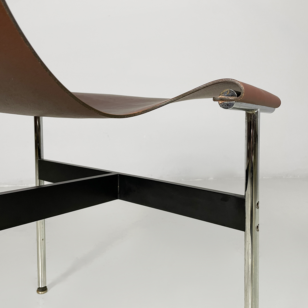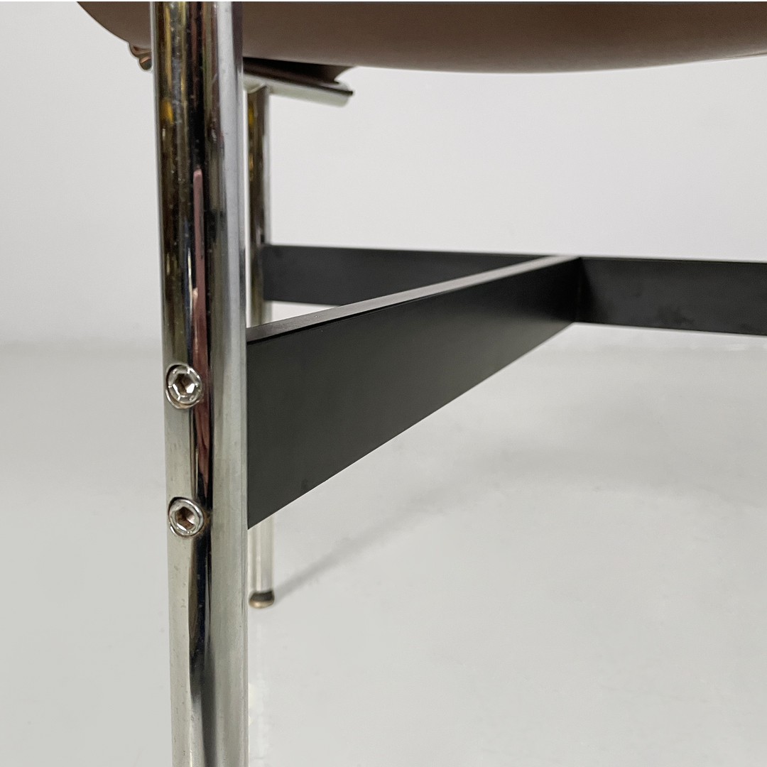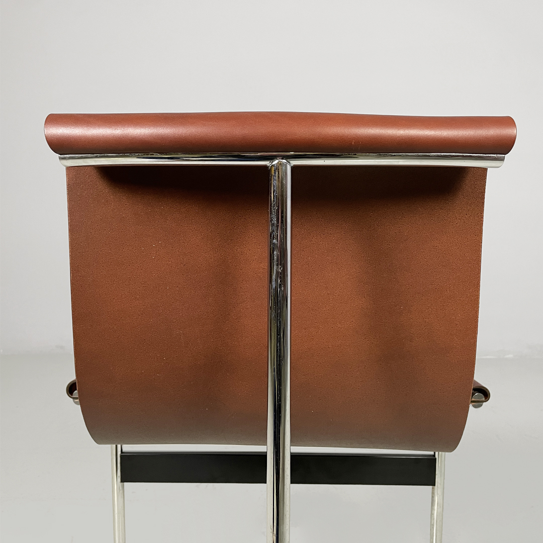 Set di quattro sedie modello T, anche note come modello 3LC per via delle tre zampe che compongono la loro struttura d’appoggio. La seduta e lo schienale sono composti da un unico pezzo in pelle marrone. Zampe in acciaio cromato a sezione tonda, legate tra loro da una struttura metallica a forma di “t” in metallo nero opaco.