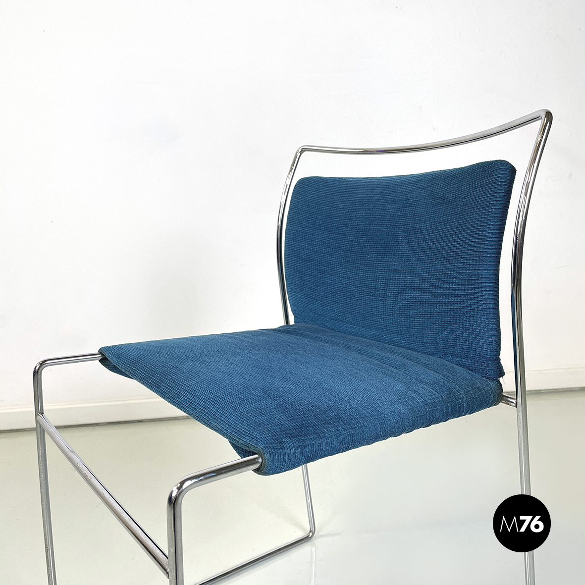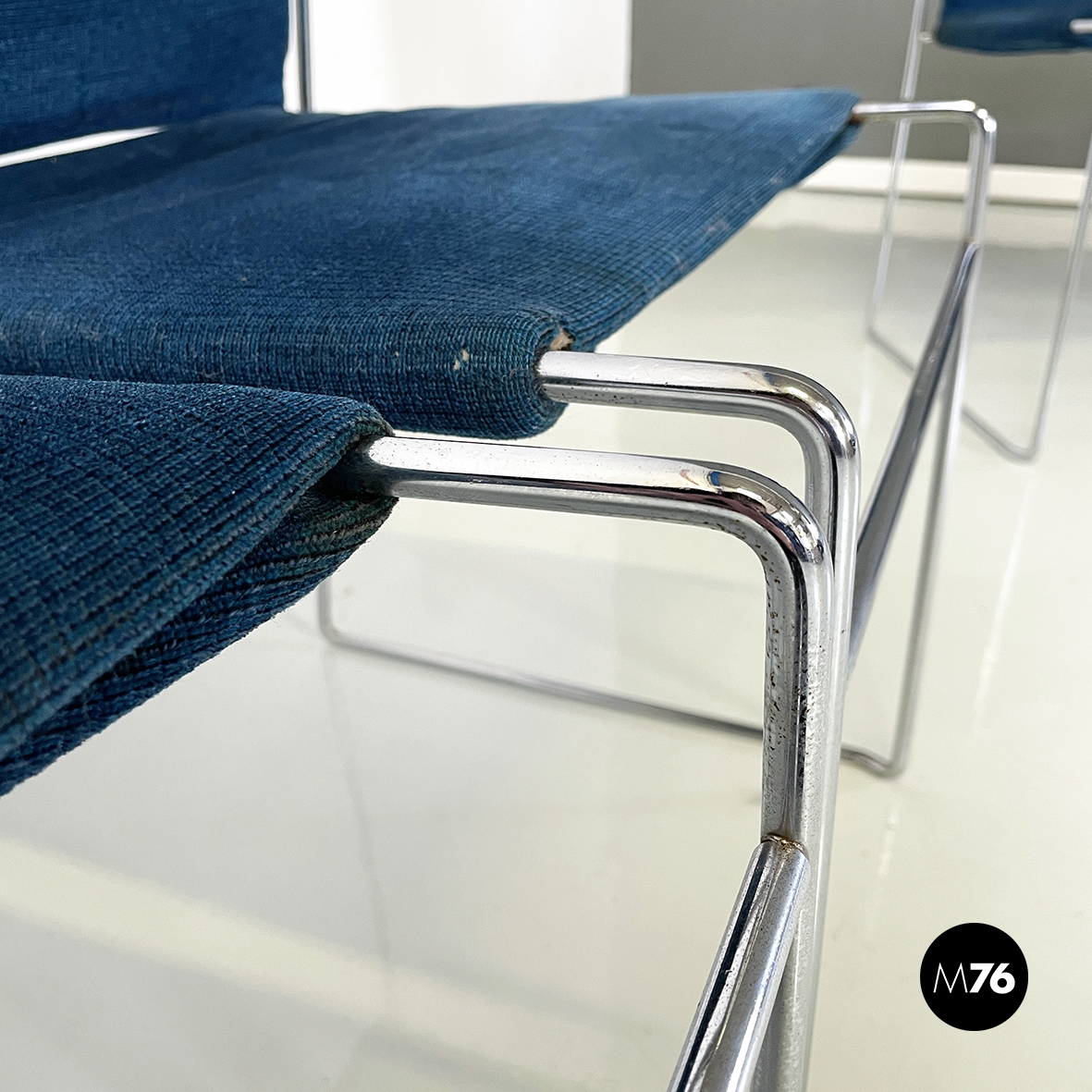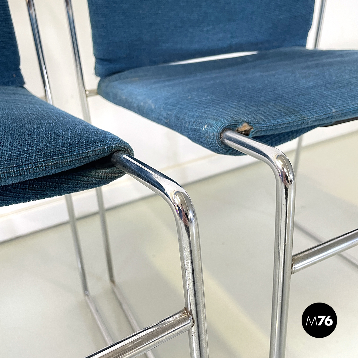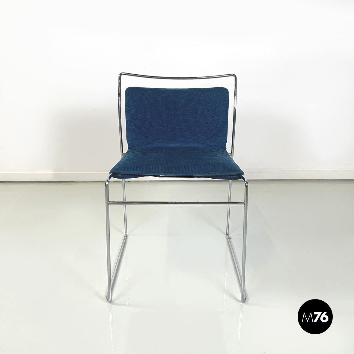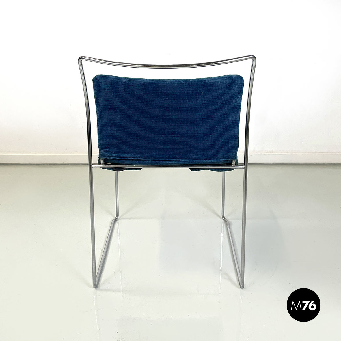 Set di sei sedie modello Tulu con seduta e schienale rettangolari, imbottiti e rivestiti in tessuto di velluto tramato blu, originale. La struttura tondino di acciaio Il tessuto della seduta è sostenuta da sotto attraverso delle cinghie elastiche nere. Sedie impilabili.