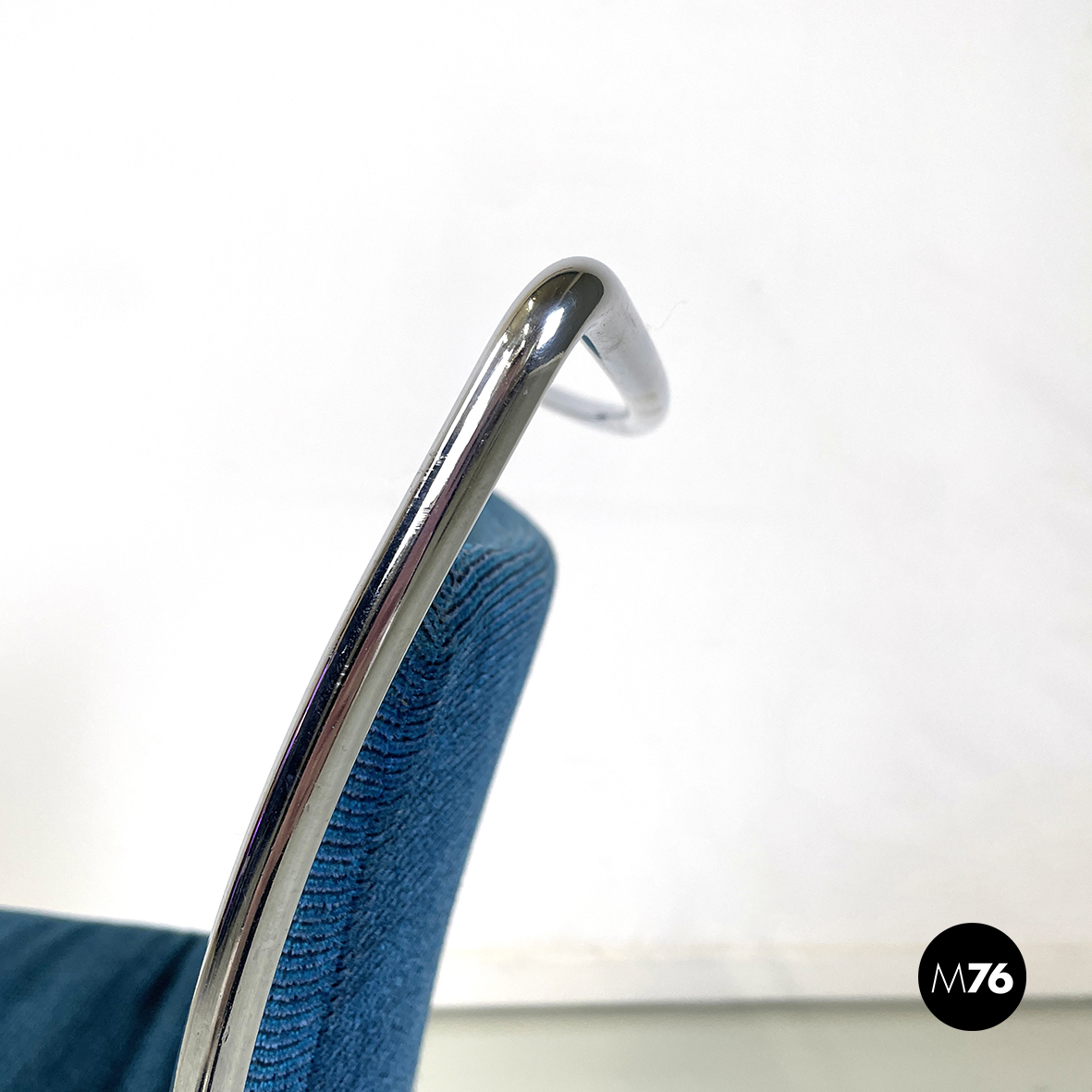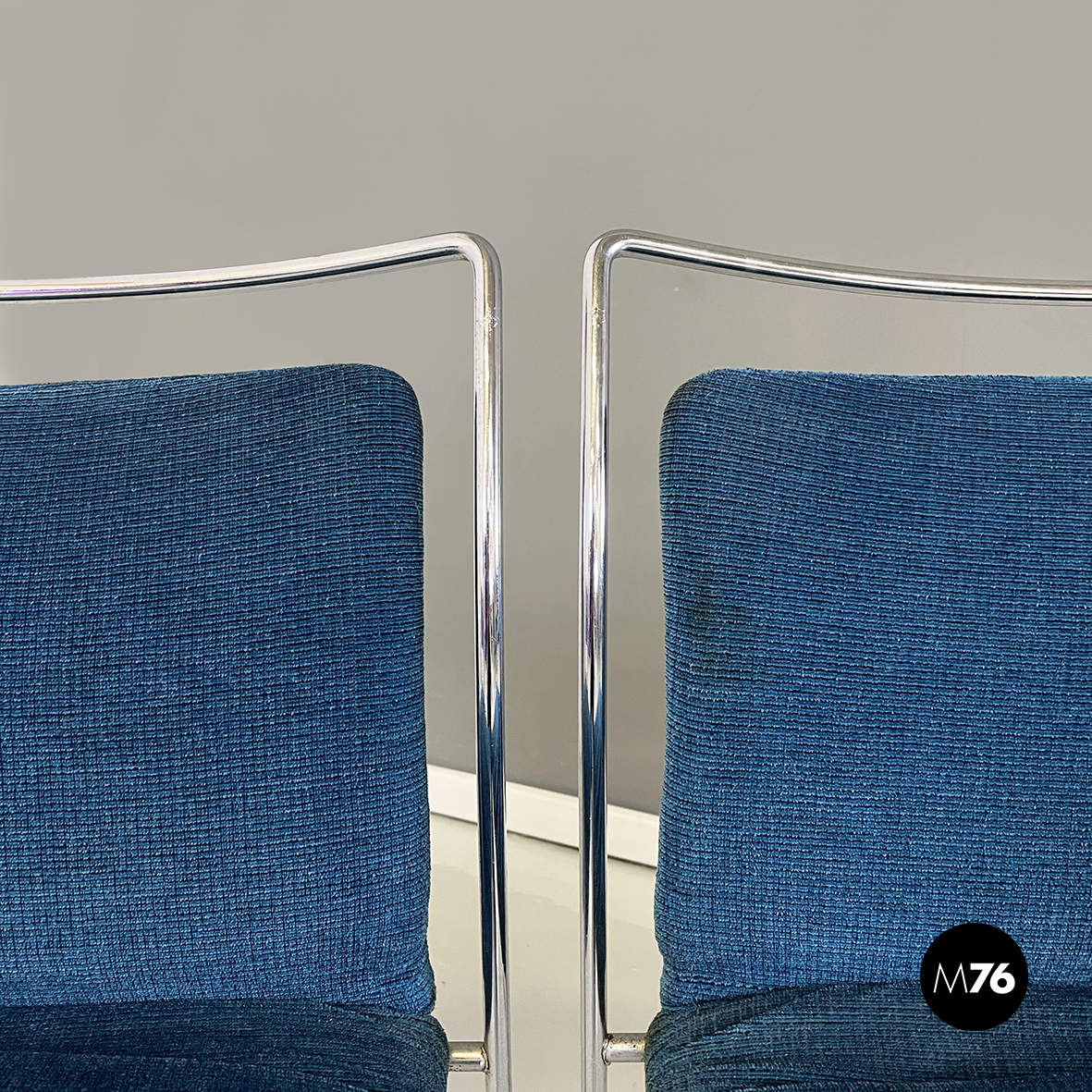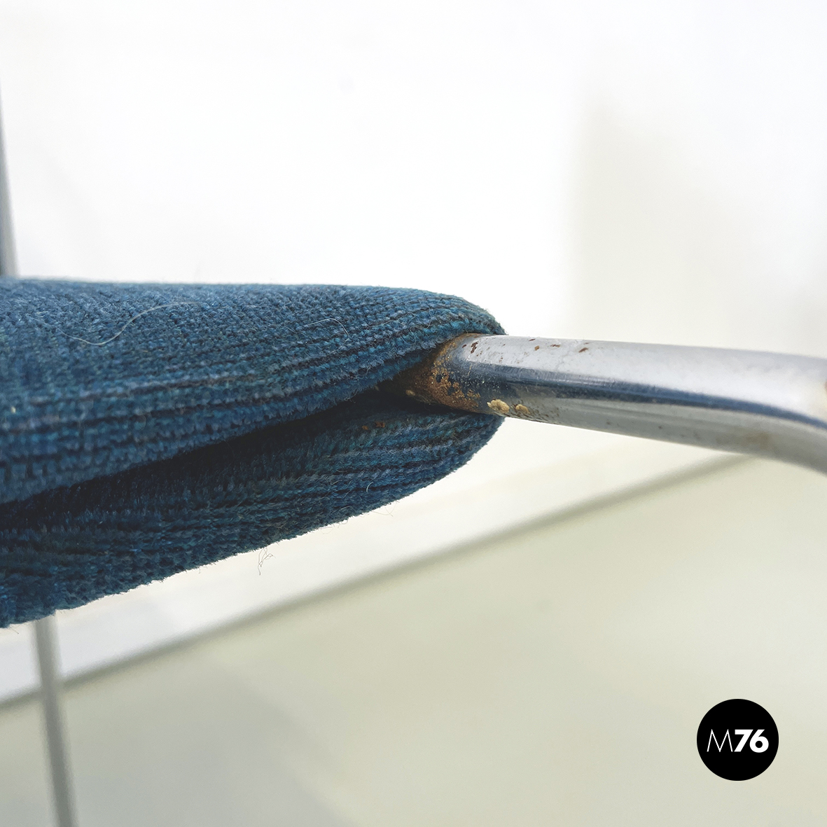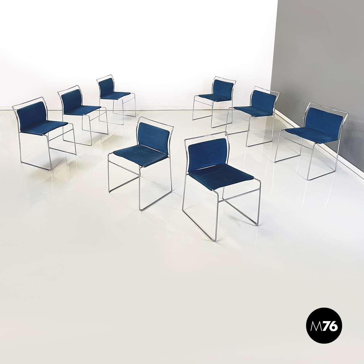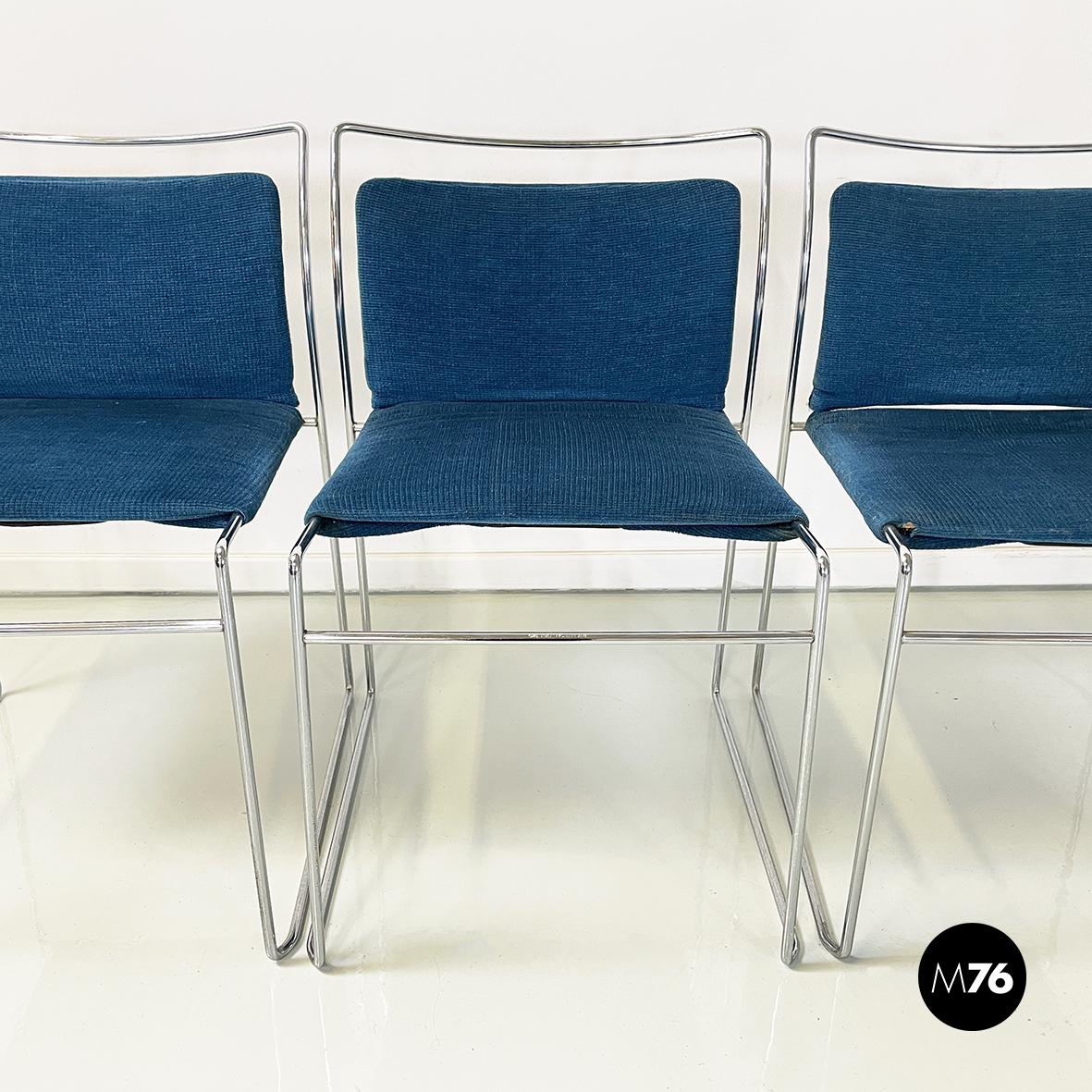 Set di sei sedie modello Tulu con seduta e schienale rettangolari, imbottiti e rivestiti in tessuto di velluto tramato blu, originale. La struttura tondino di acciaio Il tessuto della seduta è sostenuta da sotto attraverso delle cinghie elastiche nere. Sedie impilabili.