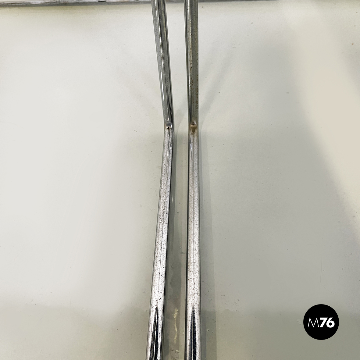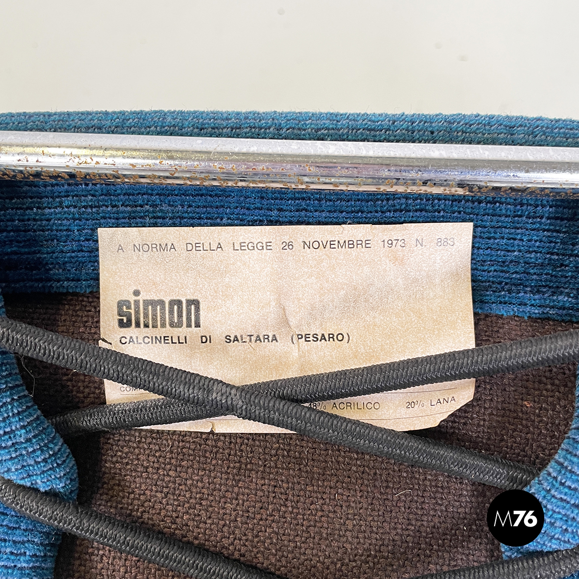 Condizioni vintage, presentano diversi segni sparsi sia su tessuto che sul metallo dati dal tempo e dall’utilizzo. Due sedie presentano un difetto sul tessuto e una sedia presenta una macchia.