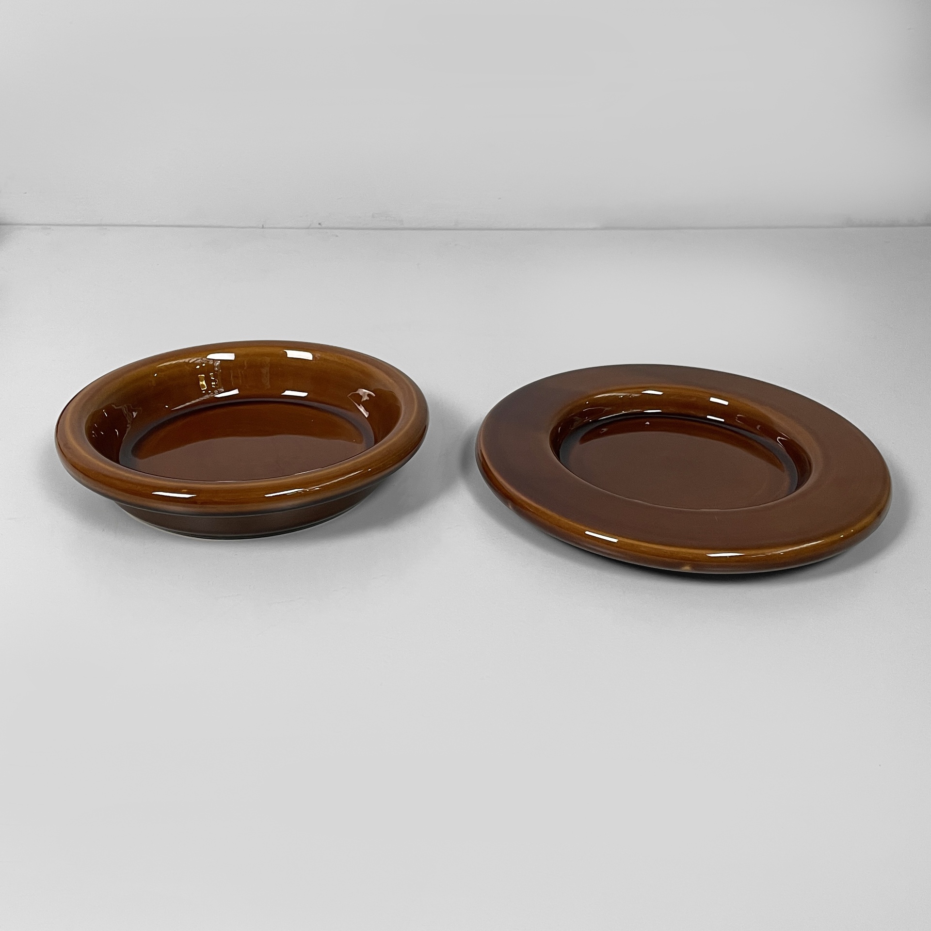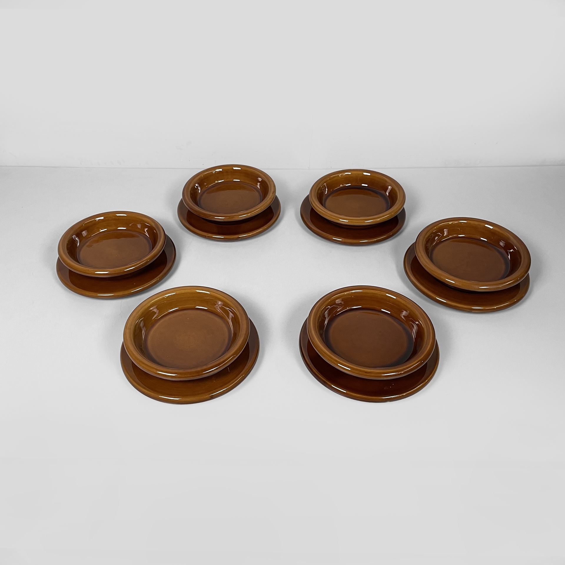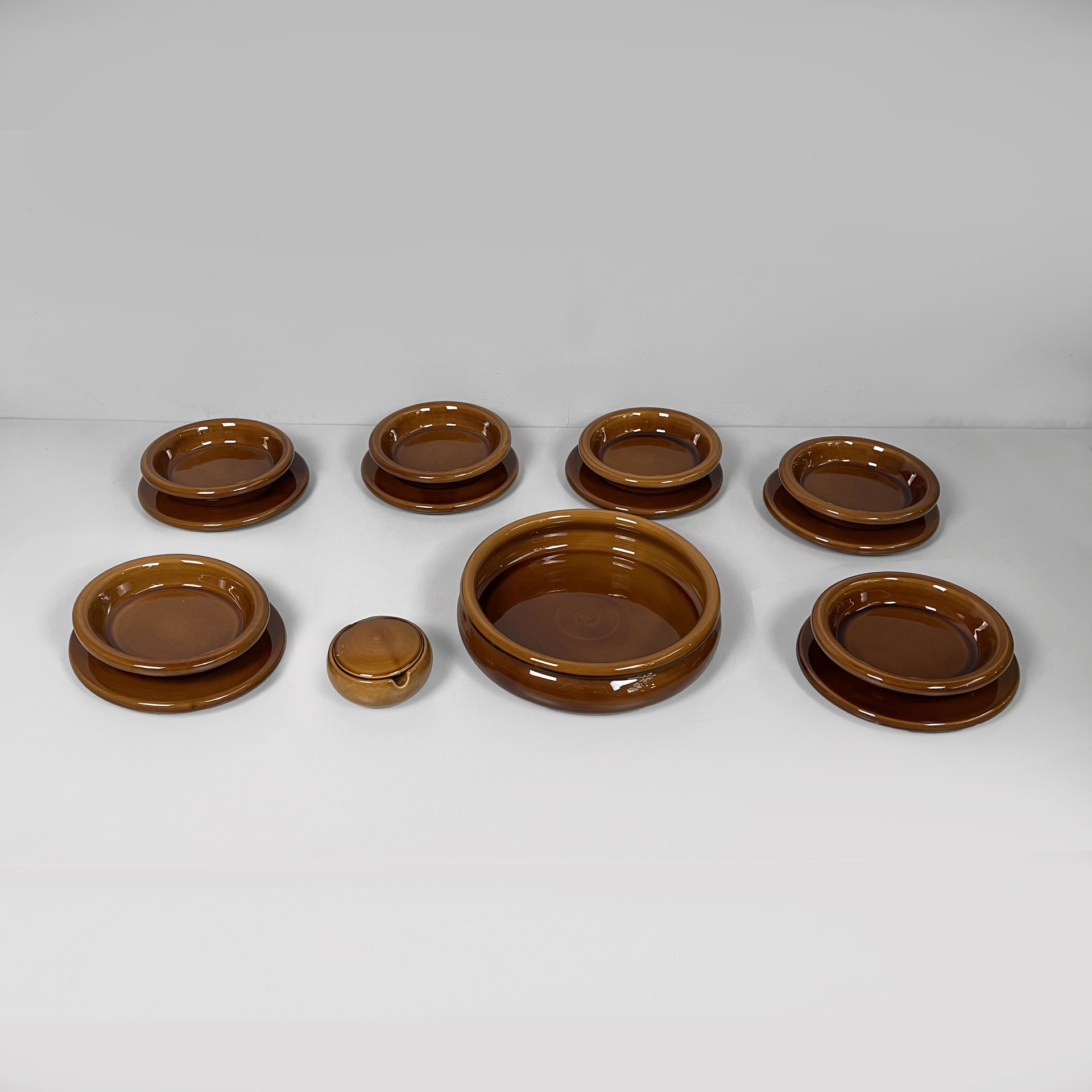 Servizio da tavola in ceramica marrone, composto da un set di sei ciotole, un set di sei piatti, una ciotola di dimensioni maggiori e un portasalsa. Tutti gli elementi del set sono a base tonda.
