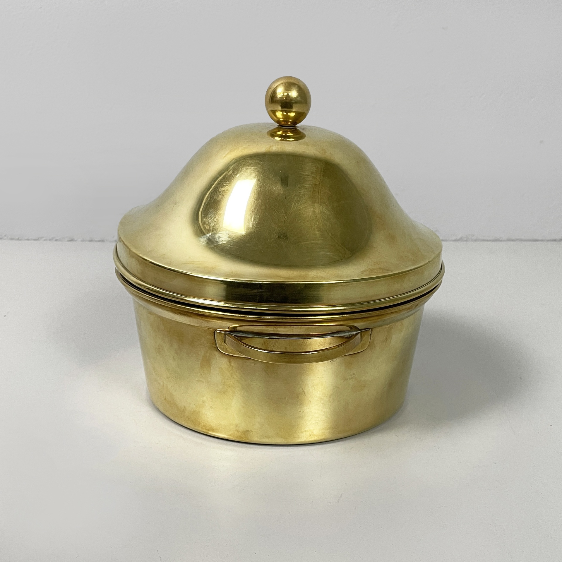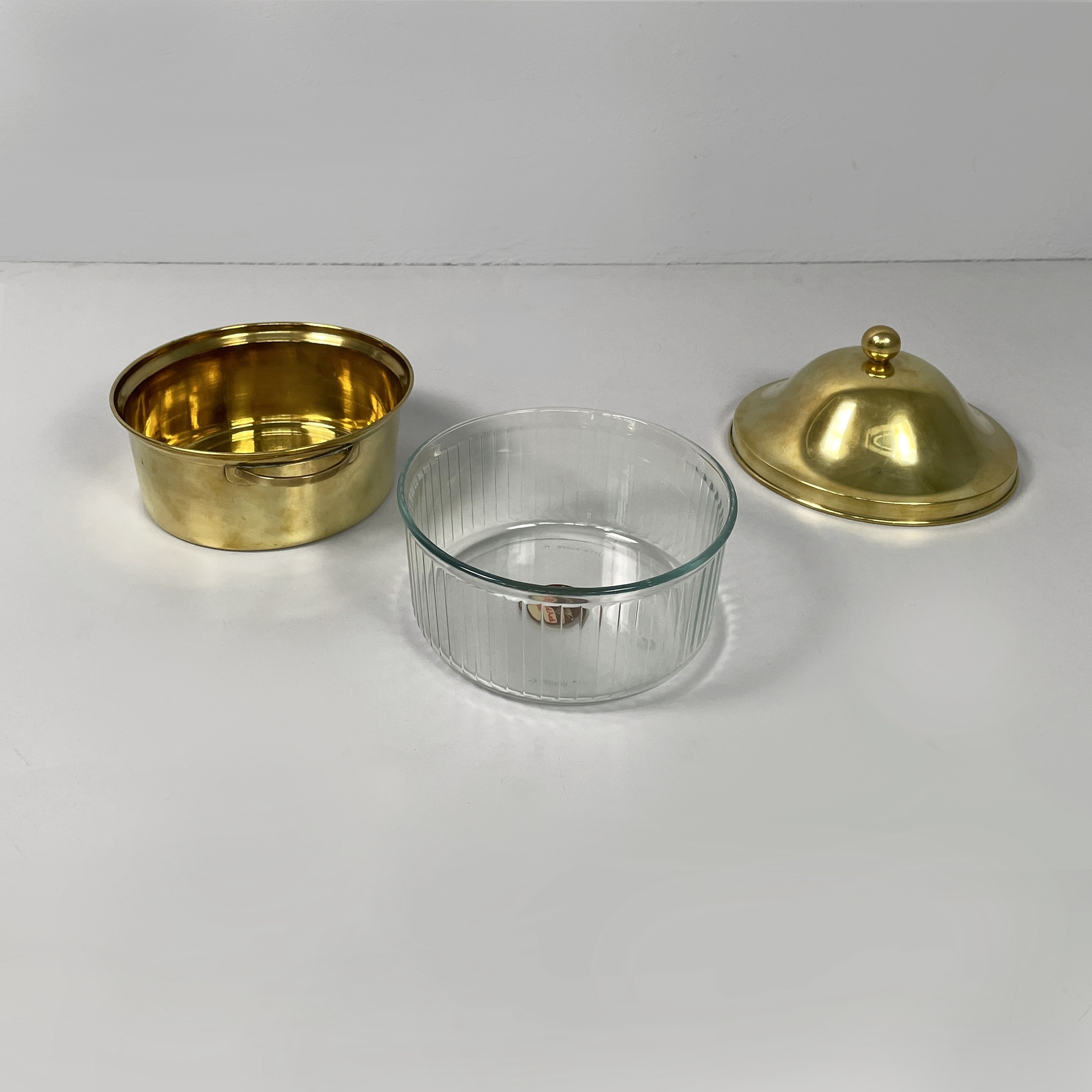 Servizio da tavola a base tonda composto da un contenitore in ottone e una ciotola interna in vetro pirex. Il contenitore presenta un coperchio con maniglia a sfera e due maniglie.
