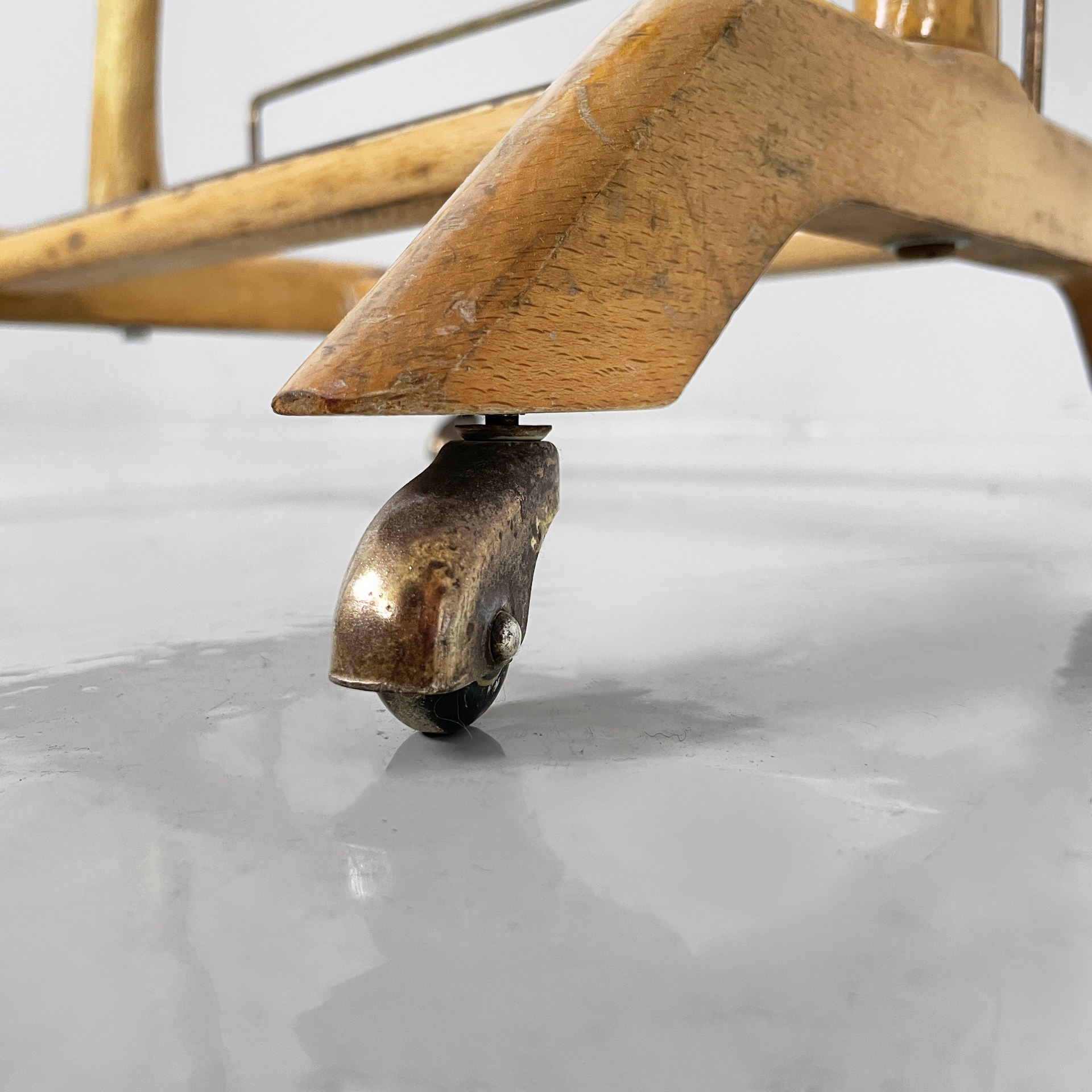 Servomuto da terra in legno e ottone. Nella parte superiore è presente un appendiabiti in legno con una sfera in ottone utilizzabile come portacappello, un gancio frontale in ottone e uno piccolo sul retro in metallo. Al centro è presente una piccola mensola con due tondini di ottone estraibili. La base in legno presenta dettagli in ottone e ruote.