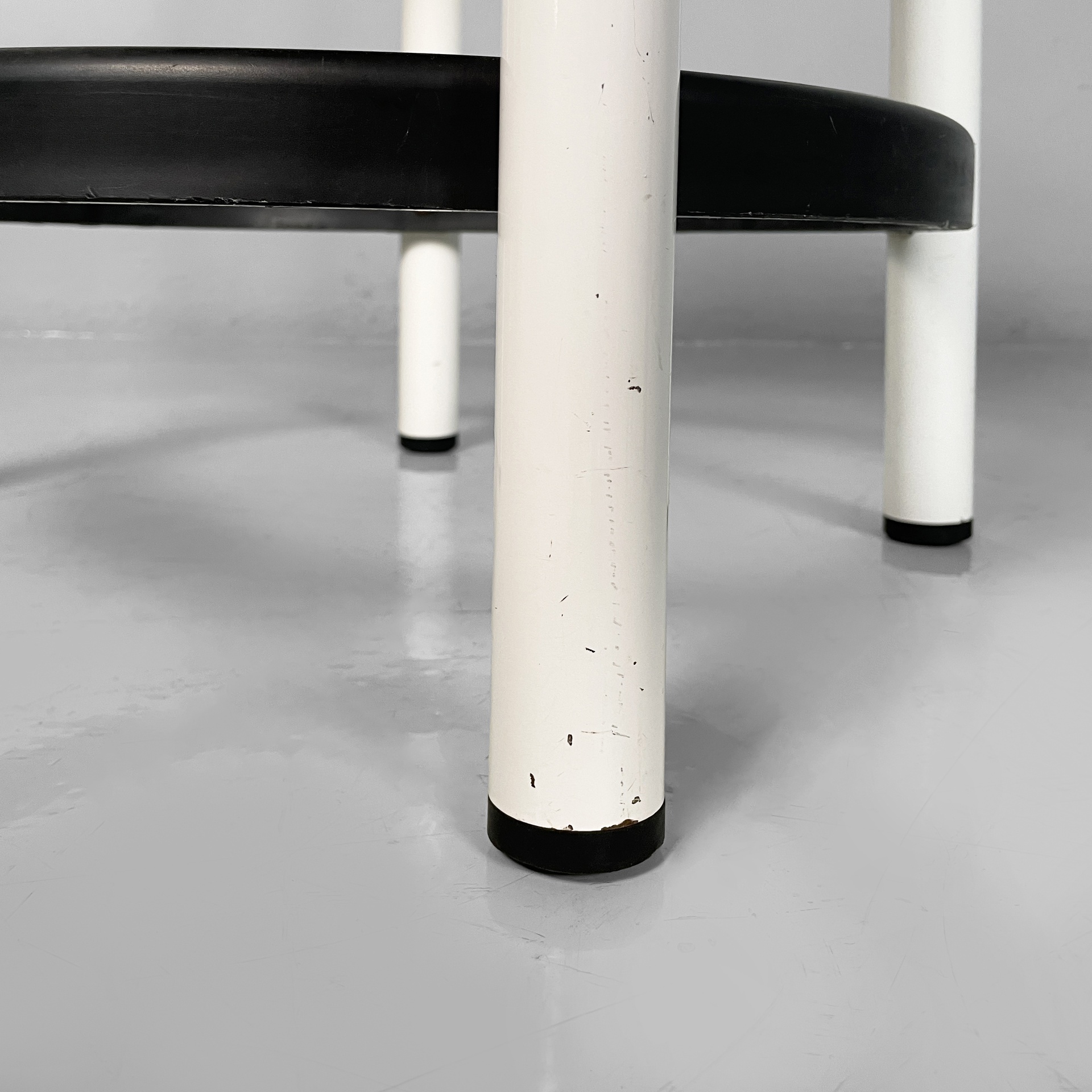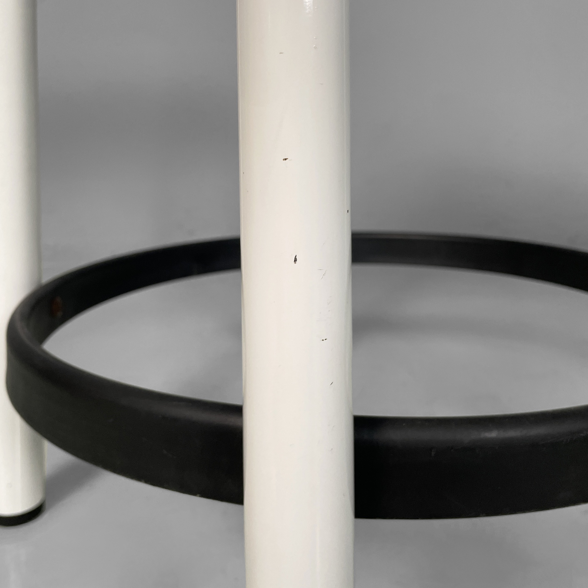 Buone condizioni, segni sparsi dati dal tempo. Lo sgabello bianco presenta piccole mancanze di colore sparse.