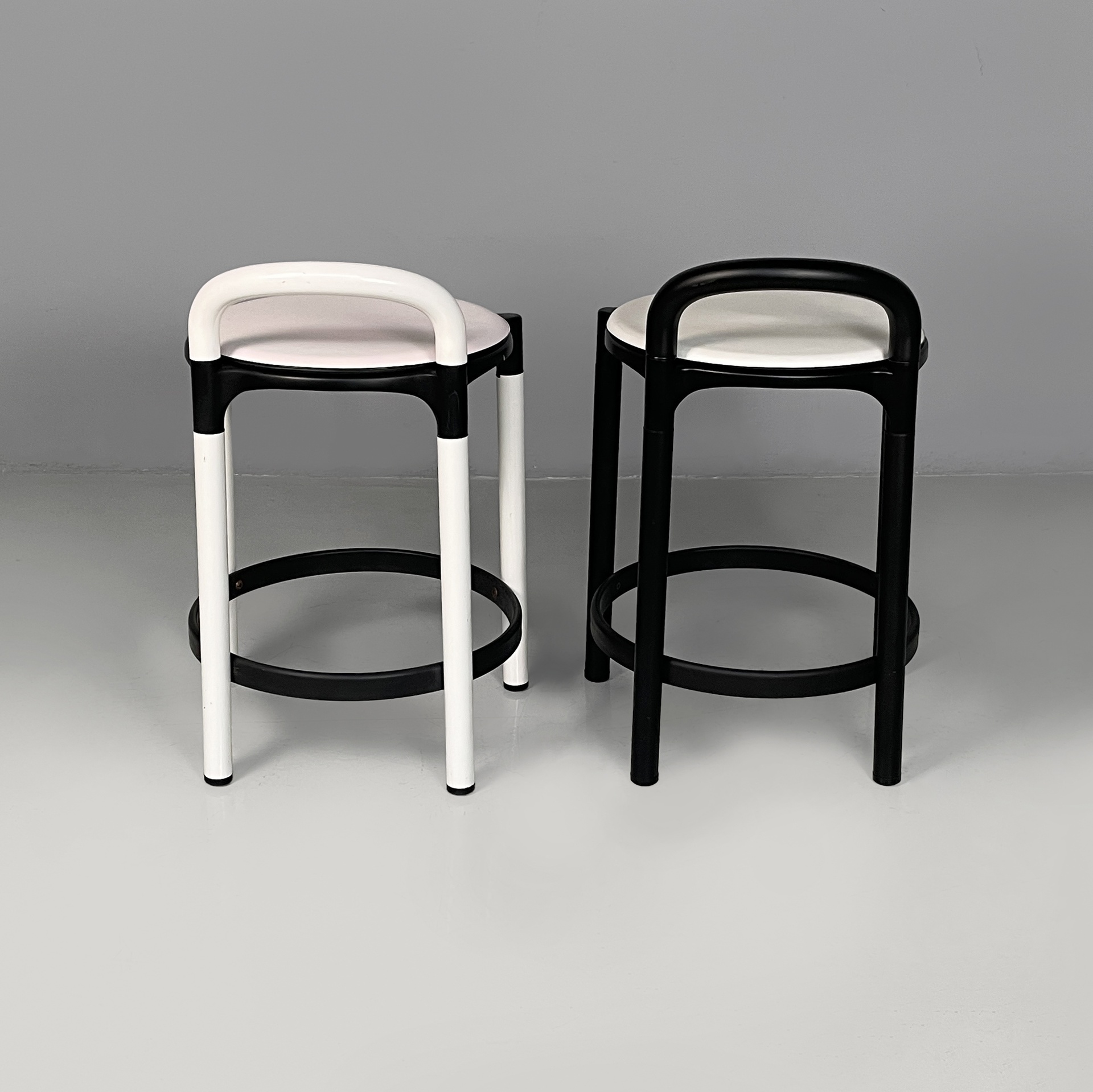 Coppia di sgabelli da bar con colori differenti. Uno sgabello presenta una seduta tonda, imbottita e rivestita in similpelle bianca, con struttura e zampe a sezione tonda in metallo e plastica nera. L’altro presenta una seduta sempre tonda, imbottita e rivestita in similpelle bianco-rosata, con struttura e zampe a sezione tonda in metallo bianco e plastica nera.