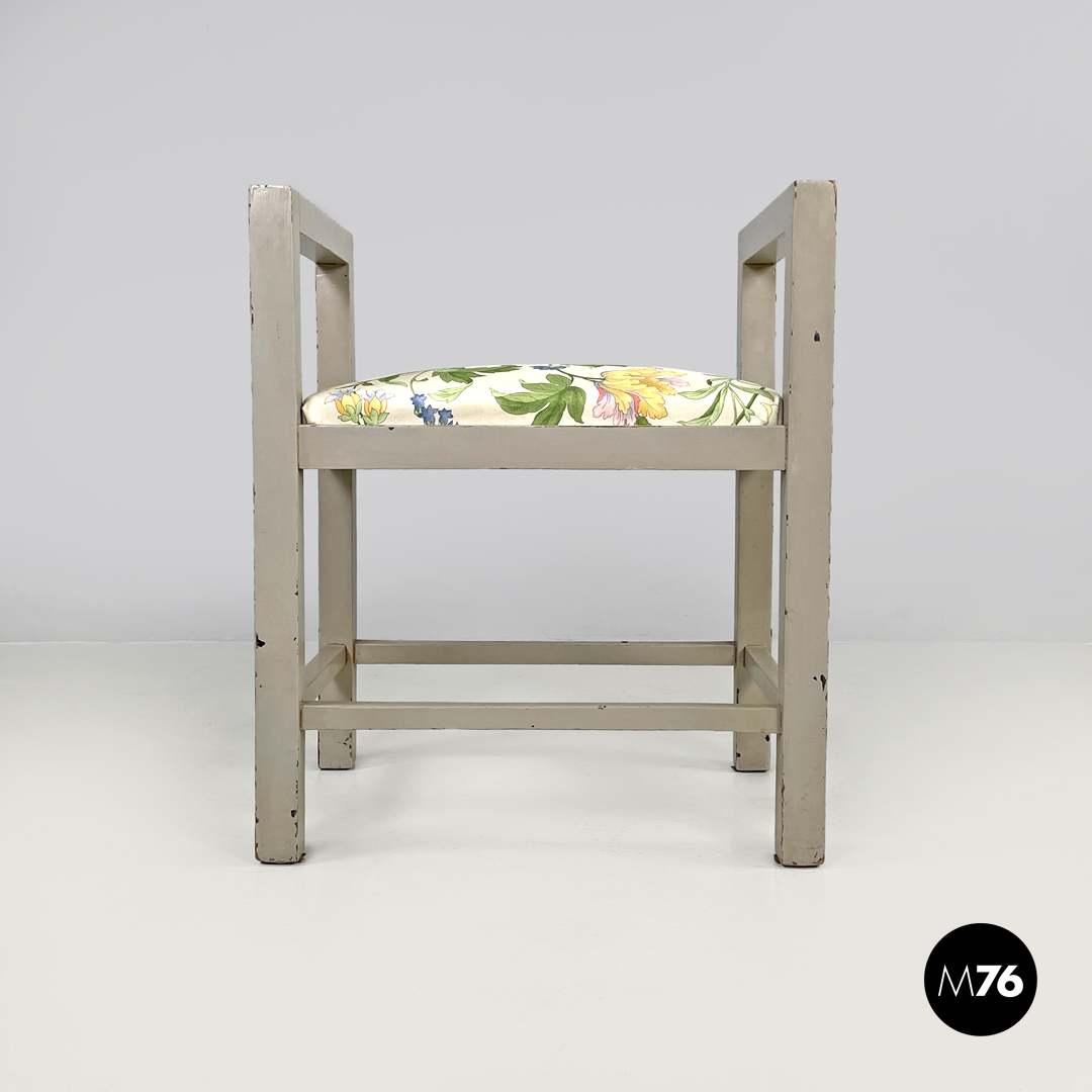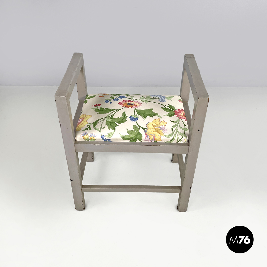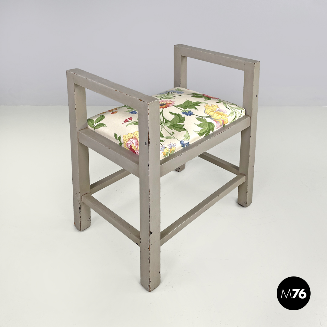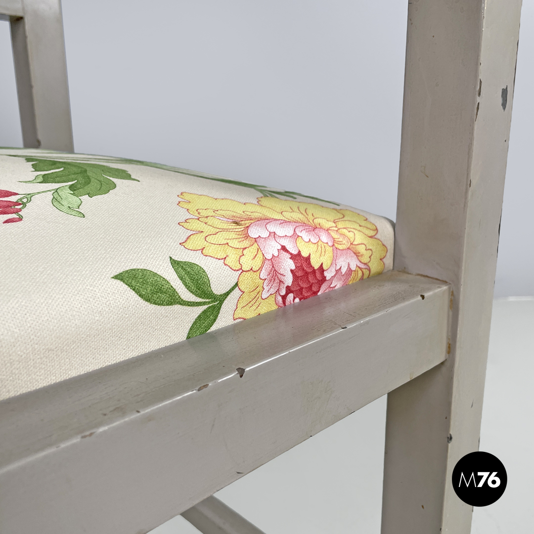 Coppia di sgabelli da tavolo con braccioli. La struttura è in legno a sezione quadrata verniciata grigia, nella parte alta ai lati della seduta sono presenti due braccioli, le quattro gambe sono unite da quattro listelli che fanno da poggiapiedi. Le sedute sono imbottite e rivestite con tessuto a sfondo beige con fantasia floreale dai colore verde, blu, rosso, rosa, giallo e arancione.