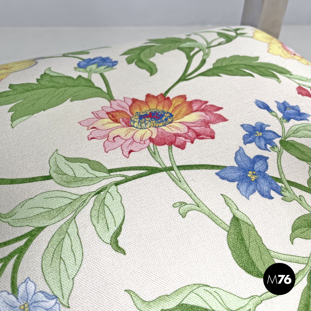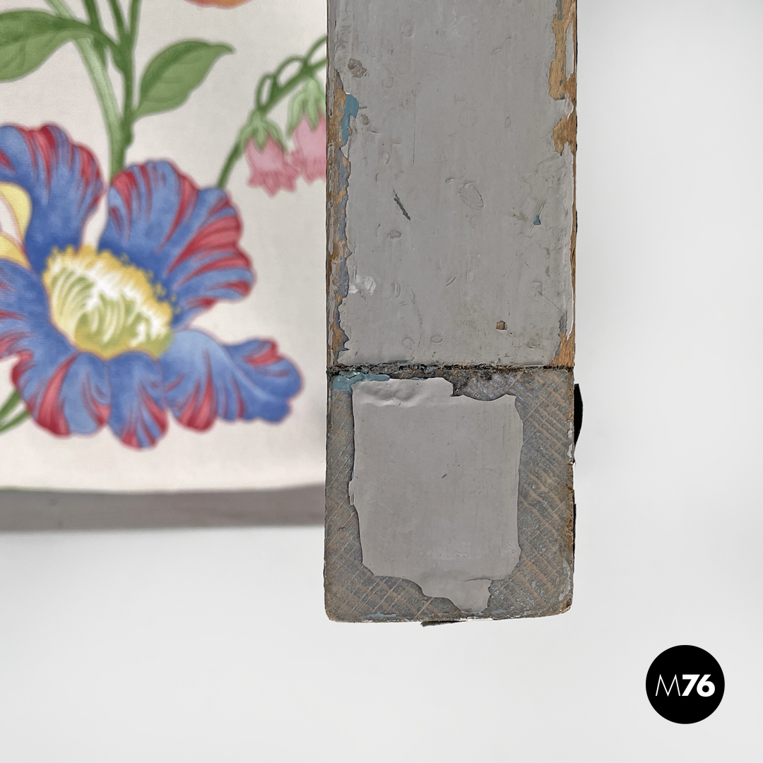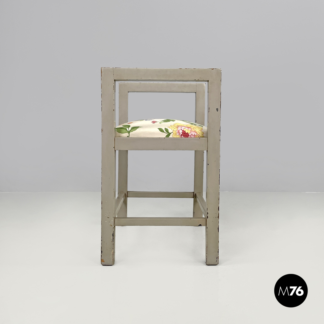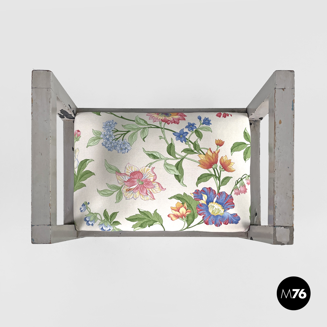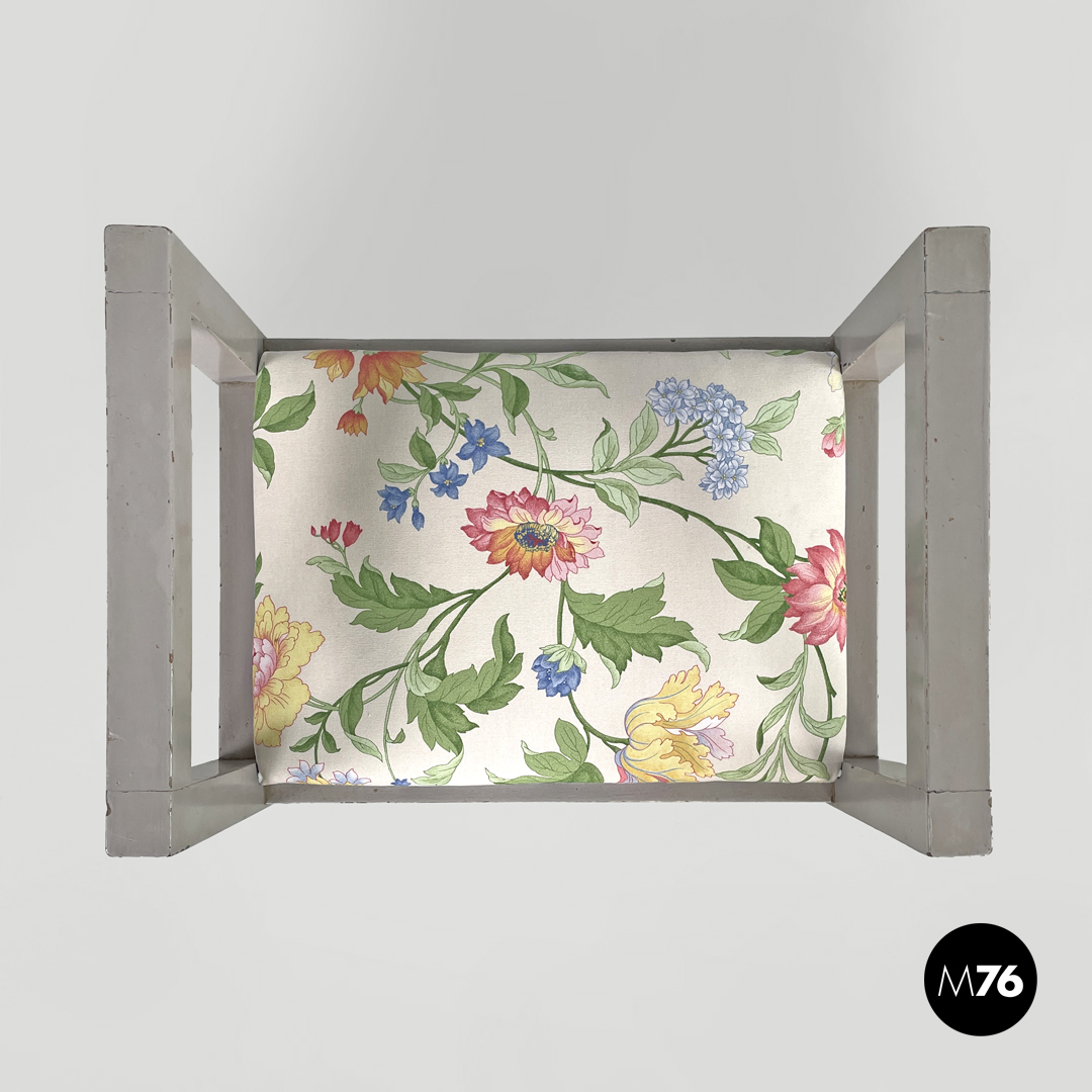 Coppia di sgabelli da tavolo con braccioli. La struttura è in legno a sezione quadrata verniciata grigia, nella parte alta ai lati della seduta sono presenti due braccioli, le quattro gambe sono unite da quattro listelli che fanno da poggiapiedi. Le sedute sono imbottite e rivestite con tessuto a sfondo beige con fantasia floreale dai colore verde, blu, rosso, rosa, giallo e arancione.