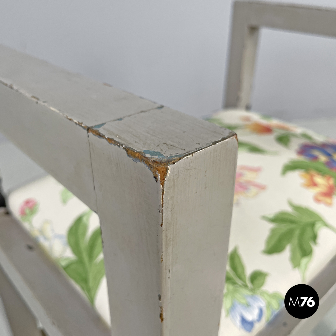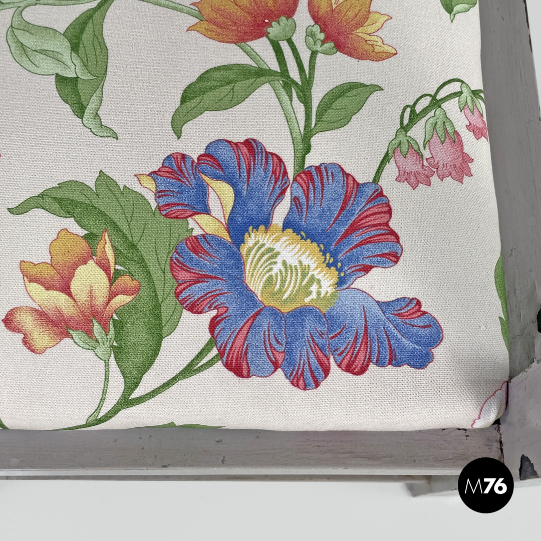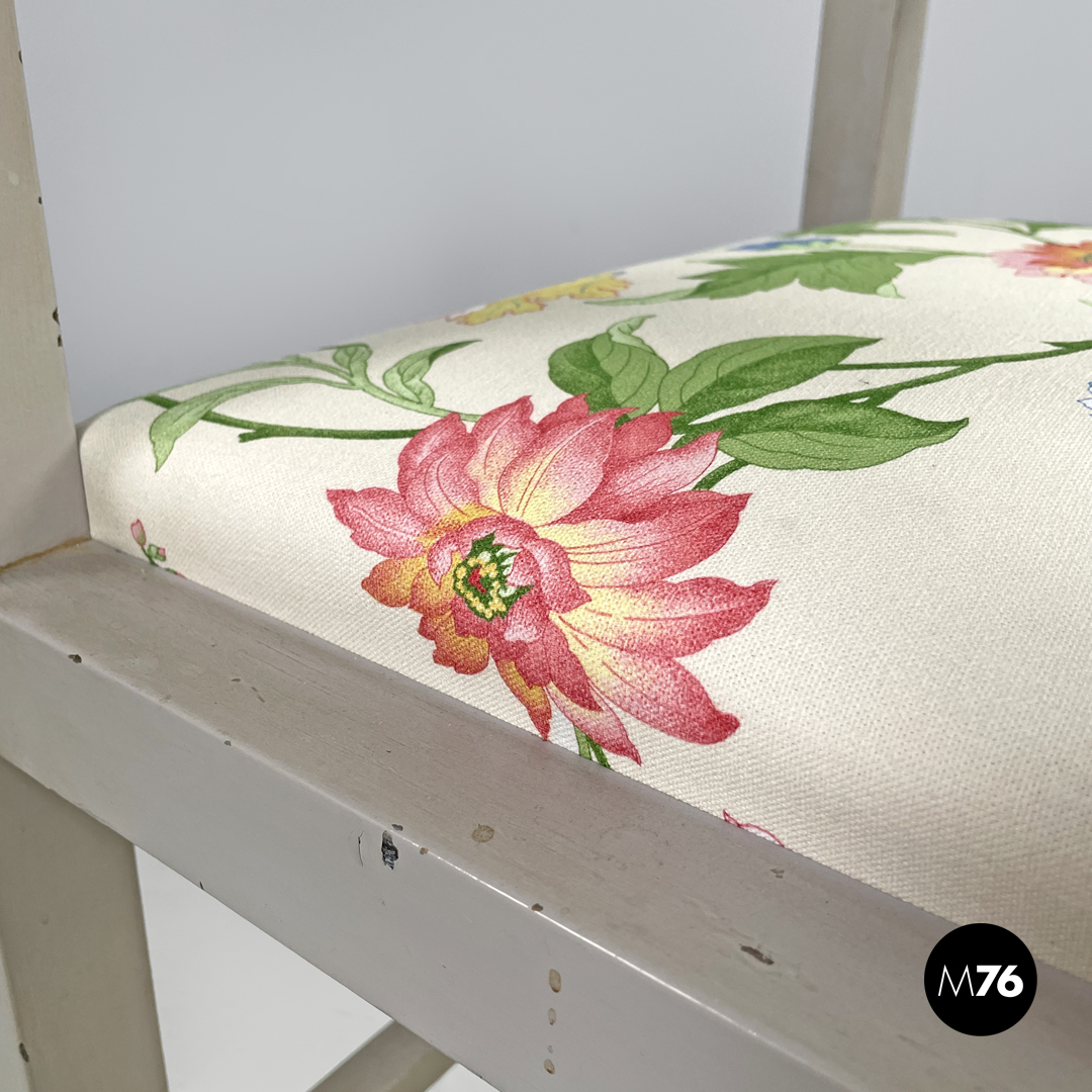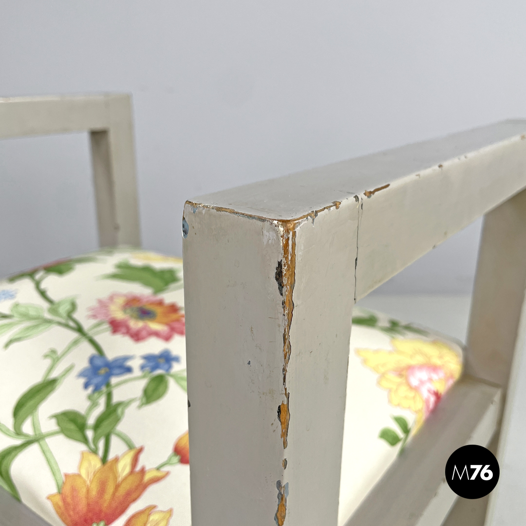 Coppia di sgabelli da tavolo con braccioli. La struttura è in legno a sezione quadrata verniciata grigia, nella parte alta ai lati della seduta sono presenti due braccioli, le quattro gambe sono unite da quattro listelli che fanno da poggiapiedi. Le sedute sono imbottite e rivestite con tessuto a sfondo beige con fantasia floreale dai colore verde, blu, rosso, rosa, giallo e arancione.