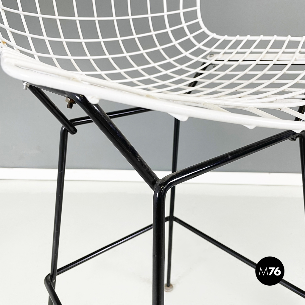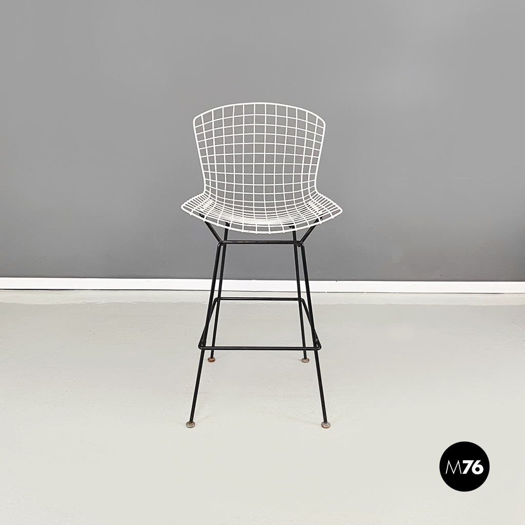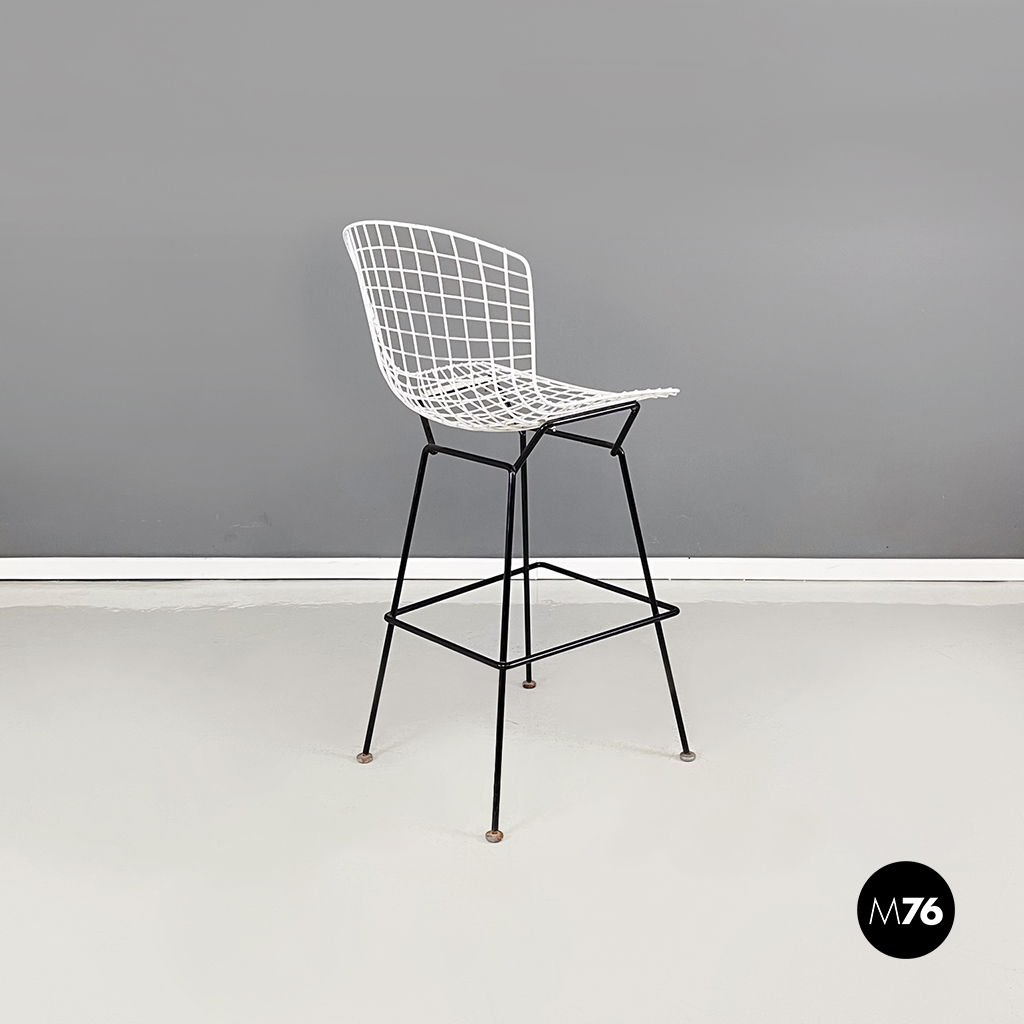 Set di quattro sgabelli alti da bar con seduta e schienale composti da una rete in tondino di metallo verniciato bianco. La struttura è in tondino di metallo verniciato nero. Poggiapiedi presente alla base dello sgabello. Piedini tondi in ferro.