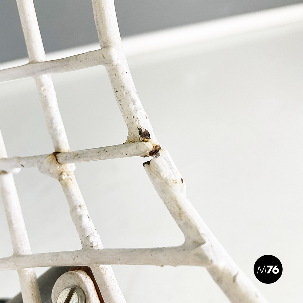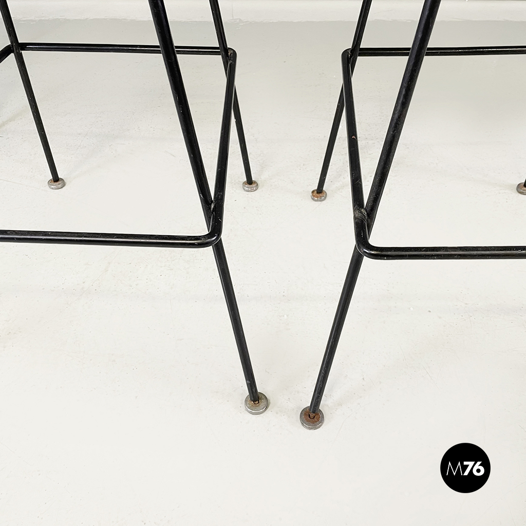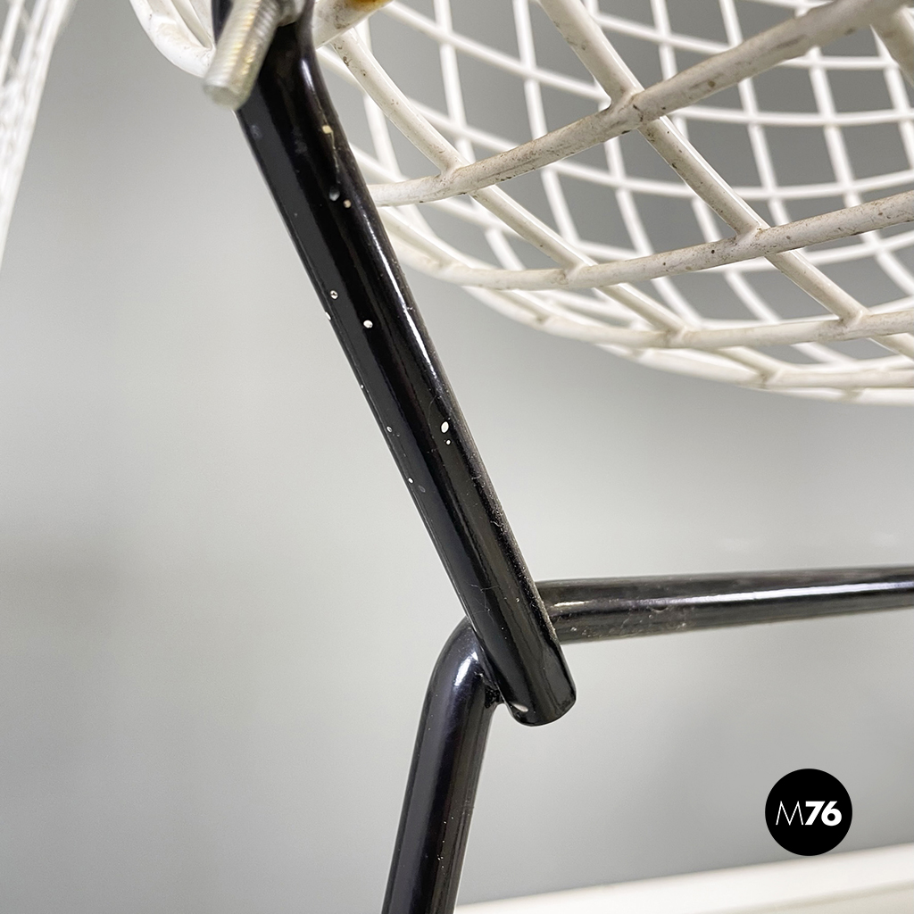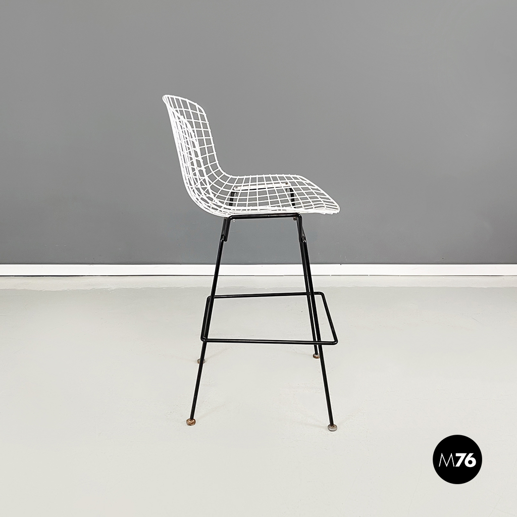 Set di quattro sgabelli alti da bar con seduta e schienale composti da una rete in tondino di metallo verniciato bianco. La struttura è in tondino di metallo verniciato nero. Poggiapiedi presente alla base dello sgabello. Piedini tondi in ferro.