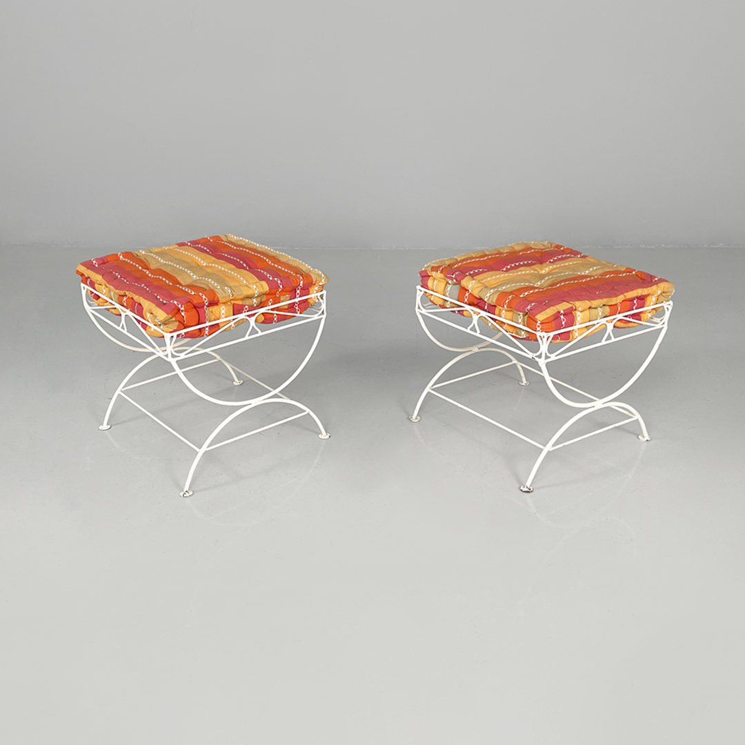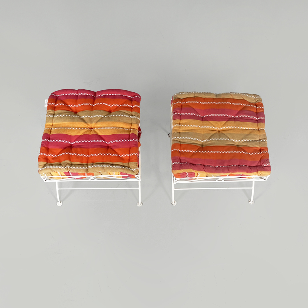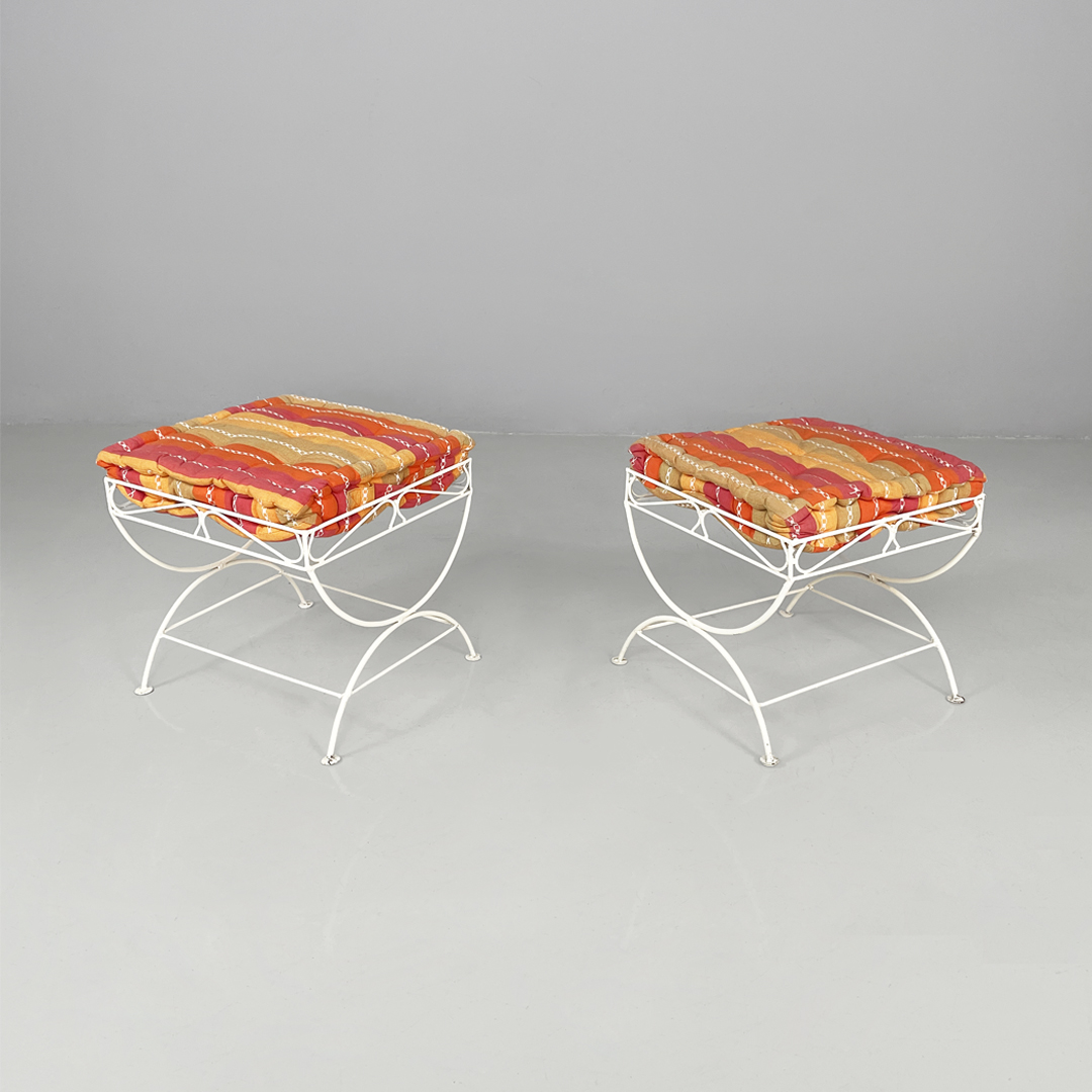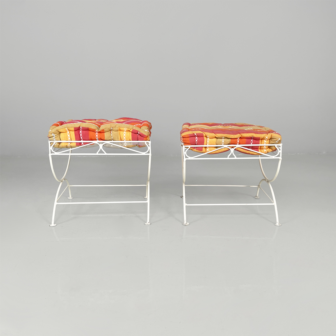 Coppia di sgabelli da tavolo con struttura interamente realizzata in ferro battuto verniciato bianco. La seduta, la quale presenta un motivo decorativo, accoglie un cuscino quadrato rivestito in tessuto a righe dai colori caldi. Le zampe hanno forme curve e terminano con dei piedini tondi piatti. Adatte per essere usate in giardino o in esterno, oltre che per uso domestico interno.