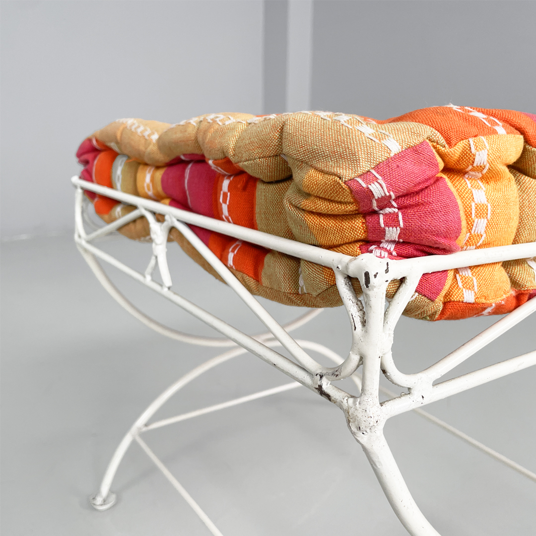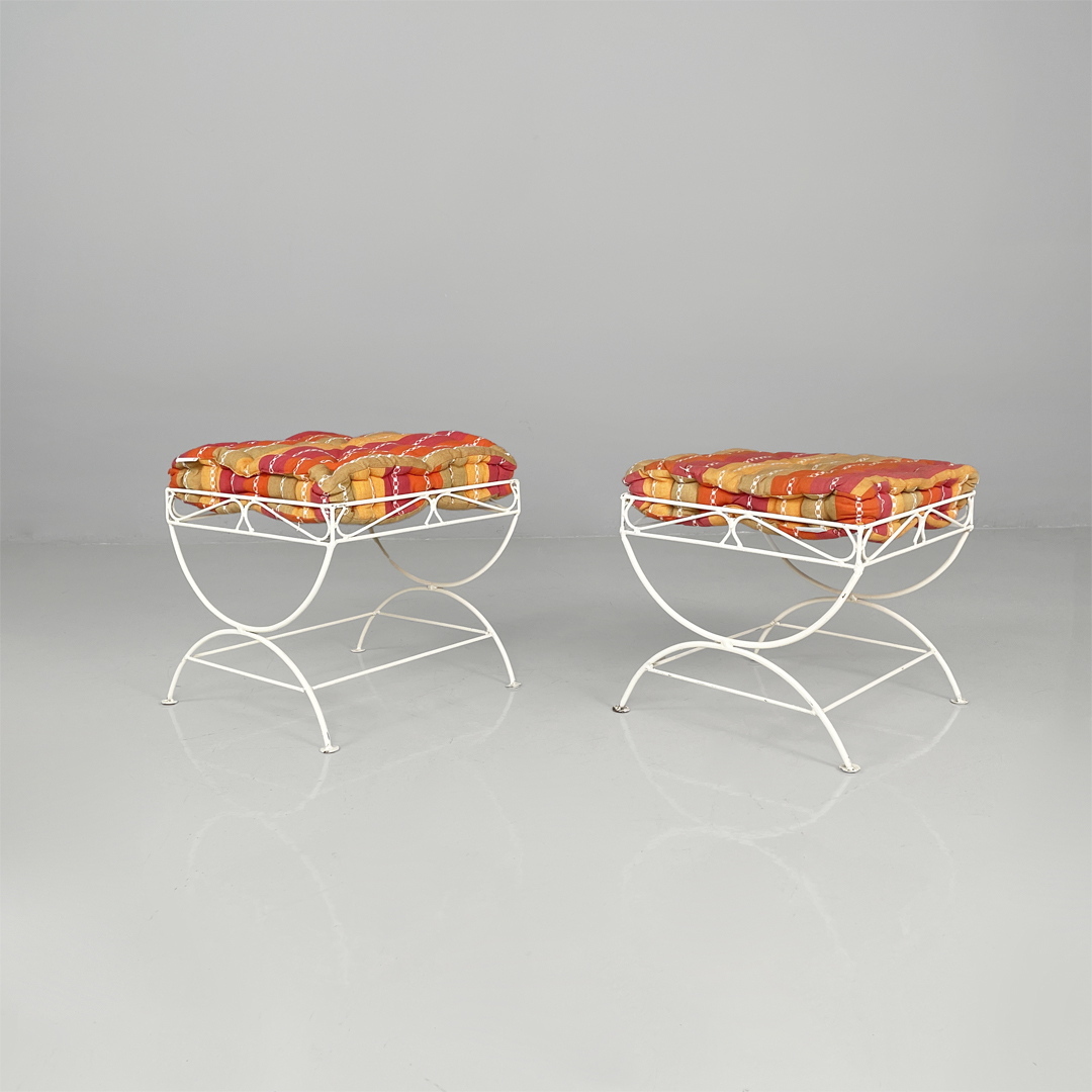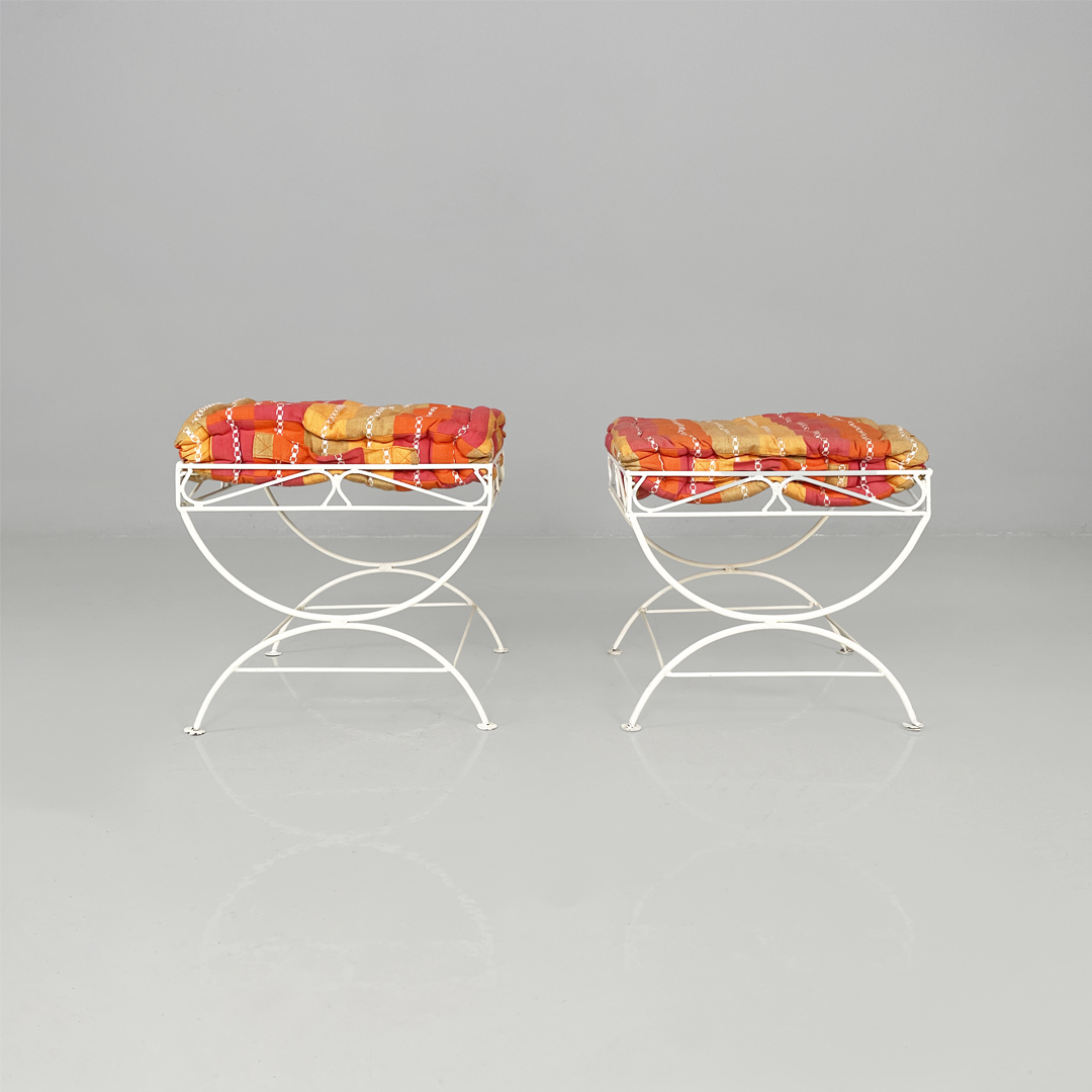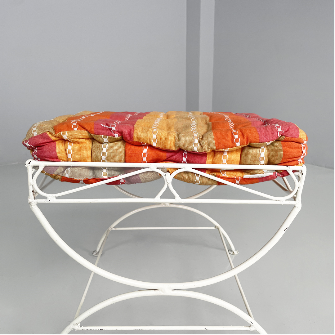 Coppia di sgabelli da tavolo con struttura interamente realizzata in ferro battuto verniciato bianco. La seduta, la quale presenta un motivo decorativo, accoglie un cuscino quadrato rivestito in tessuto a righe dai colori caldi. Le zampe hanno forme curve e terminano con dei piedini tondi piatti. Adatte per essere usate in giardino o in esterno, oltre che per uso domestico interno.