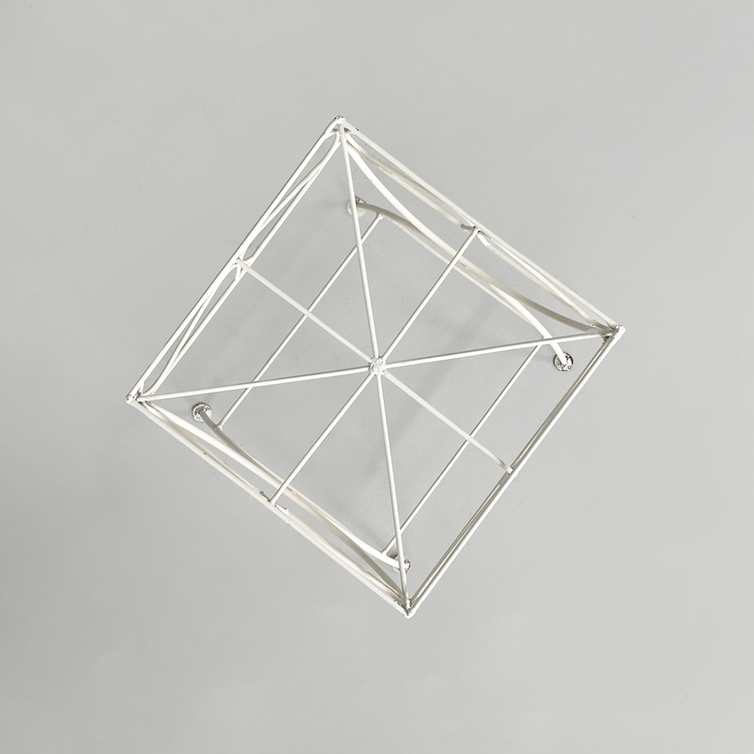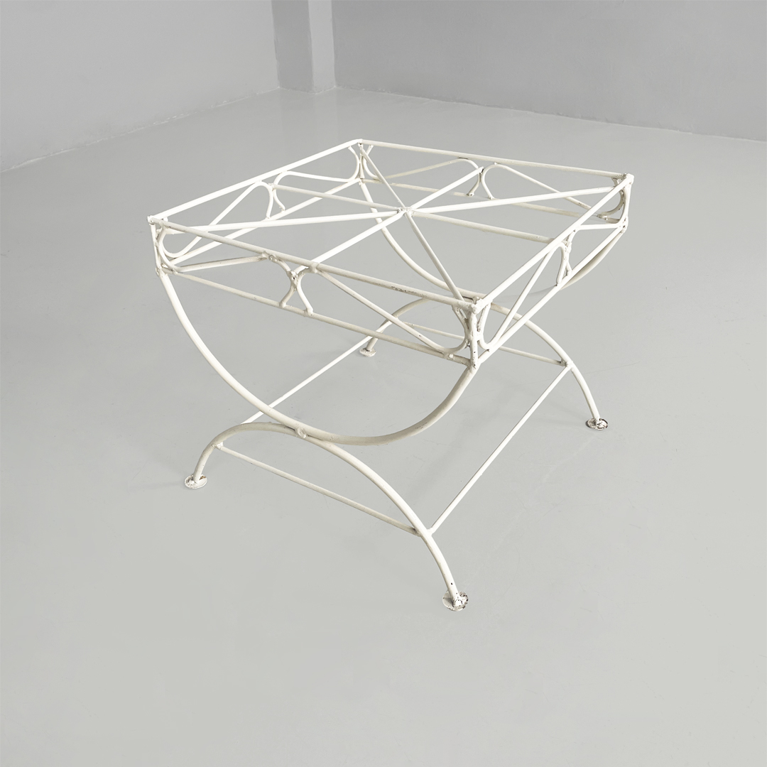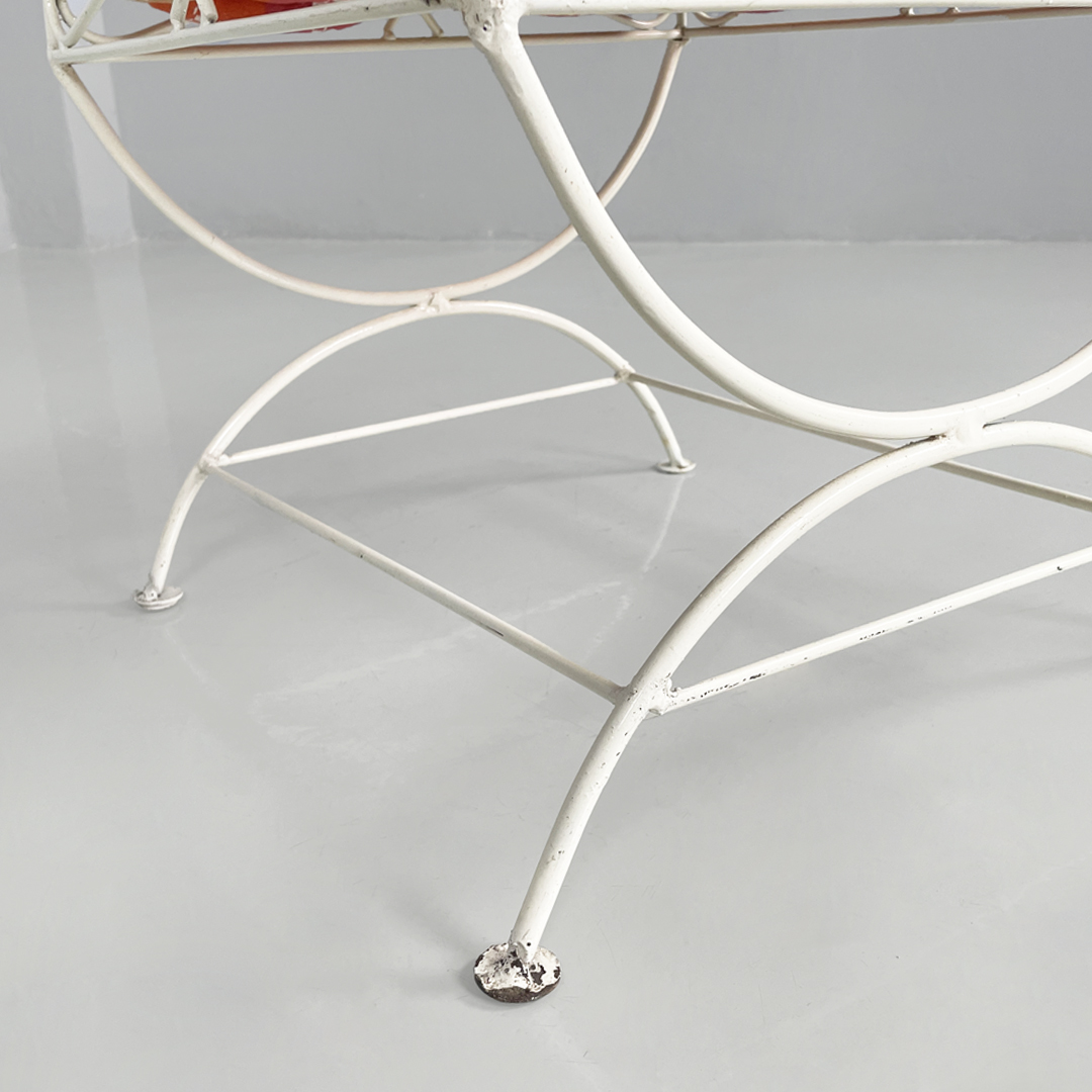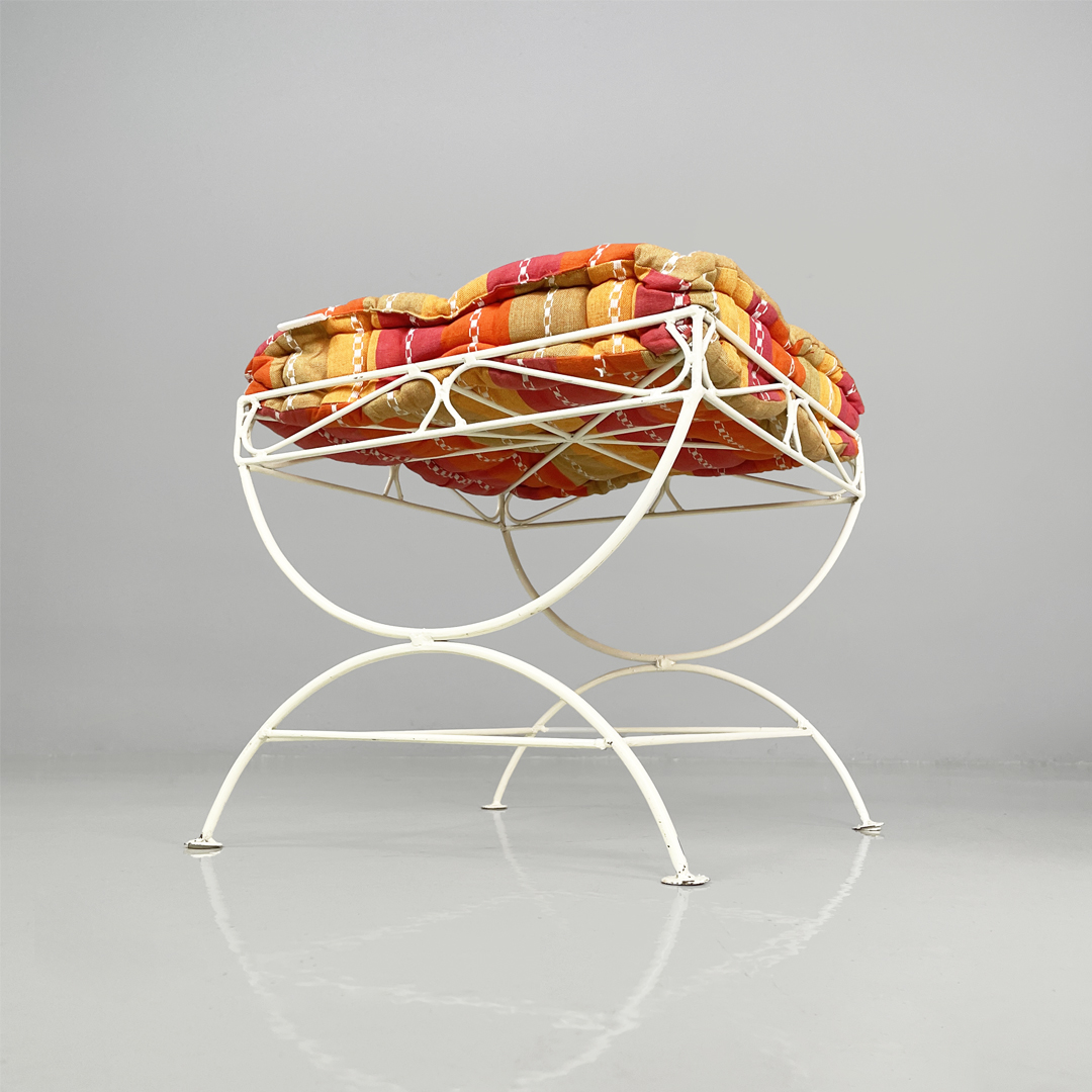 Coppia di sgabelli da tavolo con struttura interamente realizzata in ferro battuto verniciato bianco. La seduta, la quale presenta un motivo decorativo, accoglie un cuscino quadrato rivestito in tessuto a righe dai colori caldi. Le zampe hanno forme curve e terminano con dei piedini tondi piatti. Adatte per essere usate in giardino o in esterno, oltre che per uso domestico interno.