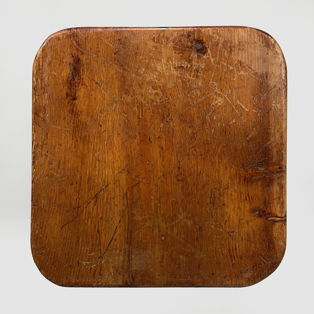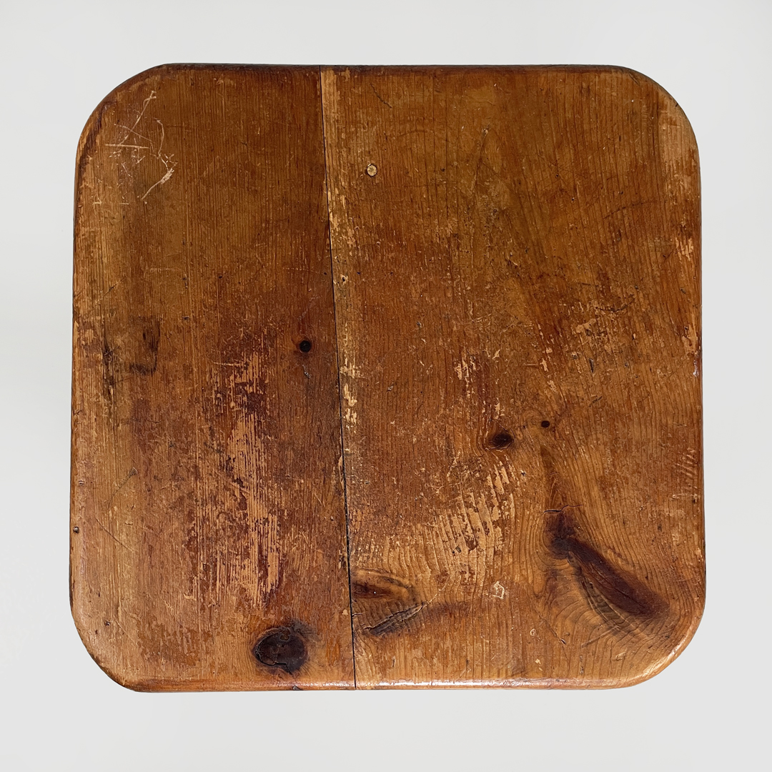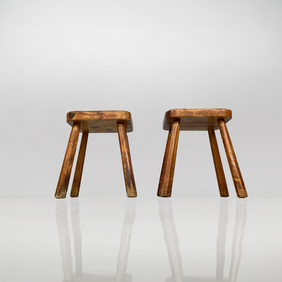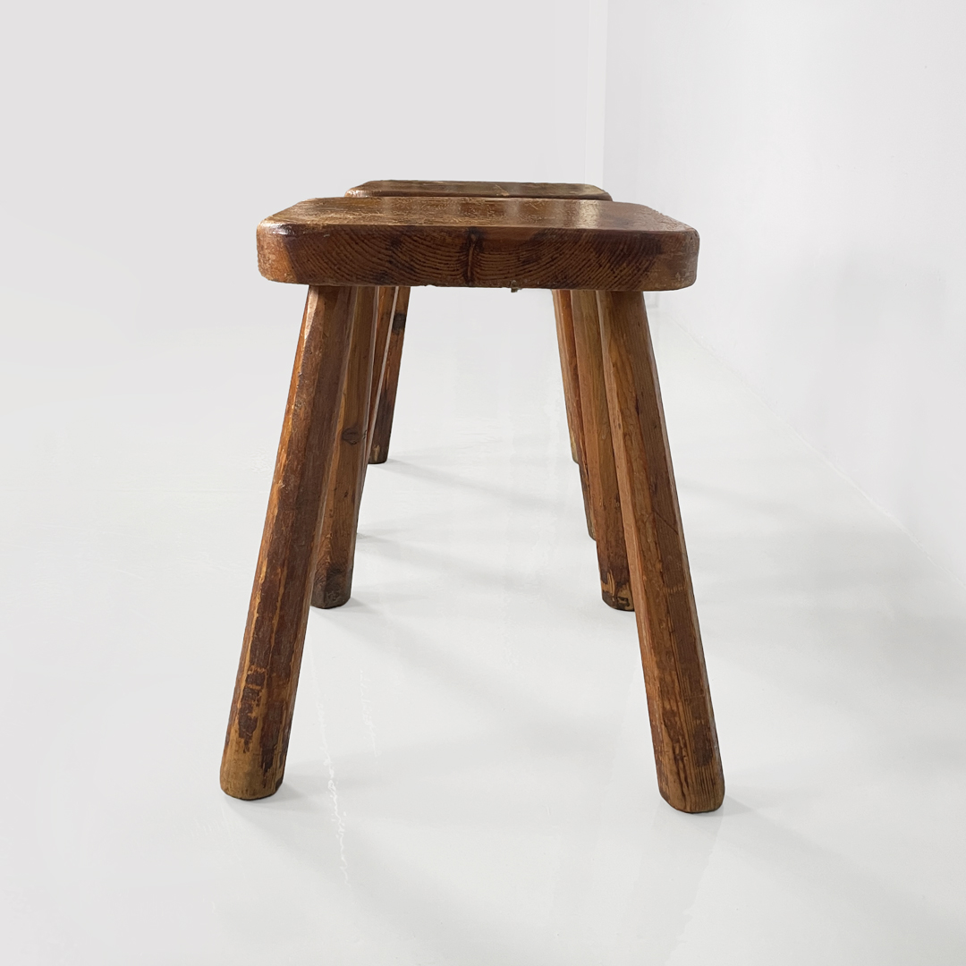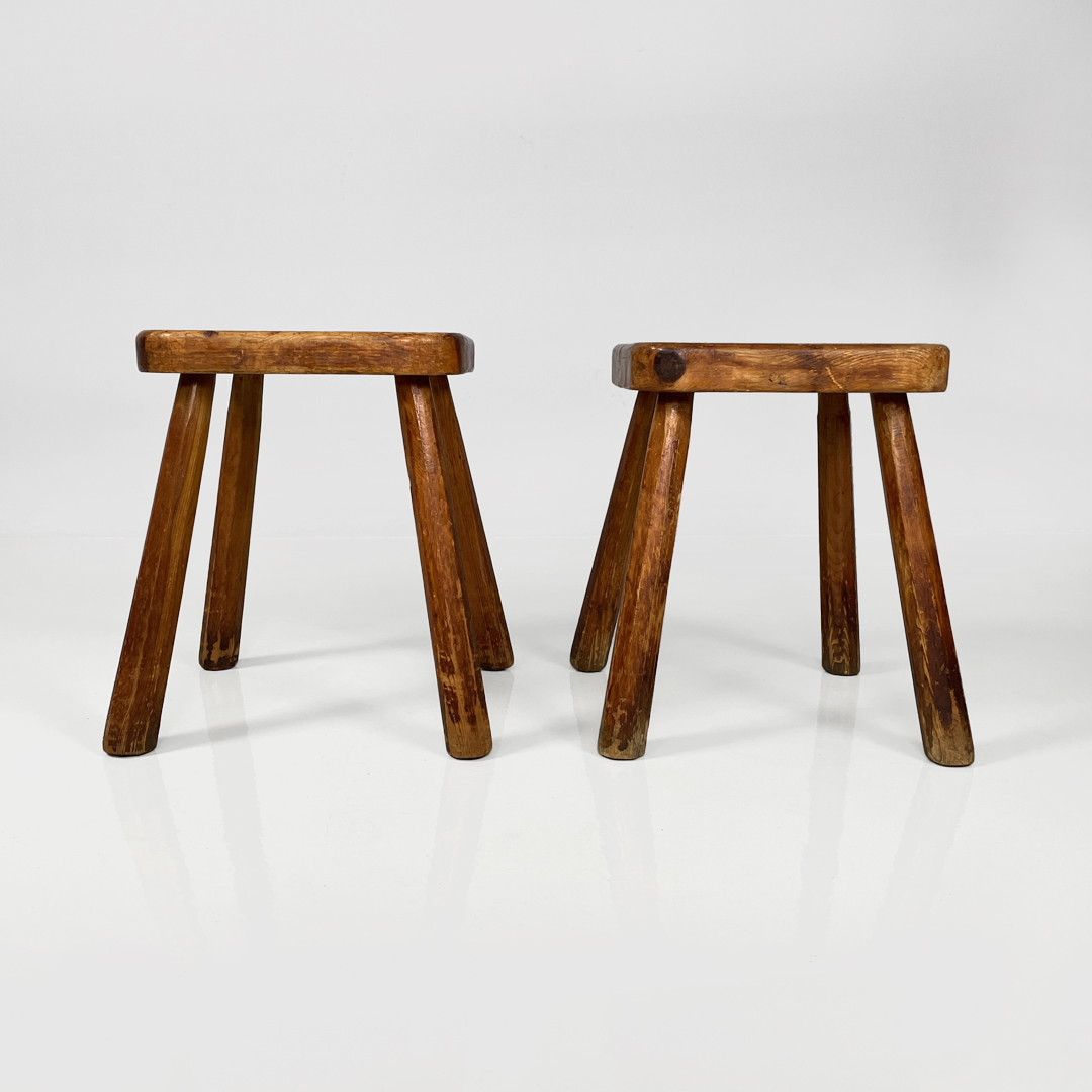 Coppia di sgabelli rustici da tavolo in legno con seduta quadrata stondata e quattro gambe a sezione circolare che si allargano verso l’esterno.