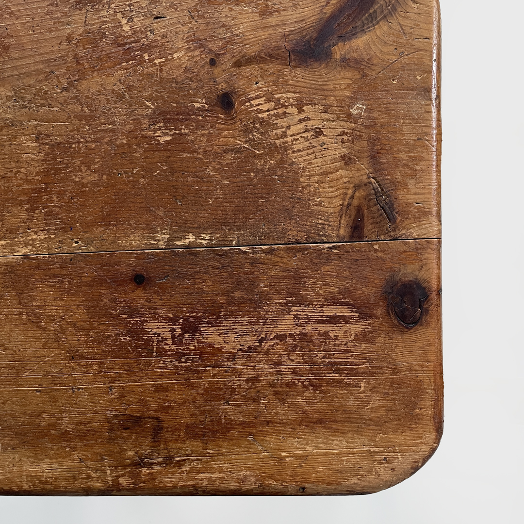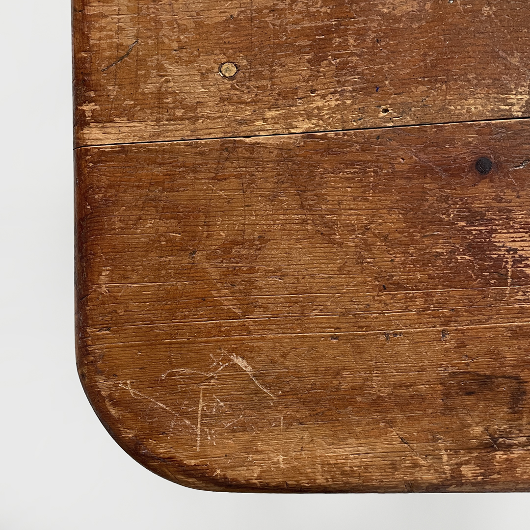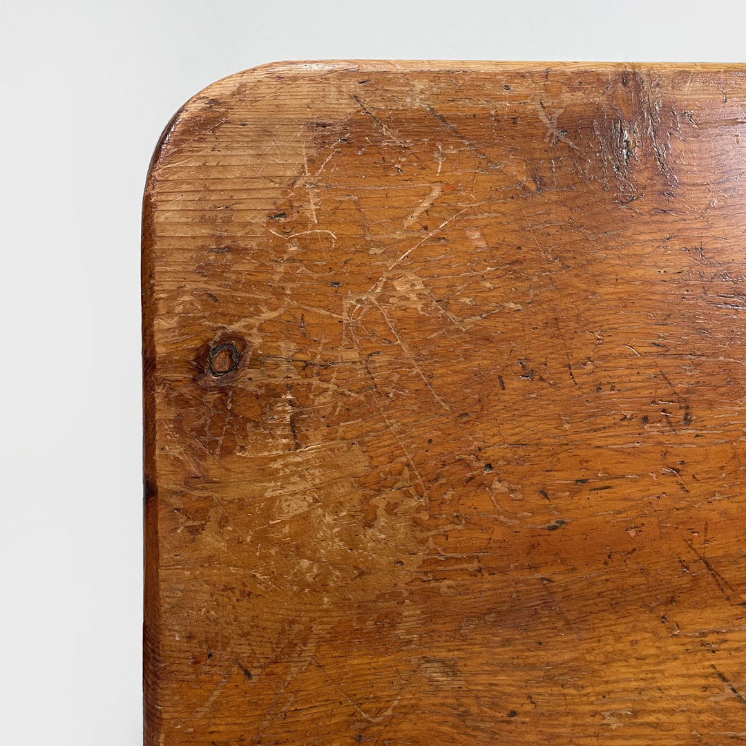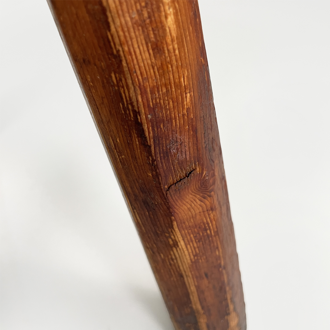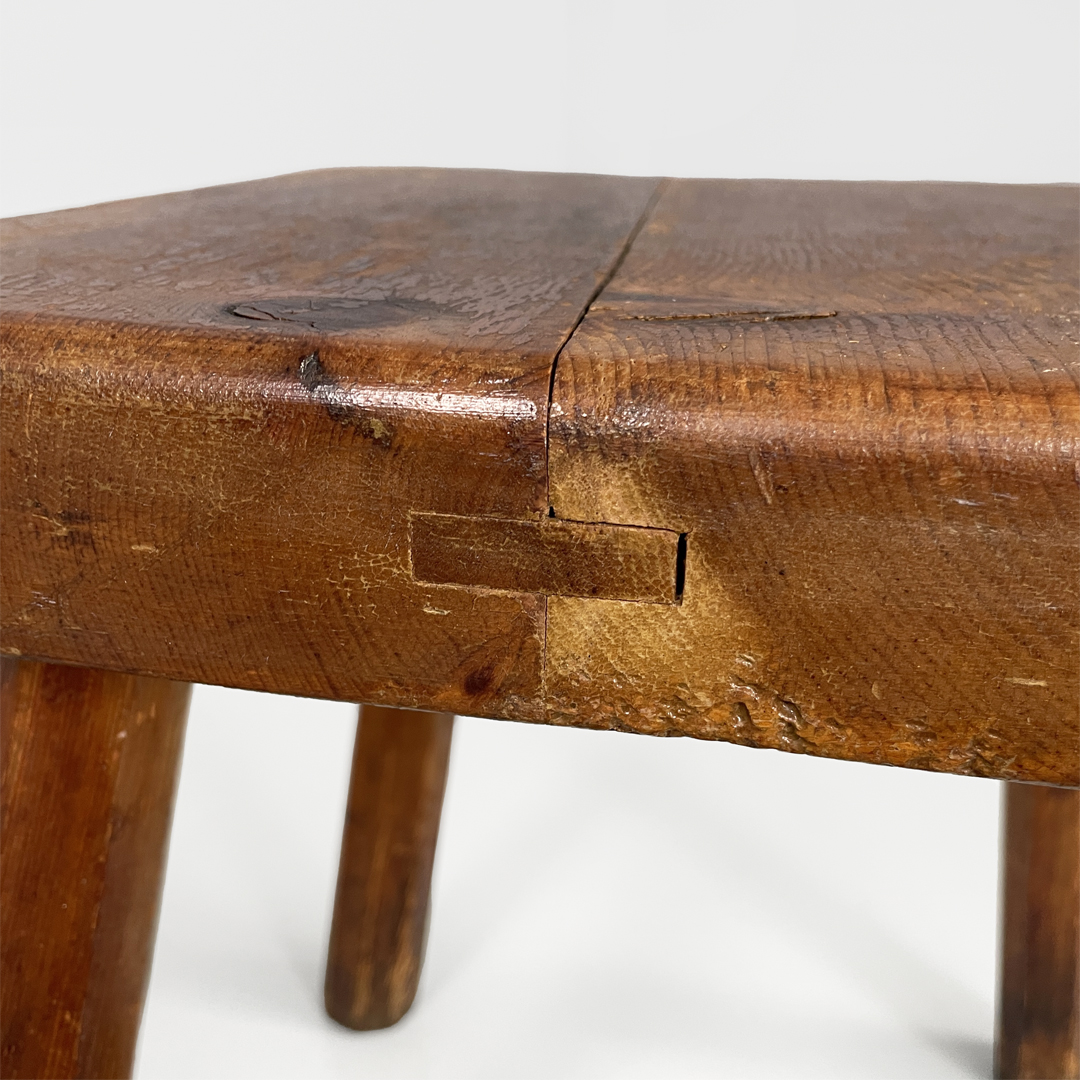 Coppia di sgabelli rustici da tavolo in legno con seduta quadrata stondata e quattro gambe a sezione circolare che si allargano verso l’esterno.