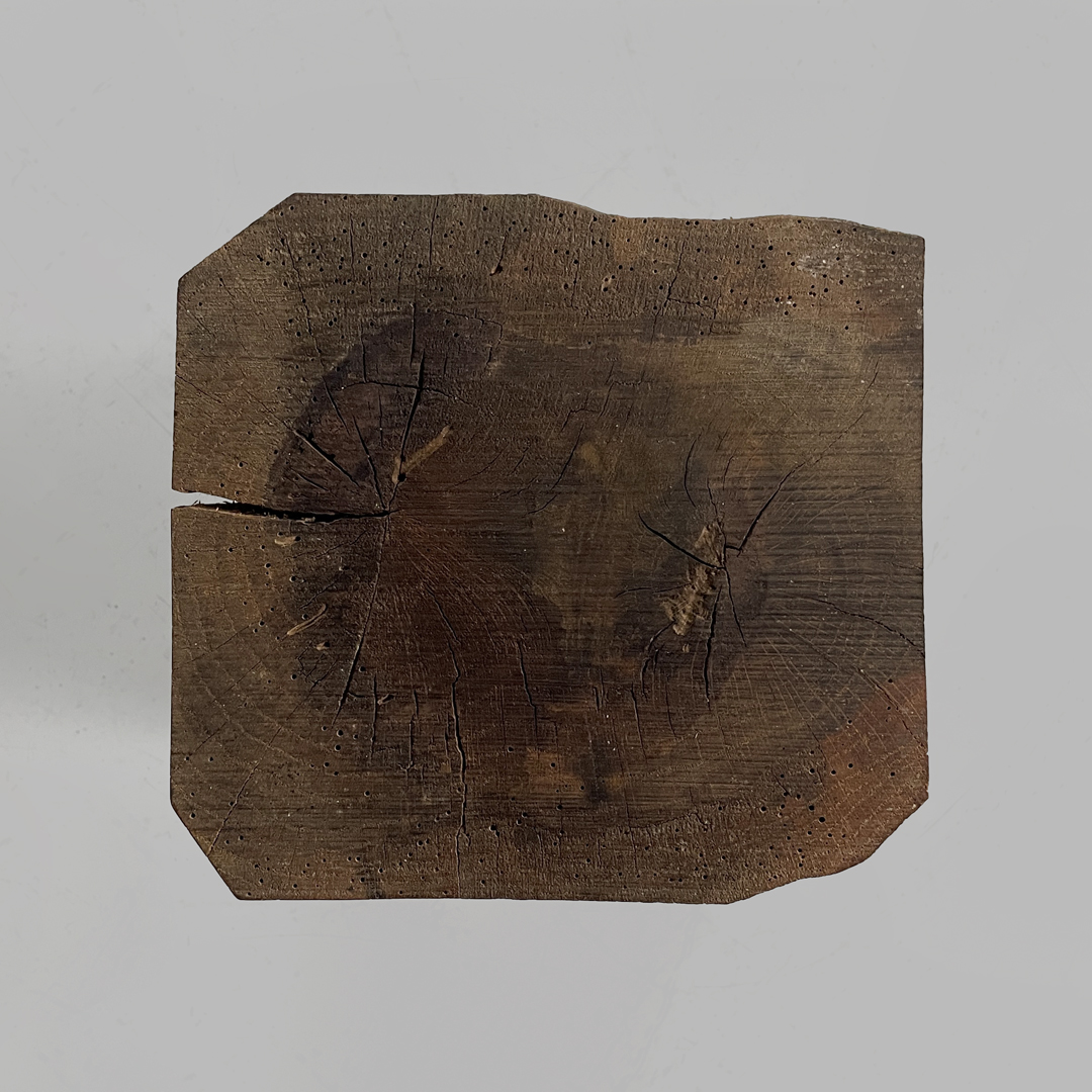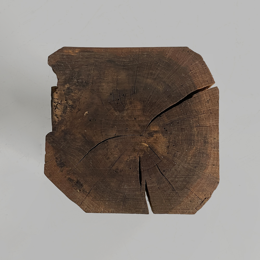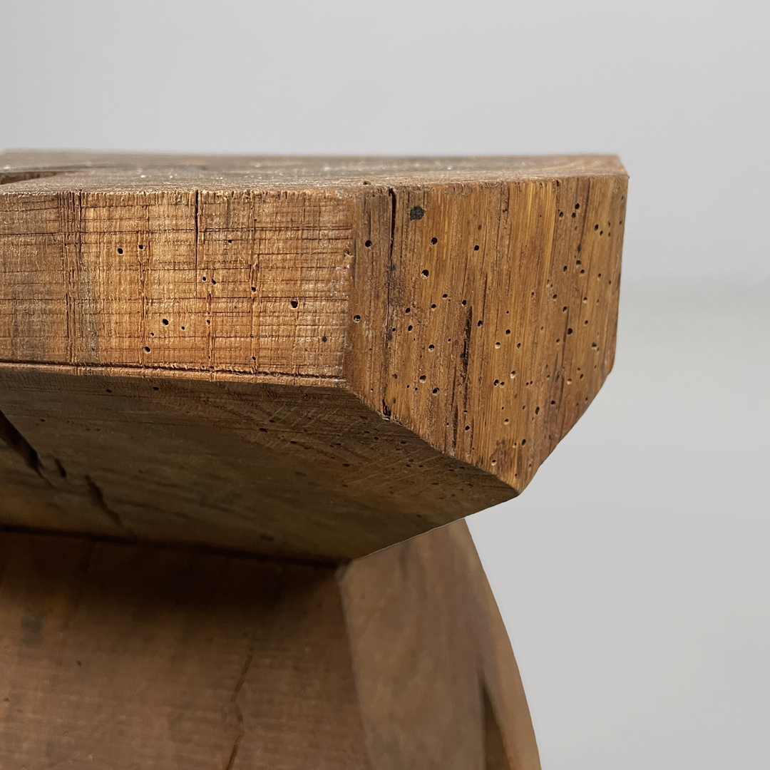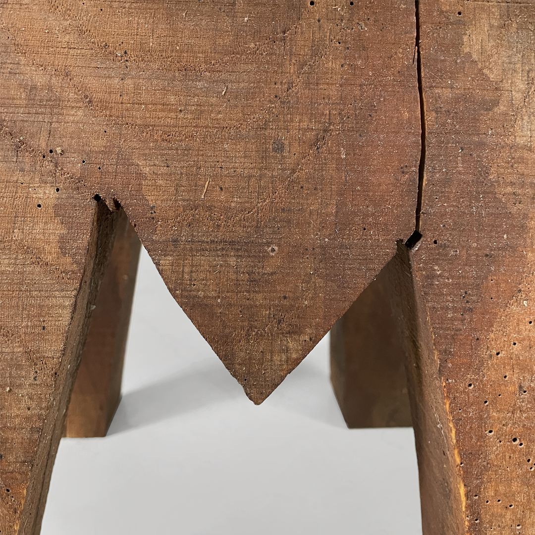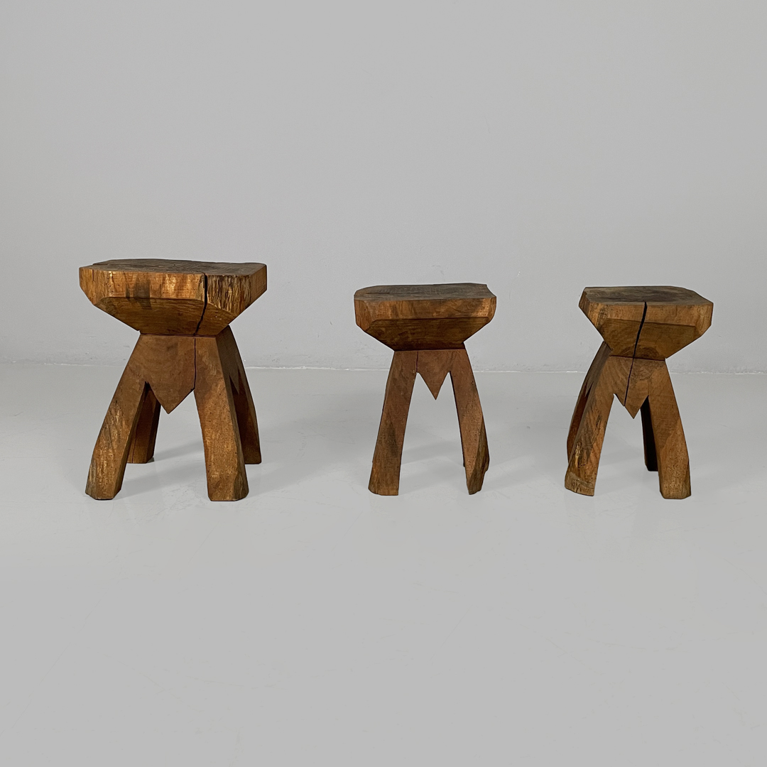 Set di tre sgabelli in legno tenero. Ogni pezzo è realizzato da un unico blocco di legno con seduta spessa dalla forma irregolare. La base è composta da robuste gambe sagomate che si aprono verso l’esterno, unite da intagli geometrici.