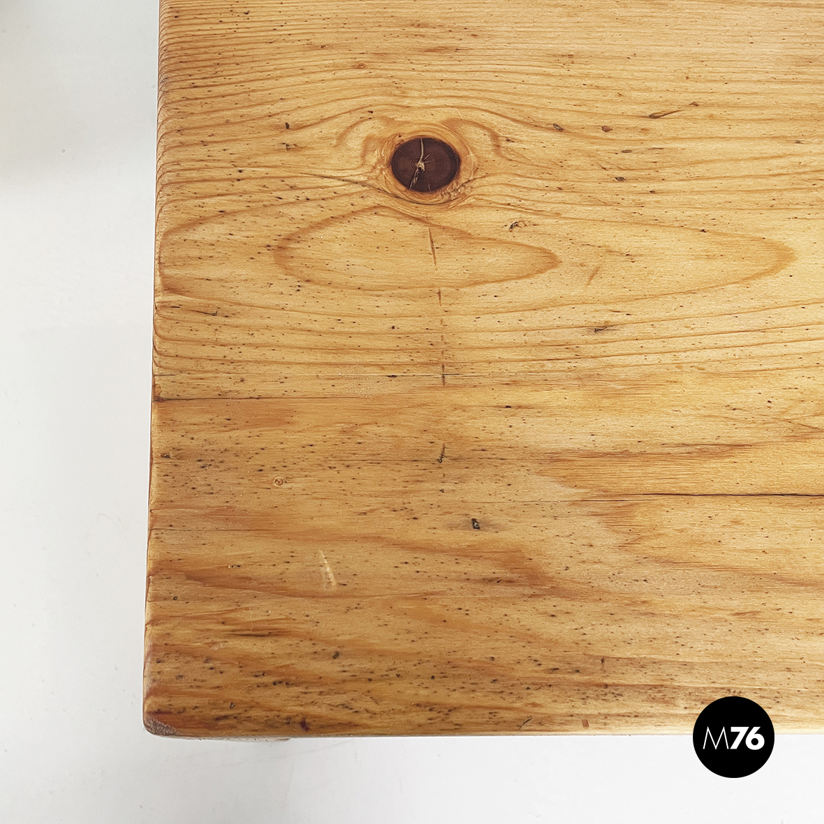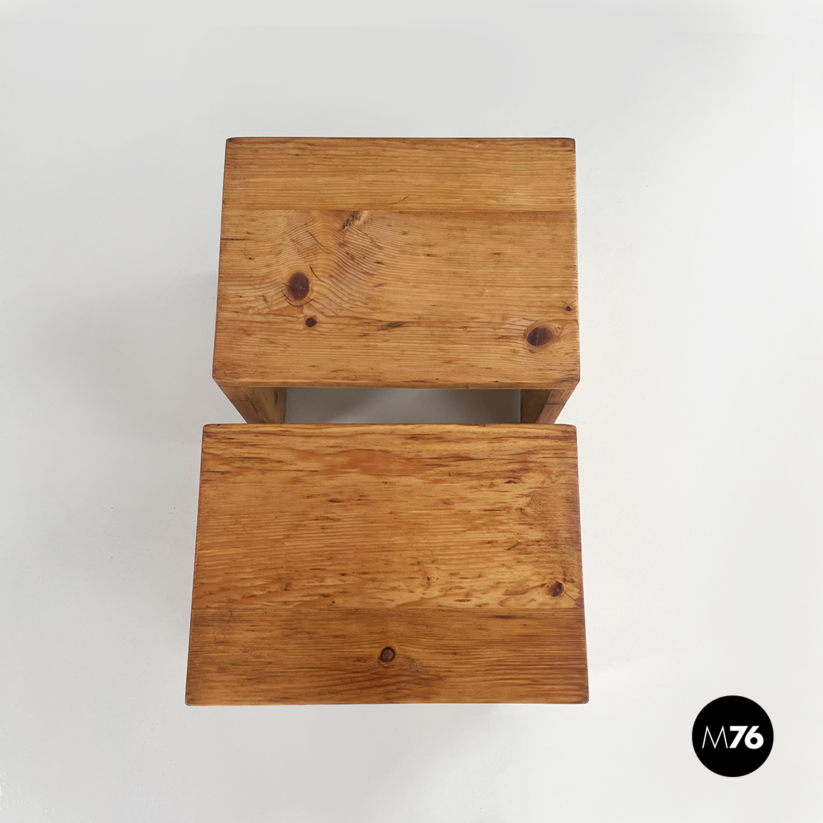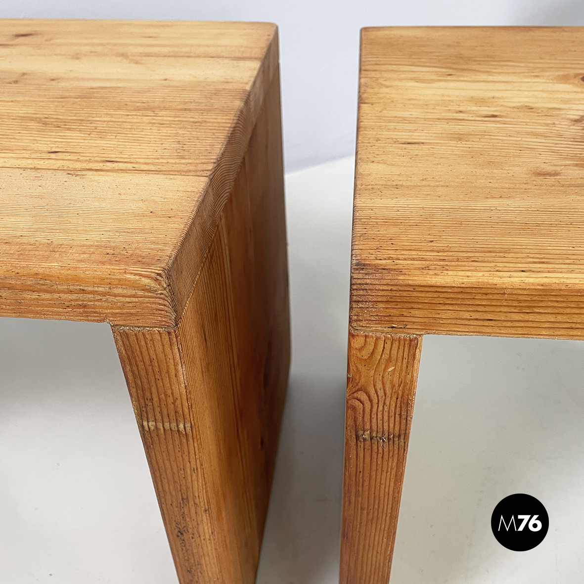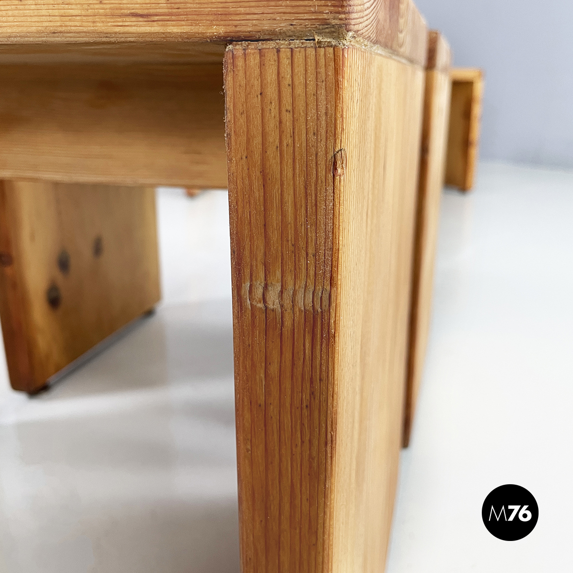 Set di sei sgabelli da tavolo squadrati in legno massello. La seduta rettangolare è sostenuta da due zampe a sezione rettangolare. Piedini tondi in metallo.