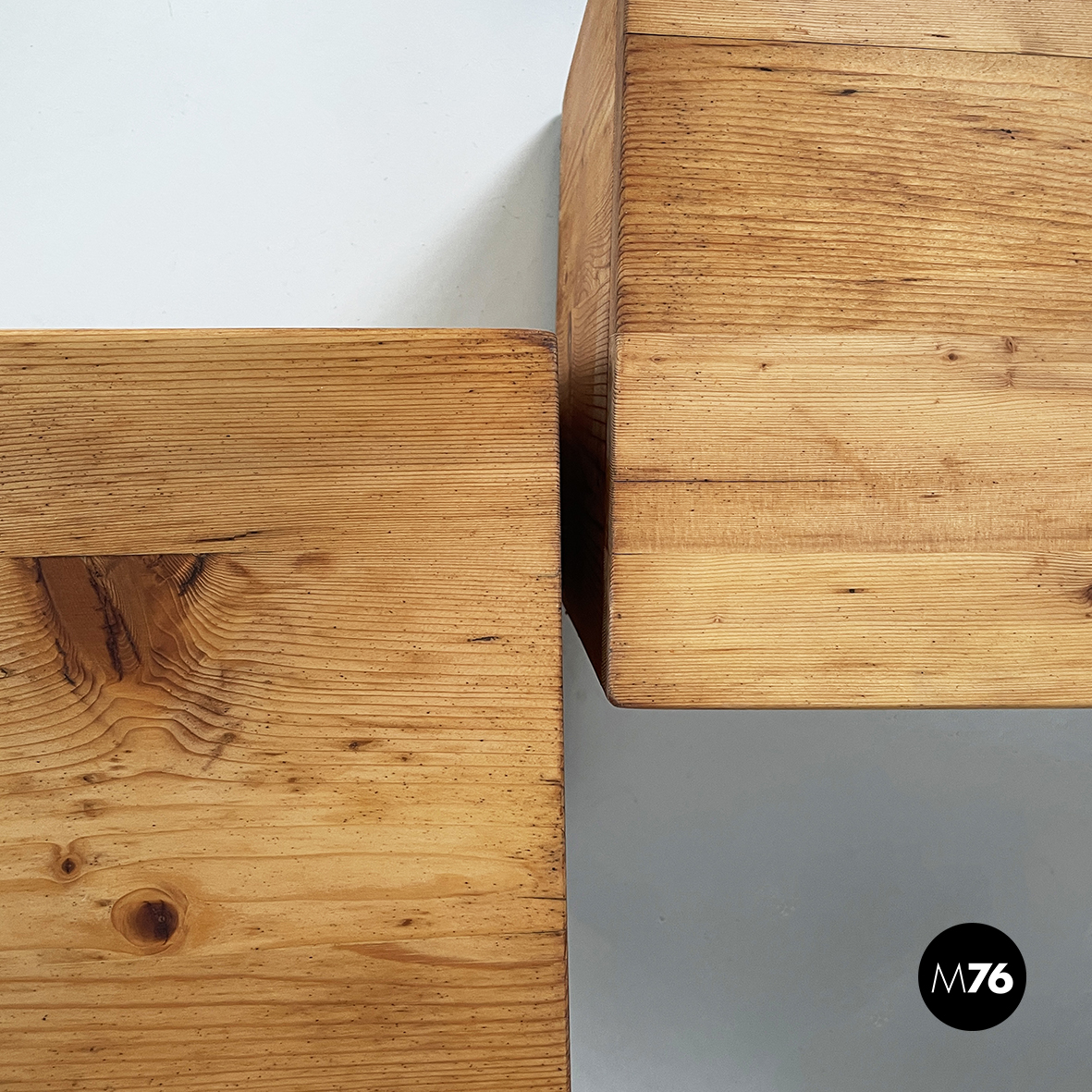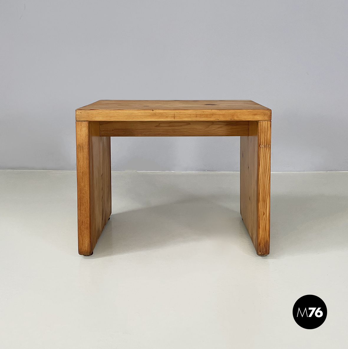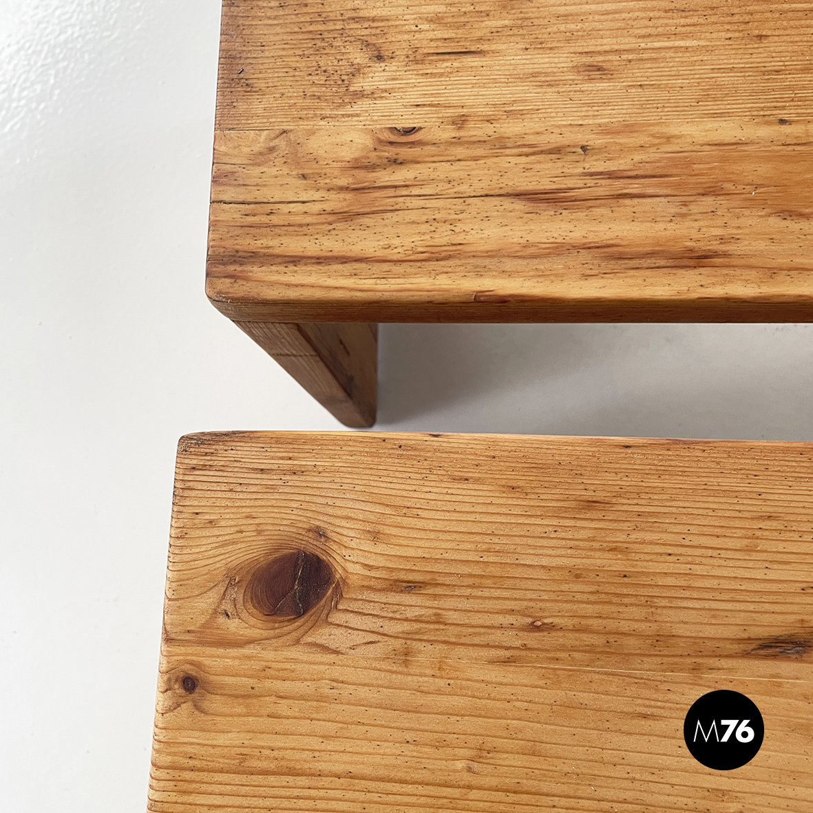 Set di sei sgabelli da tavolo squadrati in legno massello. La seduta rettangolare è sostenuta da due zampe a sezione rettangolare. Piedini tondi in metallo.