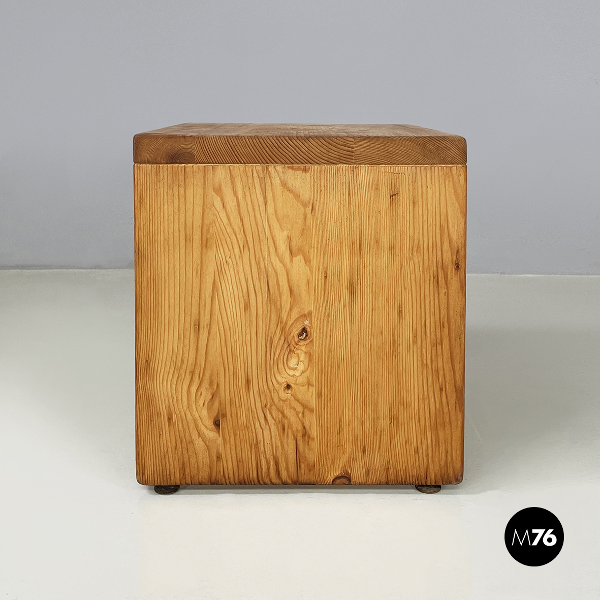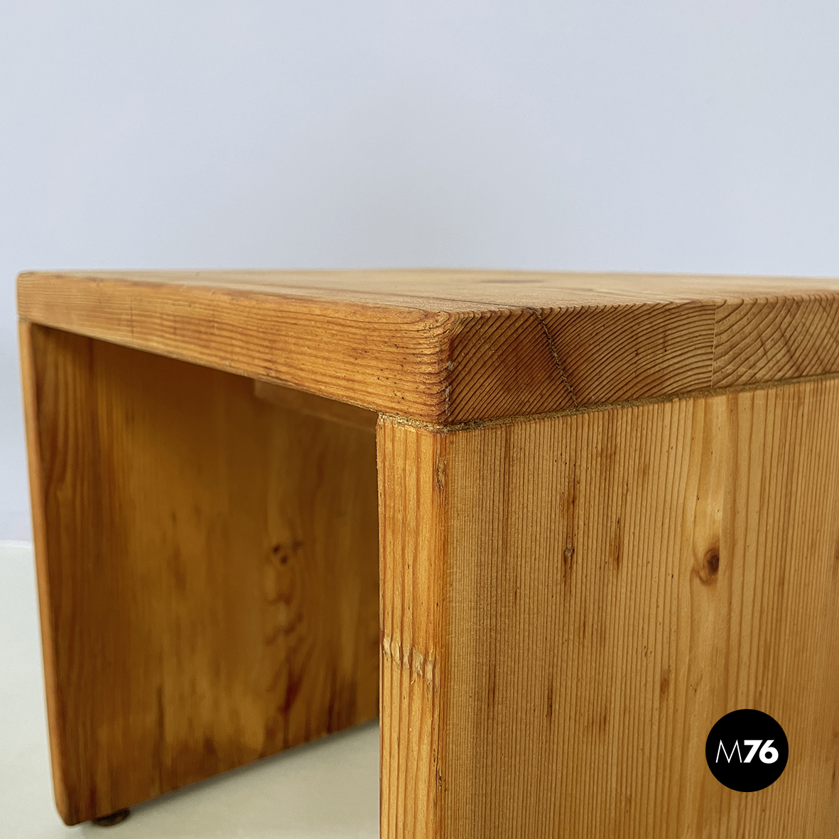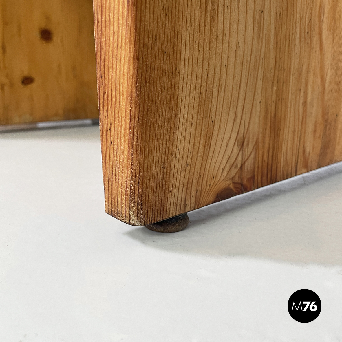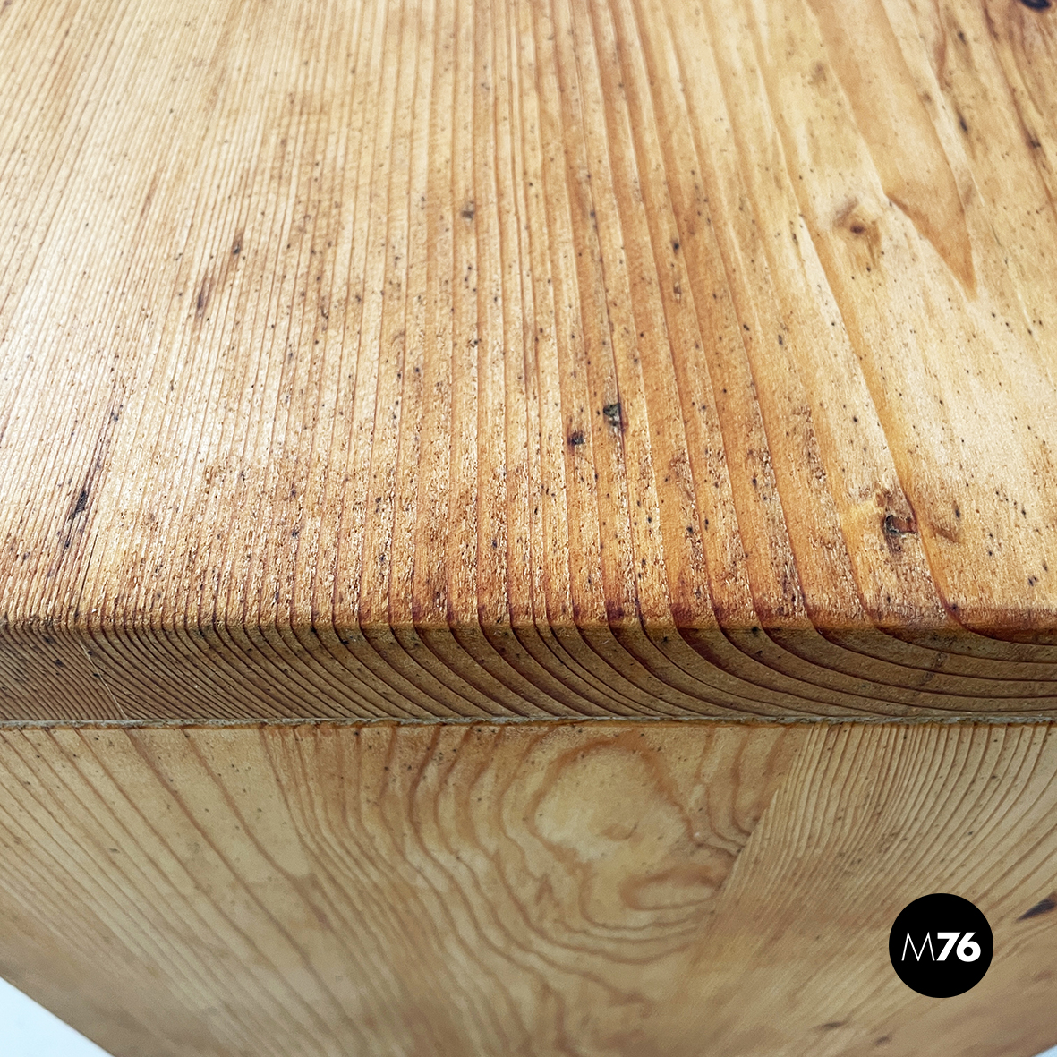 Set di sei sgabelli da tavolo squadrati in legno massello. La seduta rettangolare è sostenuta da due zampe a sezione rettangolare. Piedini tondi in metallo.