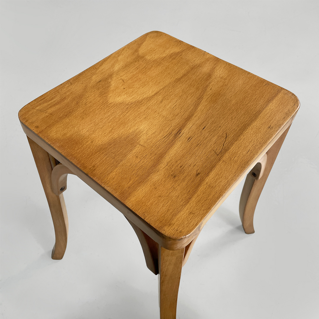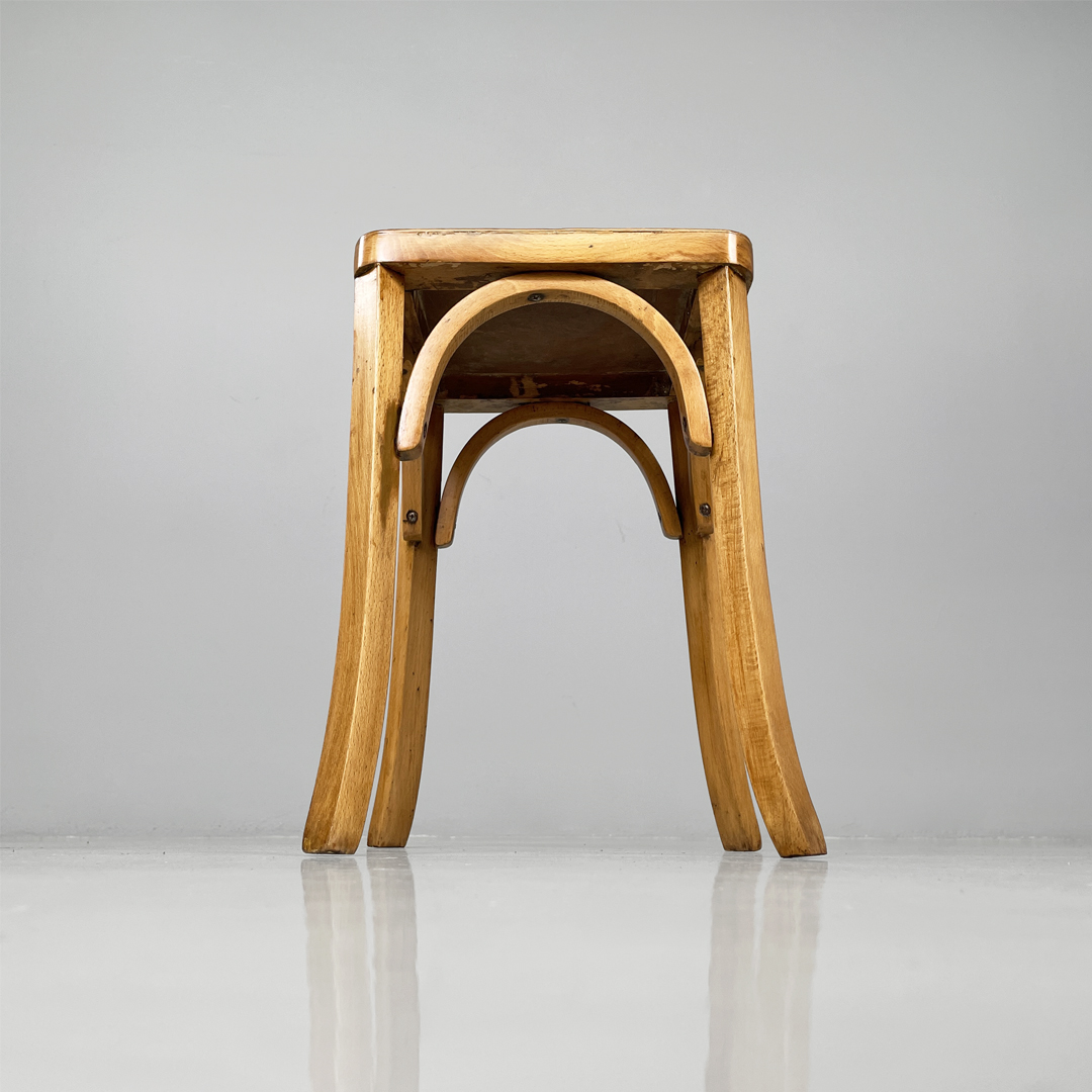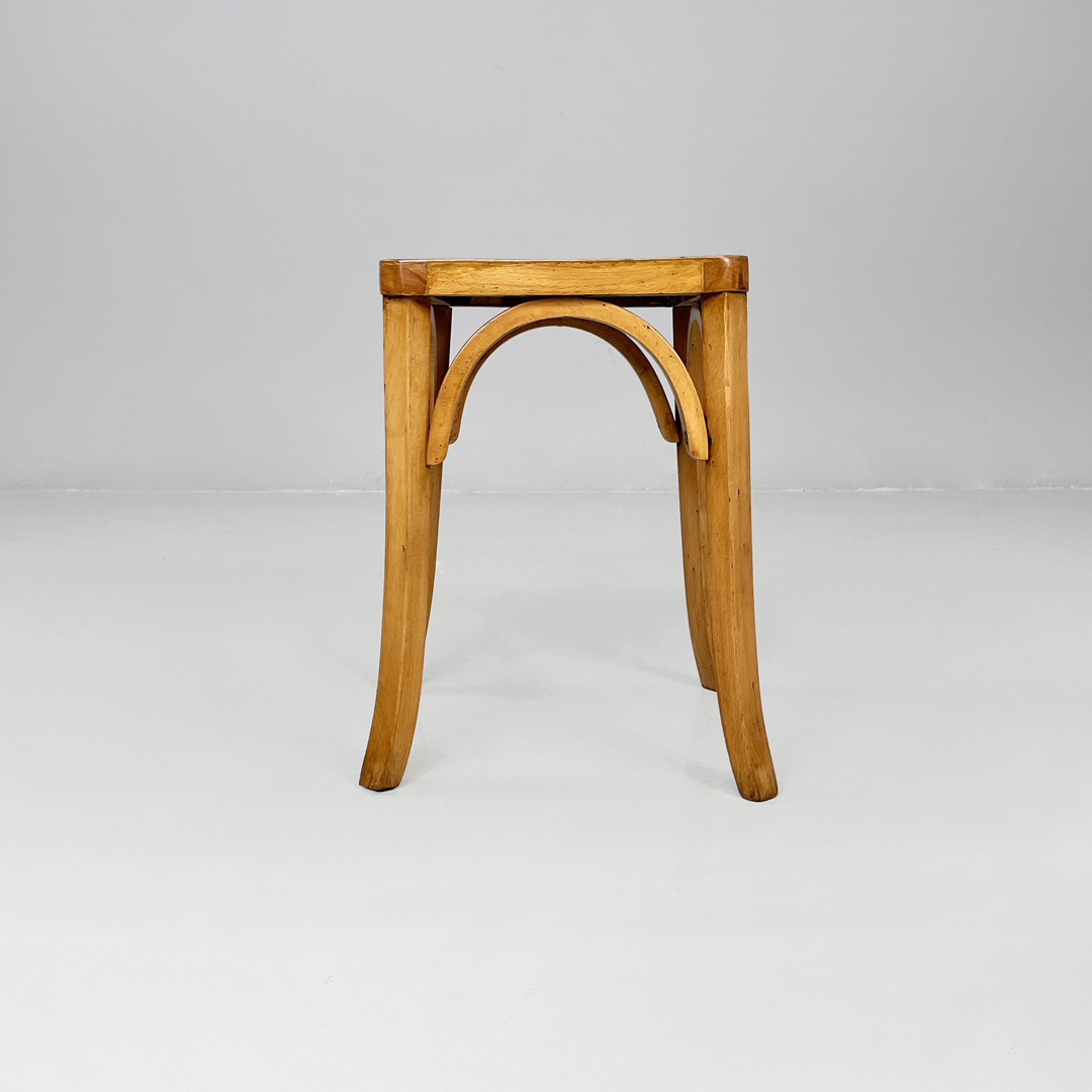 Set di sei sgabelli in legno. La seduta è di forma quadrata con angoli smussati, sotto troviamo degli archi decorativi. Le zampe sono leggermente arcuate verso l’esterno.