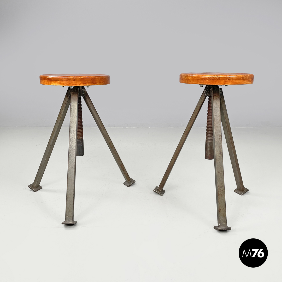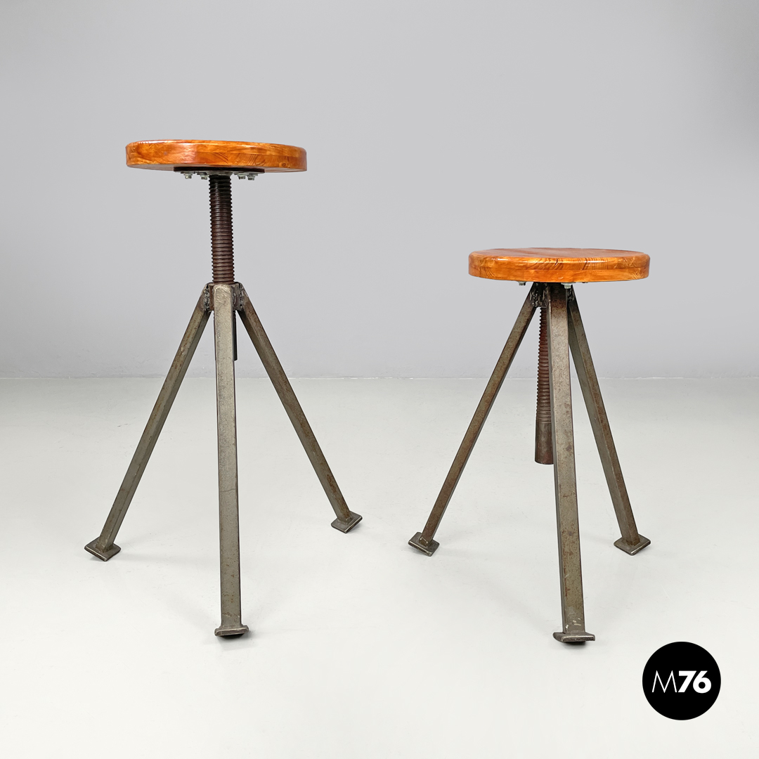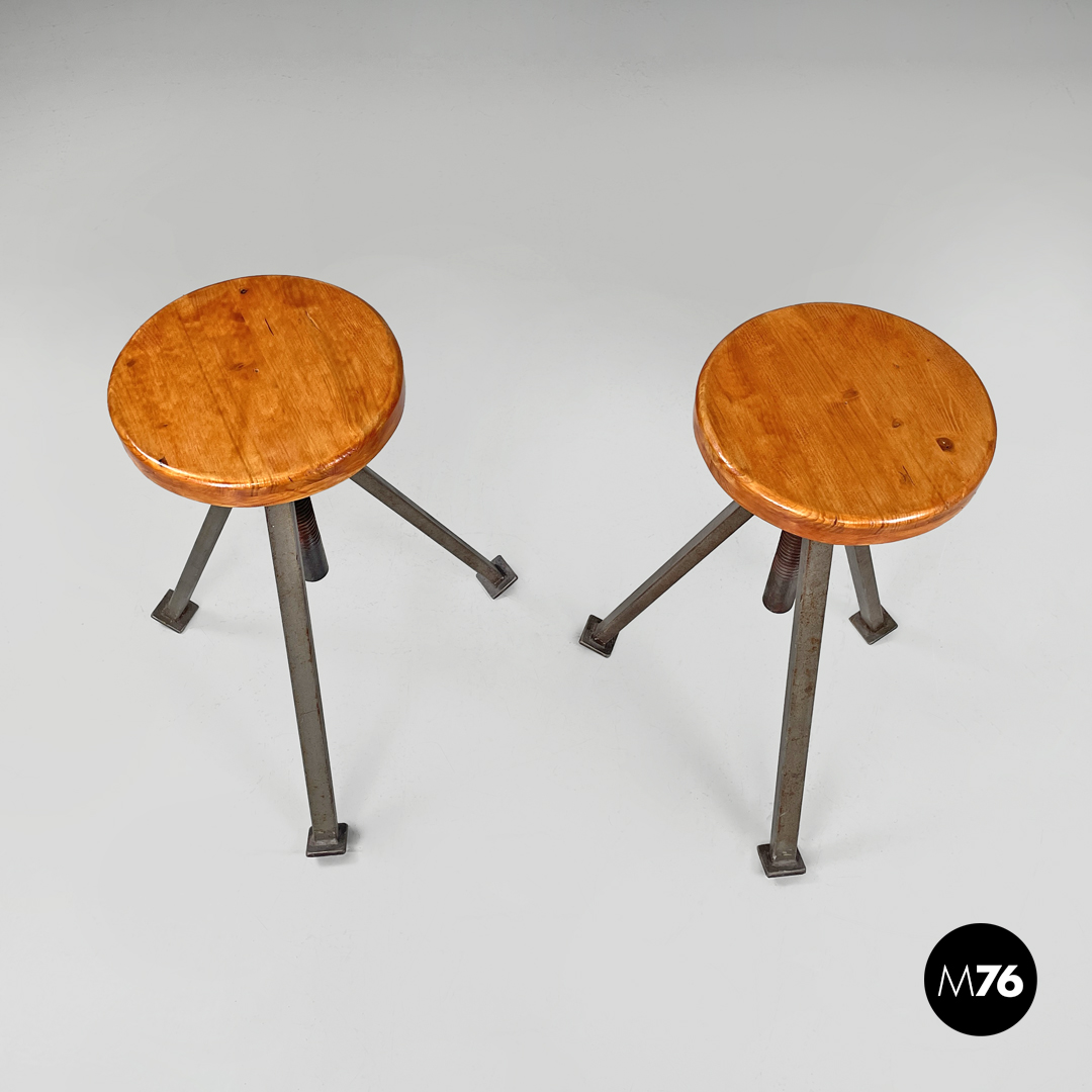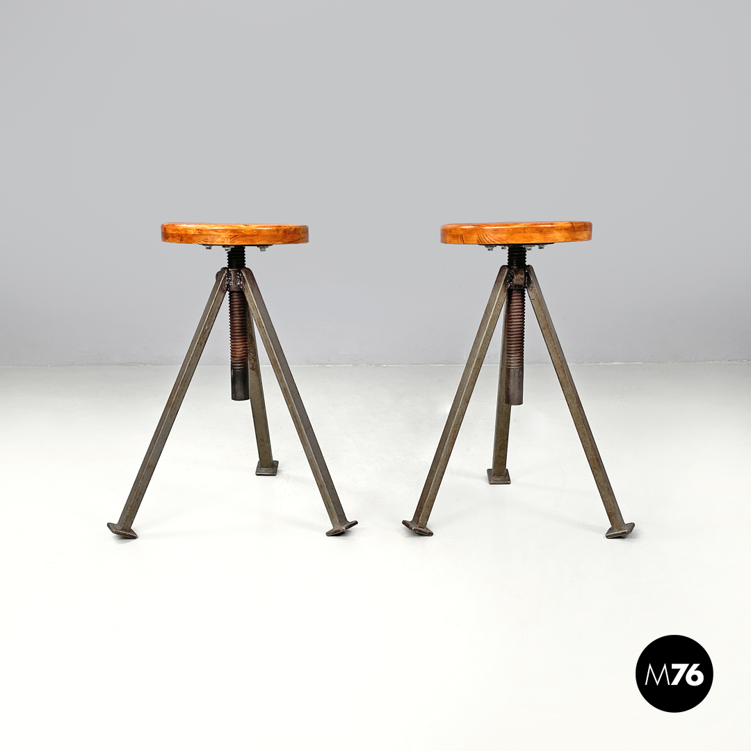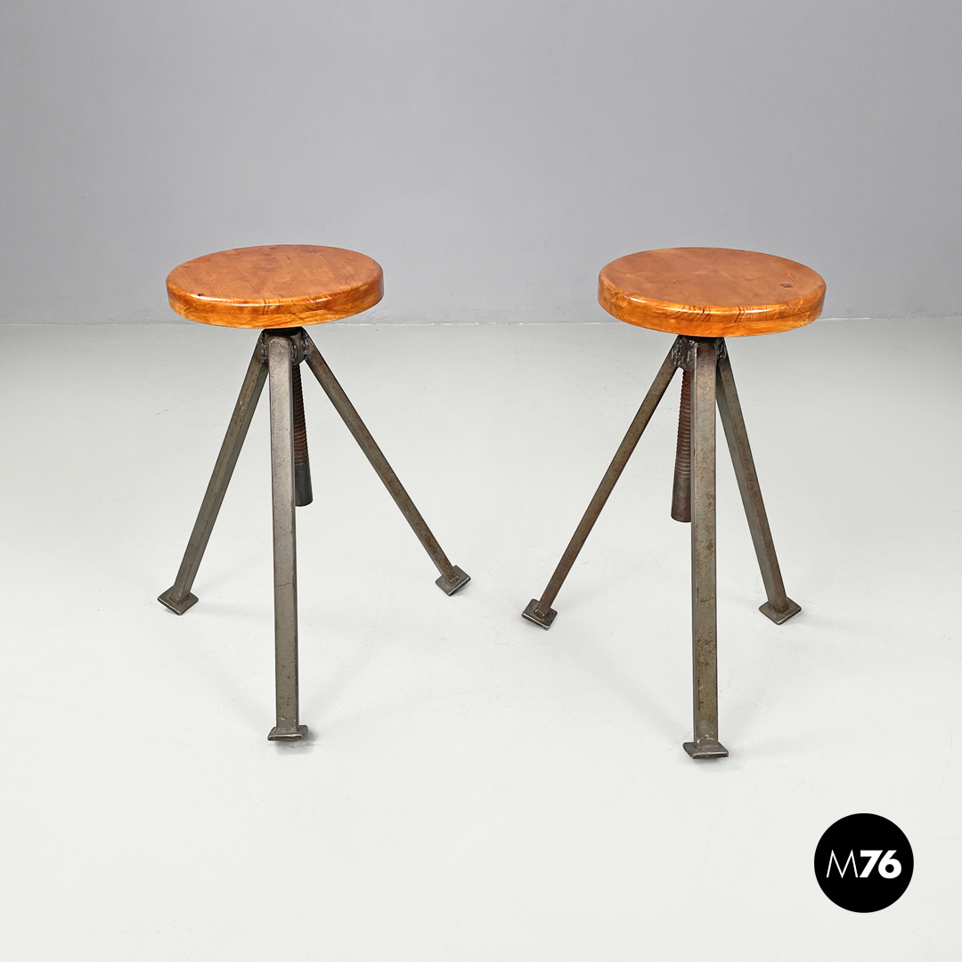 Coppia di sgabelli da bar con seduta tonda girevole in legno. La struttura in metallo è composta da tre zampe che si sviluppano verso l’esterno, con piedino quadrato che poggia diagonalmente a terra.