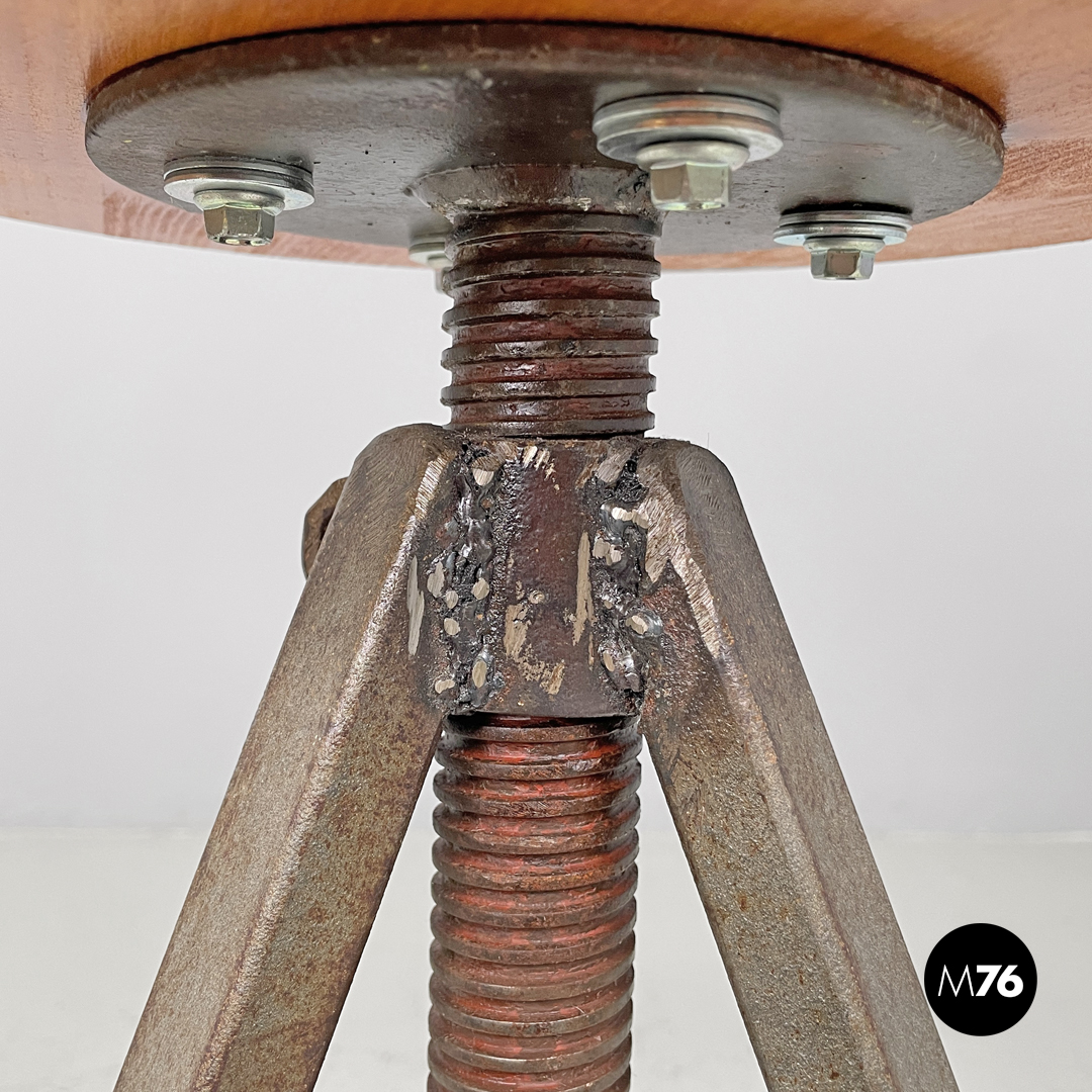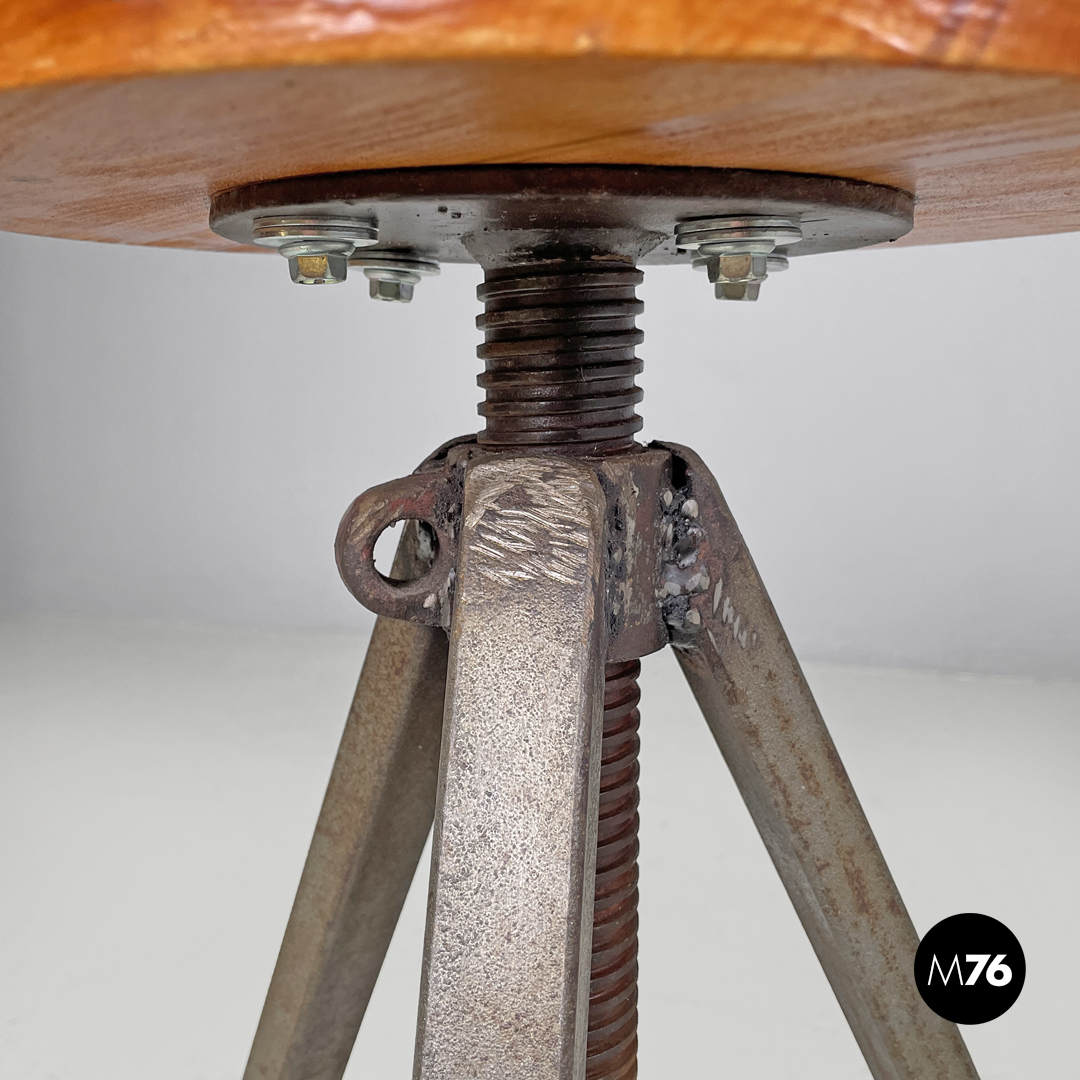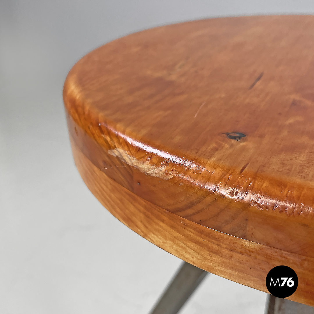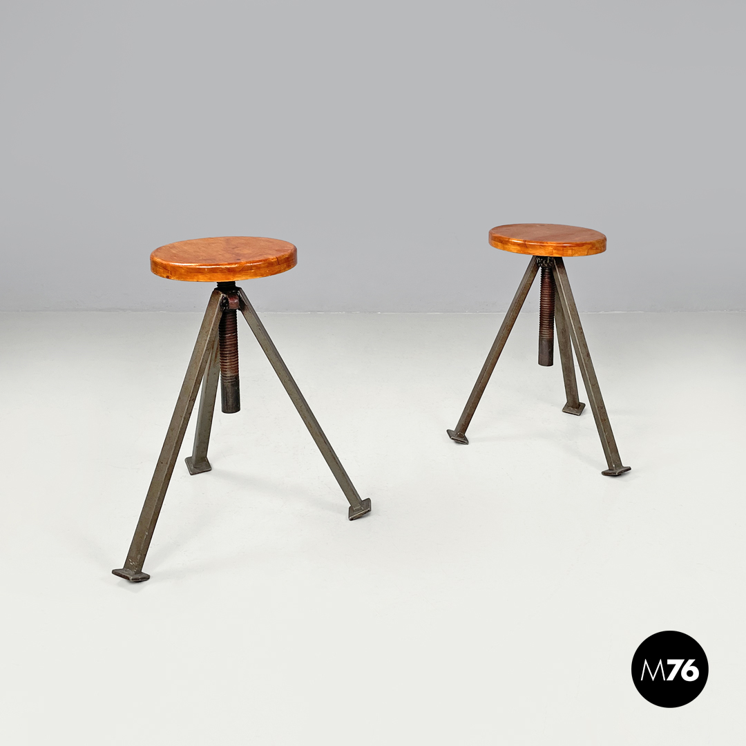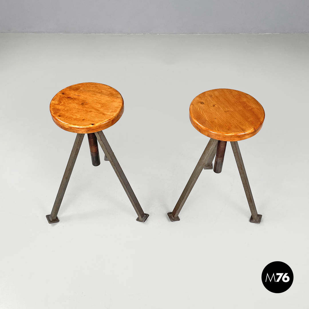 Coppia di sgabelli da bar con seduta tonda girevole in legno. La struttura in metallo è composta da tre zampe che si sviluppano verso l’esterno, con piedino quadrato che poggia diagonalmente a terra.