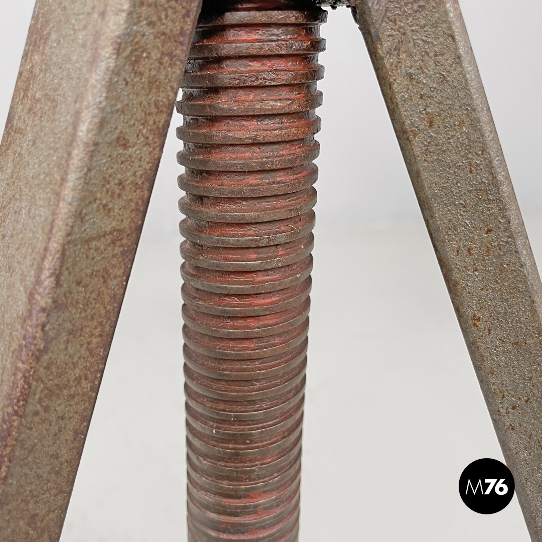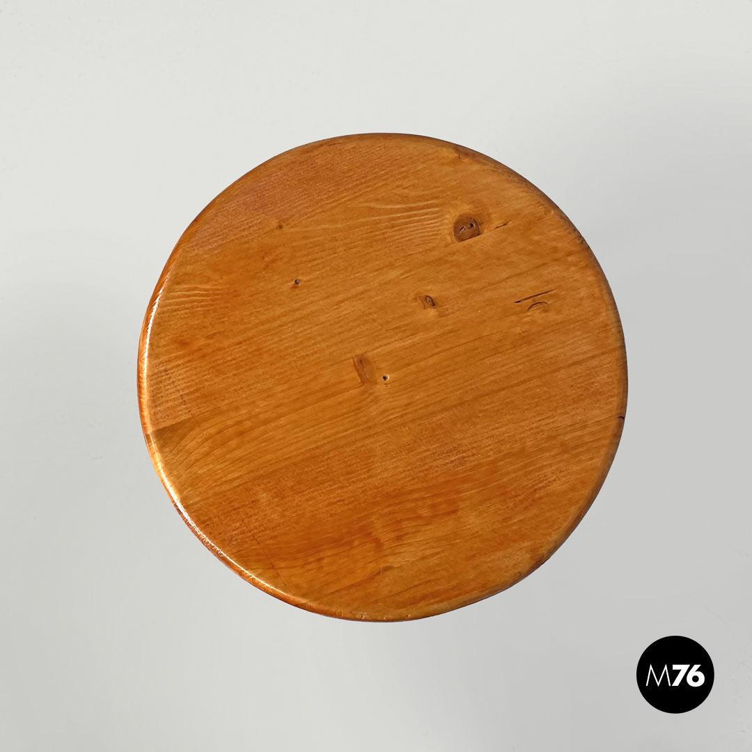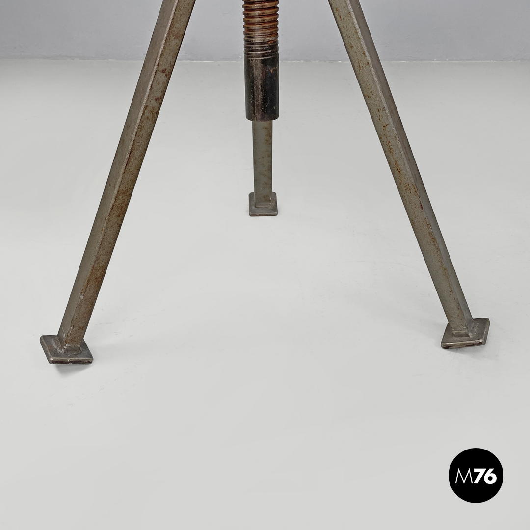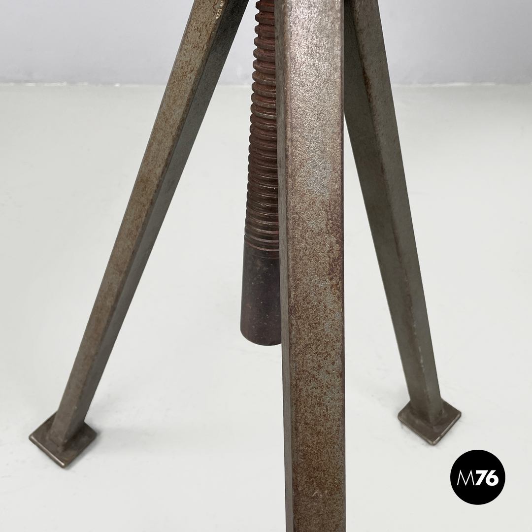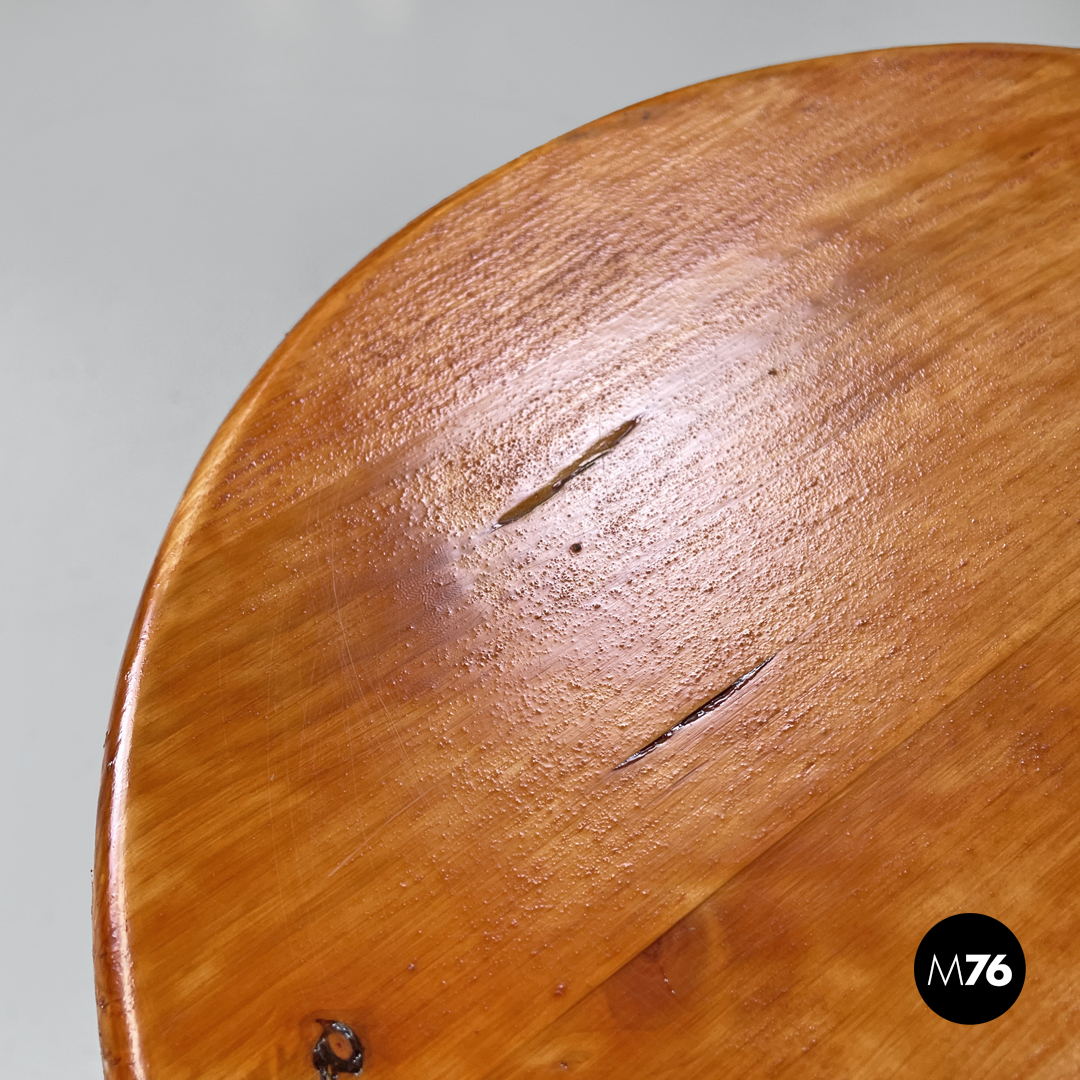 Coppia di sgabelli da bar con seduta tonda girevole in legno. La struttura in metallo è composta da tre zampe che si sviluppano verso l’esterno, con piedino quadrato che poggia diagonalmente a terra.