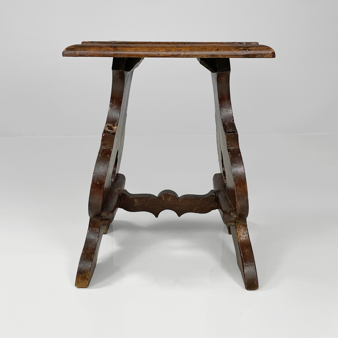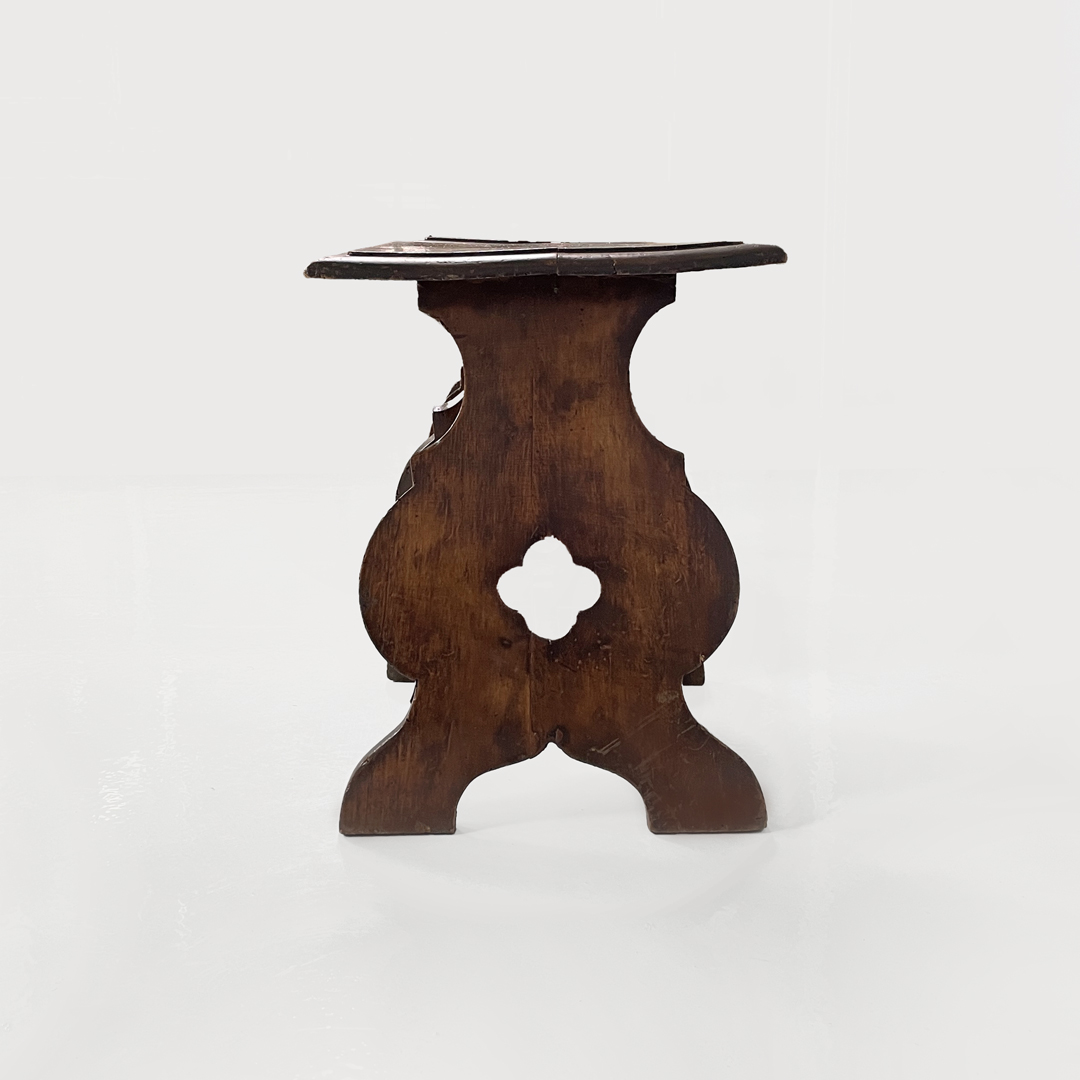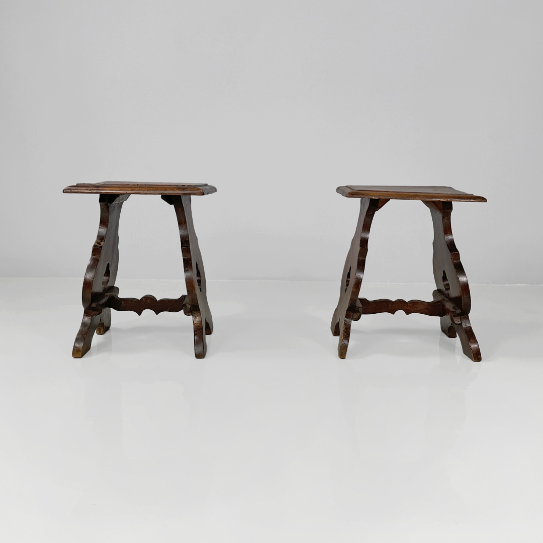 Coppia di sgabelli da tavolo interamente in legno lavorato. Le due gambe laterali presentano profili intagliati e decorati dalle linee tondeggianti con un foro centrale a forma di fiore.